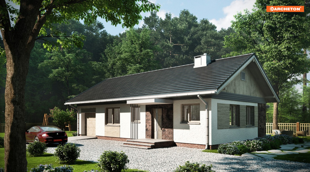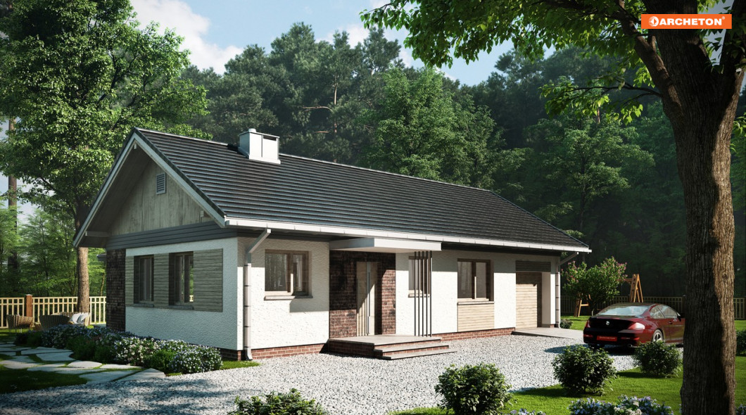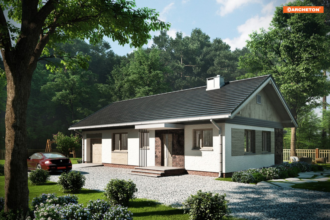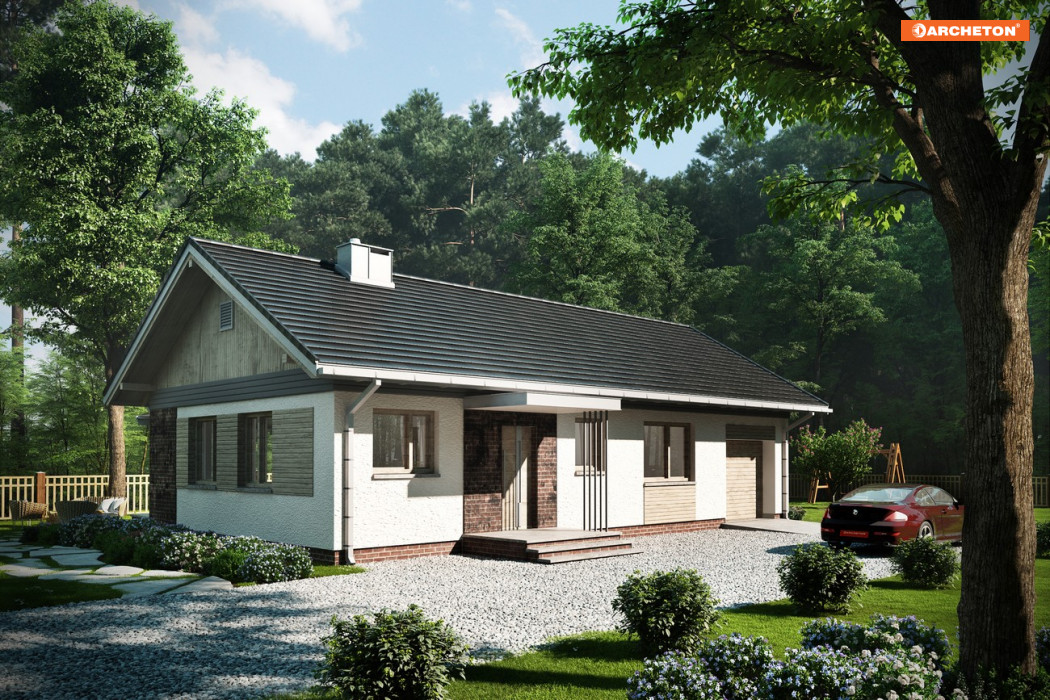 Projekt domu Kubuś G1 to pierwsza z parterowych propozycji Archetonu o powierzchni użytkowej do 80m2 z garażem. Powstał na bazie Kubusia - budynku na planie wydłużonego prostokąta z dwuspadowym, średnio stromym dachem. Obie wersje mieszczą kompaktowe, skromne, ale wygodne mieszkanie dla czteroosobowej rodziny: z otwartą strefą dzienną i z trzema sypialniami położonymi po drugiej stronie wejścia. Powierzchnię wykorzystano maksymalnie, włączając hol do salonu. Projekt domu Kubuś wydłużono, a z przedpokoju strefy nocnej wyprowadzono przejście do części gospodarczej. Łazienka została powiększona o powierzchnię kotłowni, która teraz znalazła się na tyłach garażu.