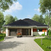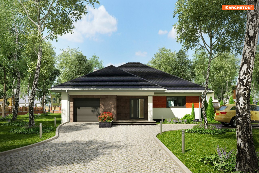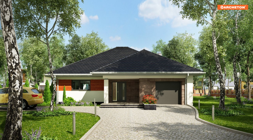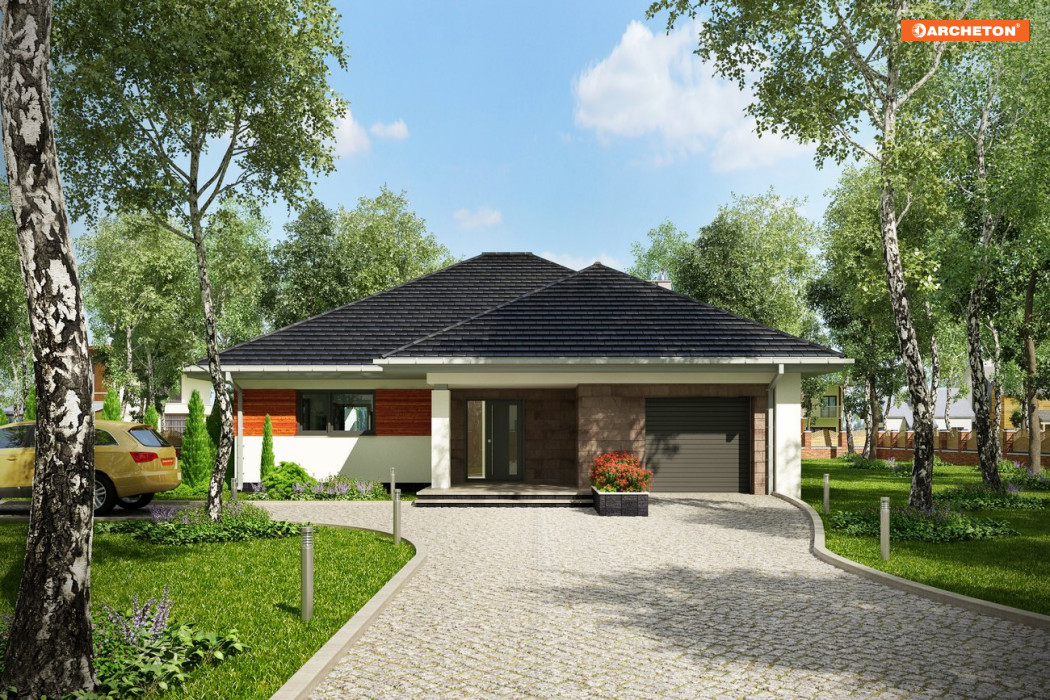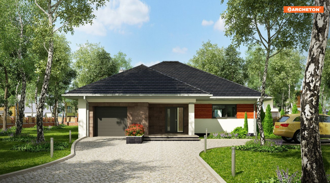 Rozłożysty, wygodny dom parterowy na planie litery T o powierzchni użytkowej 120-130m2, z pojedynczym garażem można wybrać w ofercie Archetonu spośród co najmniej trzech propozycji. Projekt domu Walery ma, podobnie jak Klaudia, bardziej zwarty rzut od domów z rodziny Koniczynki ale łączy go z nimi zróżnicowanie szerokości i, co za tym idzie, wysokości skrzydeł. Wymiary planu Walerego rysują na działce duży prostokąt o proporcjach zbliżonych do kwadratu ale przekrycie z czterospadowych, przenikających się połaci dachu zmniejsza optycznie sylwetkę. Dzięki wnęce wejściowej i ogrodowemu tara-sowi z pergolą na słupie trzy szerokie ramiona budynku miękko i naturalnie wpisują się w otoczenie. Projekt domu Walery centralnie położonym holem łączy trzy strefy funkcjonalne: obszerny pokój dzienny z otwartą kuchnią, część prywatną w głębi parceli i garażową wysuniętą ku frontowi. Osobne wejście z zewnątrz do kotłowni połączonej z pralnią pomaga odseparować reprezentacyjną i rekreacyjna część ogrodu od gospodarczej przy wjeździe na posesję.