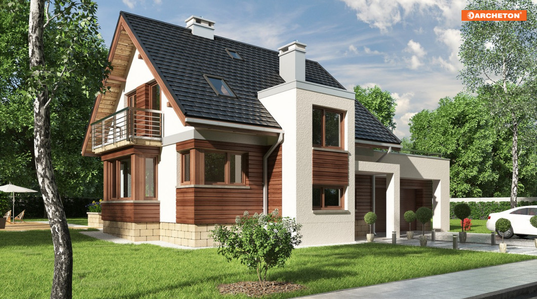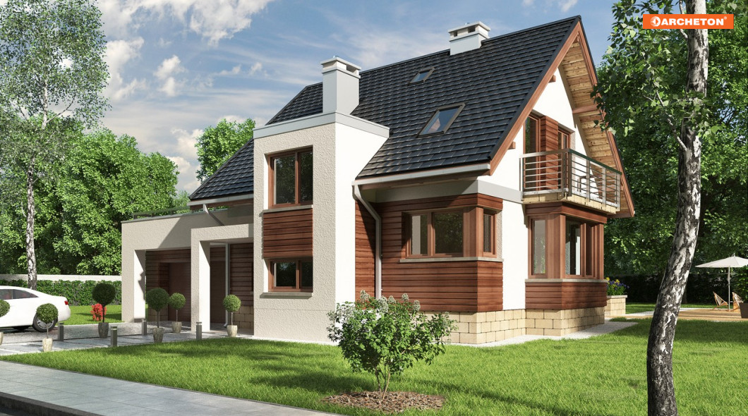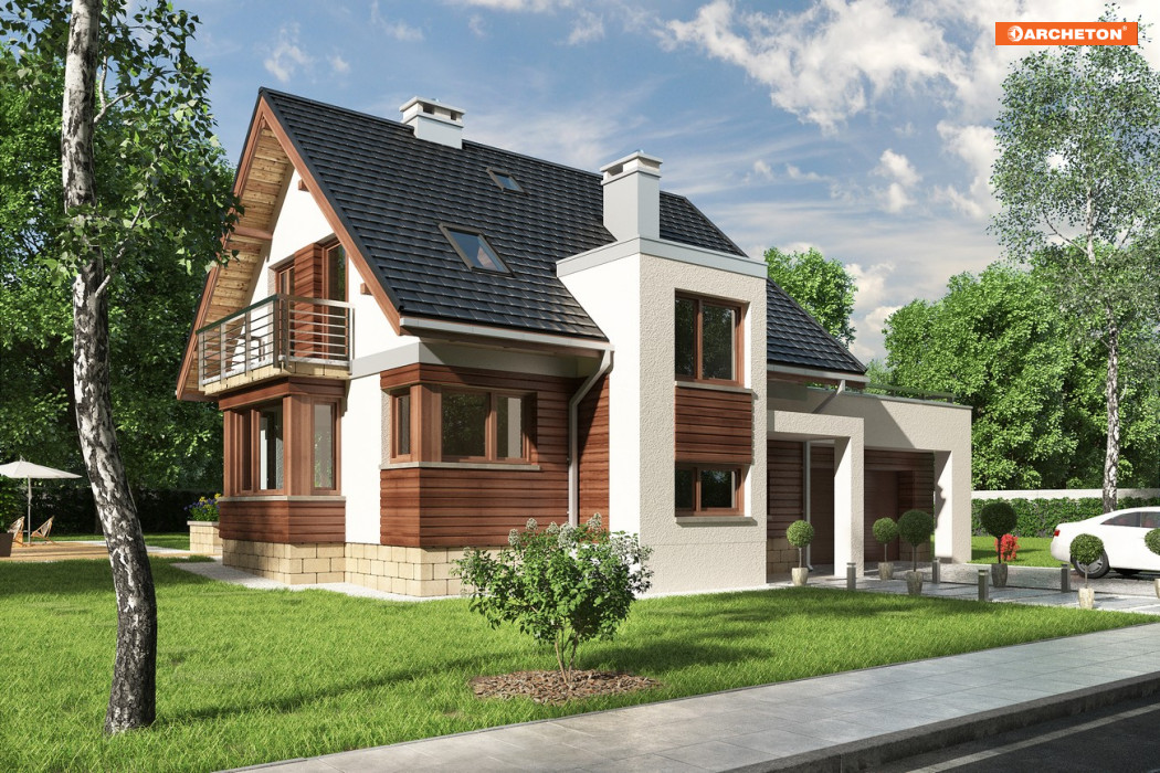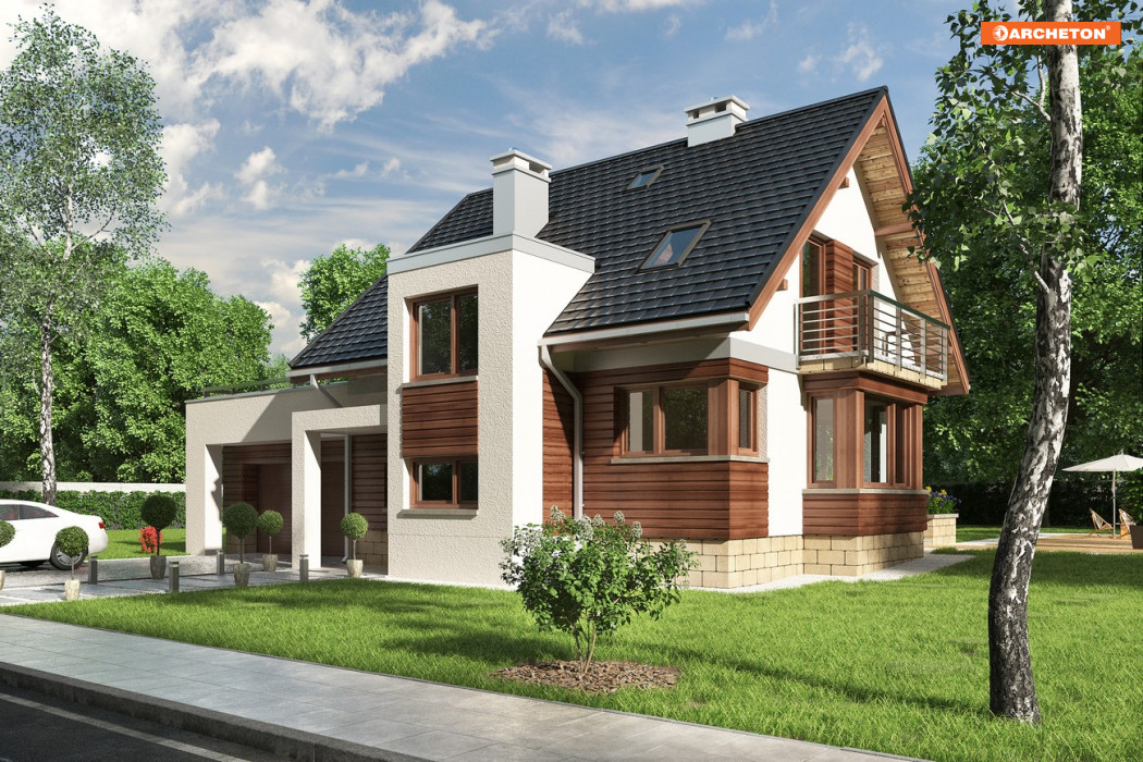 Mały dom z użytkowym poddaszem, na działce z lekkim pochyleniem ku wjazdowi, ma w Archetonie kilka odsłon (np. tradycyjne w sylwetkach i detalu: Krab czy Fiona). Projekt domu Mirona G2 wyróżnia najbardziej awangardowy styl w grupie propozycji z dodatkowym pokojem na parterze, o powierzchni 100-120m2. Razem z siostrzanymi rozwiązaniami: bez garażu (projekt Mirona Solo) i z pojedynczym garażem (projekt Mirona) tworzy rodzinę. Strefa wejściowa Mirony, z sienią, kotłownią i z garażem, jest we wszystkich wariantach obniżona w stosunku do strefy dziennej na głównym poziomie parteru. Poddasze mieści trzy sypialnie z dużą łazienką, niżej przewidziano spocznik z pralnią. Ten układ przekryto prostym, dwuspadowym dachem. O nawiązującym do modernizmu szyku budynku decydują kostki garażu i ryzalitów: z jadalnią - w ścianie bocznej oraz wejściowy. Charakterystycznym detalem jest też pełna, balustrada tarasu nadwieszona na słupie, stanowiąca osłonę wjazdu i wyjścia z garażu oraz podobny element nad drzwiami frontowymi. W kompozycji z tradycyjną sylwetką budynku plasują one projekt domu Mirona G2 wśród rozwiązań łączących sprawdzoną konwencję z nowoczesnością.