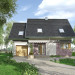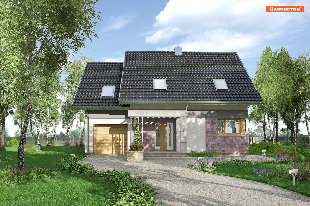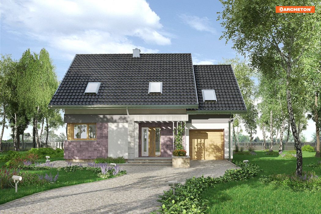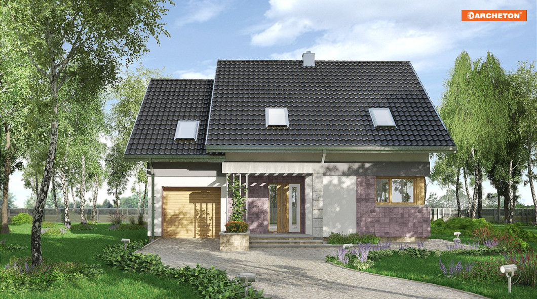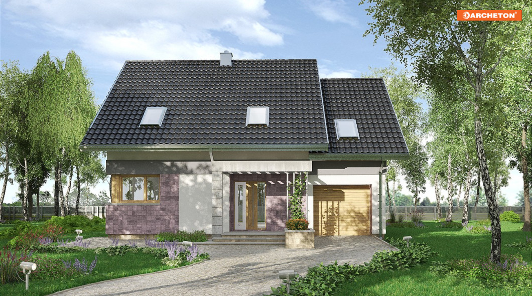 W grupie domów z użytkowym poddaszem i pojedynczym garażem o powierzchni ok 120m2 p.u. projekt domu Świetlik oferuje bryłę bez lukarn w dachu i bez balkonów. Konsekwentnie energooszczędne rozwiązania zaproponowano wraz z tanim, dwuspadowym dachem nad częścią mieszkalną i gospodarczą. Łączy je wspólne lico ściany garażowej i wnęki głównego wejścia do budynku. Większą część parteru między frontem a ogrodem zajmuje otwarty pokój dzienny. Pozostałą – oszczędnie ale wygodnie zaprojektowana strefa wejściowa z łazienką, niewielkim gabinetem oraz komunikacja. Obie, w centrum rzutu łączy kominek. Komfortowa, jak na dom tej wielkości, jest kuchnia z wyspą oraz pokoje głównego poziomu poddasza. Projektant zaproponował tu jeszcze, oprócz obszernej łazienki, w jednym z mniejszych pomieszczeń pralnię. To wyróżnia projekt domu Świetlik od podobnych rozwiązań, w których dodawano lukarnę, aby powiększyć przestrzeń użytkową pod skosem dachu. Wybór ma rzecz komfortu, mniejszej ilości foremnych sypialni i ograniczenia strat ciepła rysuje się też w sylwetce. Jest prostsza, urozmaicona jedynie narożnymi oknami i pergolami akcentującymi wejścia.
