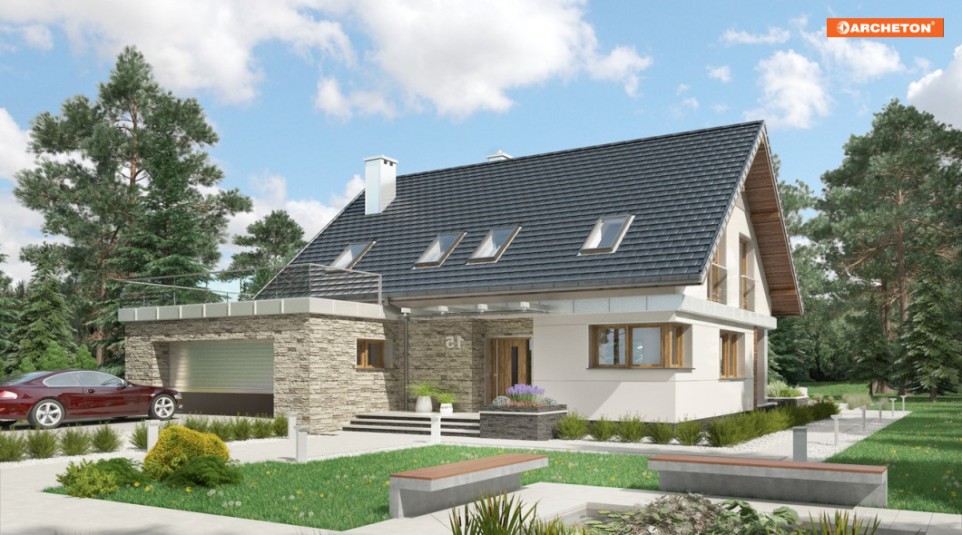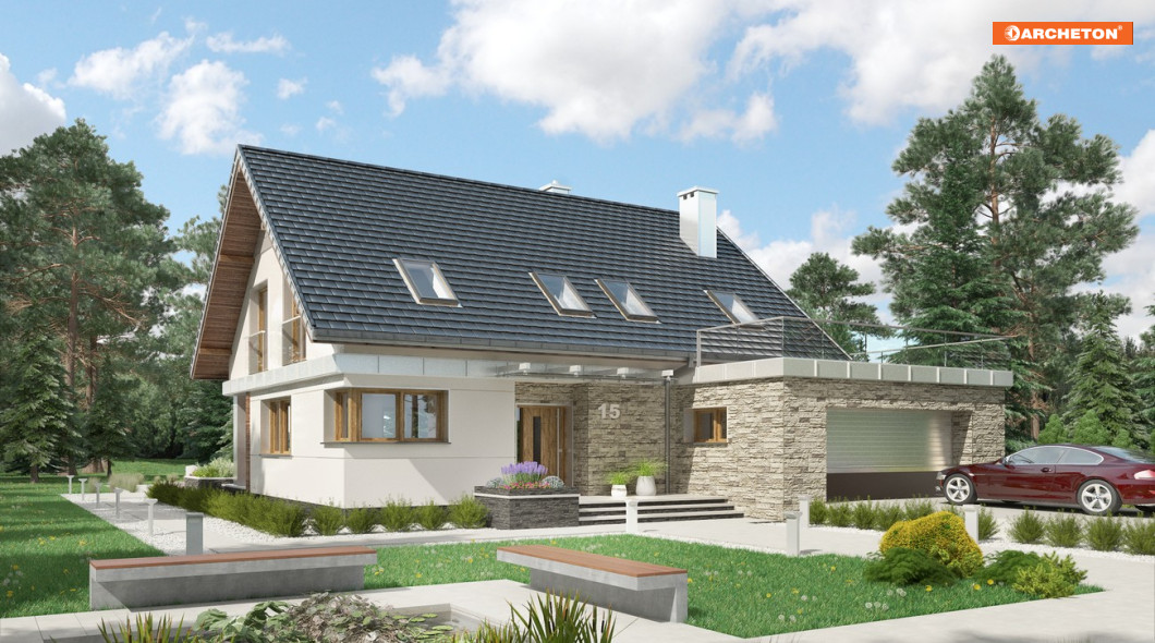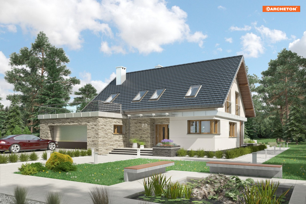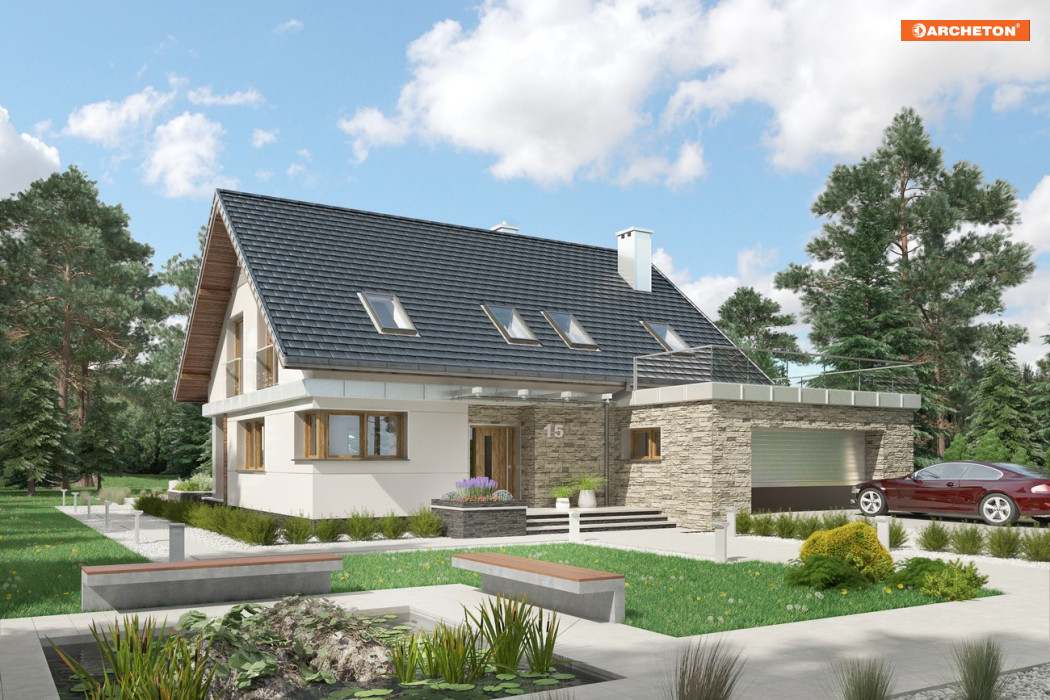 W projektach z rodziny Zenona uwagę zwraca ciekawe przekrycie bryły, zbudowanej na planie litery L . Dwuspadowy dach z kalenicą równoległą do drogi dojazdowej zamyka mieszkanie, a pod okap wsunięta jest od wjazdu parterowa kostka z dwustanowiskowym garażem. We wszystkich wersjach elementy te obejmują frontowy taras, tworząc wejściową wnękę. Projekt domu Zenon Polo ma w rodzinie najmniejszą powierzchnię, choć pokój dzienny nadal imponuje rozmiarami. Dzięki schodom położonym (jak w większym wariancie Rex i inaczej niż w Zenonie i w Zenonie Atu) przy garażu, otwiera się on od razu z holu. Pozostałą powierzchnię parteru podobnie, jak w pozostałych wersjach, zajmują: kuchnia przy salonie, dodatkowy pokój na uboczu, łazienka i kotłownia. Na jednopoziomowym poddaszu rozlokowano trzy ustawne, duże sypialnie i komfortową łazienkę. Projekt domu Zenon Polo proponuje, jako jedyny w rodzinie, podkreślenie prestiżu głównej sypialni wyjściem na rozległy taras nad garażem. Kształt i wielkość tarasu daje widok obejmujący niemal całość posesji. Narożne okna i kontrastowe wykończenie obu części sylwetki rozwiązano w sposób charakterystyczny dla całej rodziny Zenona.