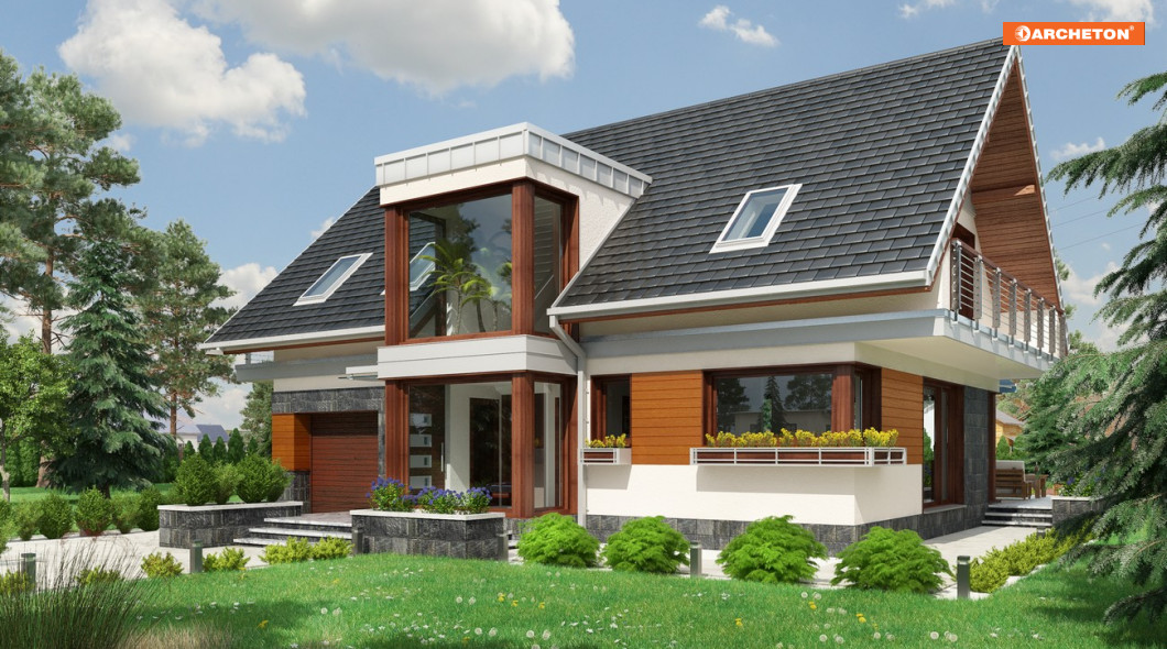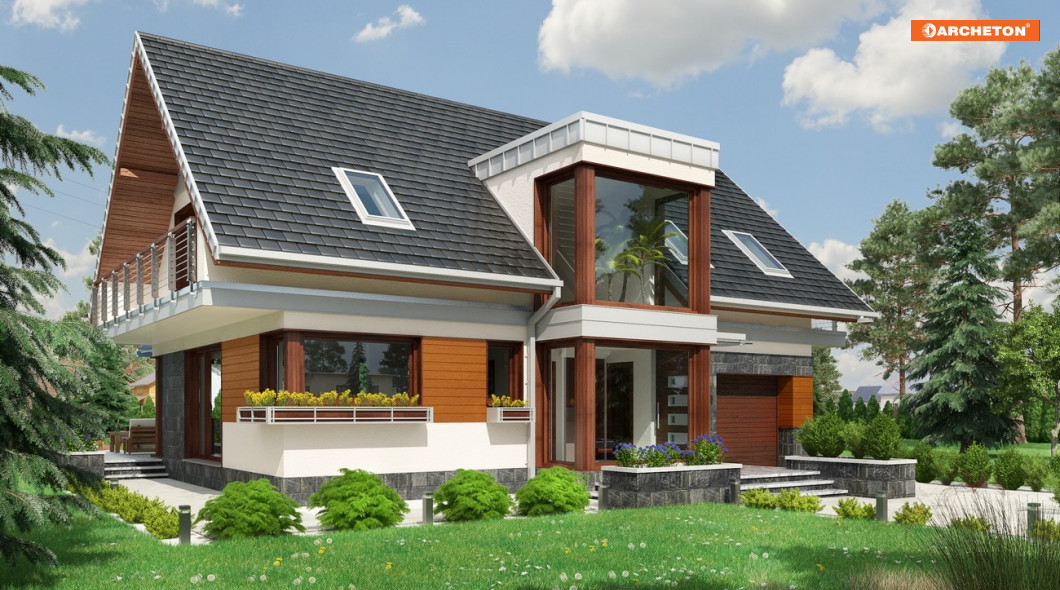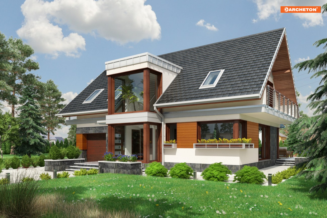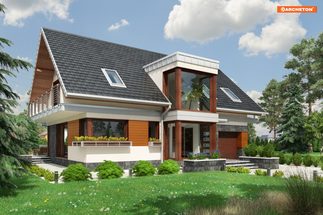 Projekty domów z rodziny Kalipso wyróżniają wysokie przeszklone ryzality w elewacji frontowej i ogrodowej. Elementy te oddzielają w parterze część mieszkalną od gospodarczej, a na poddaszu przechodzą w płaskie lukarny. Pod okapami ścian szczytowych ciągną się długie loggie, a ich balustrady potęgują w bryle efekt kontrastu w zestawieniu linii poziomych i pionowych. Najmniejsza z wersji – projekt domu Kalipso G1 zachowując te charakterystyczne cechy sylwetki oraz zasadniczy układ funkcjonalny proponuje najmniejszą powierzchnię użytkową. Garaż jest pojedynczy ale obszerny, z dużą kotłownią i praktyczną wnęką przy sieni Pokój dzienny ma wygodne miejsce na jadalnię i aneks kominkowy, a kuchnia jest spora choć bez spiżarni, jak w większych wariantach. Otwartą antresolę w ryzalicie projekt domu Kalipso G1 proponuje zabudować i przeznaczyć na gabinet. Dzięki temu ilość pomieszczeń strefy nocnej jest taka sama we wszystkich wersjach rodziny. Pomieszczenia, wpisane są w logiczny układ konstrukcyjny, mają foremne proporcje, a sypialnie dużo wolnej przestrzeni dzięki wbudowanym, niewidocznym szafom.