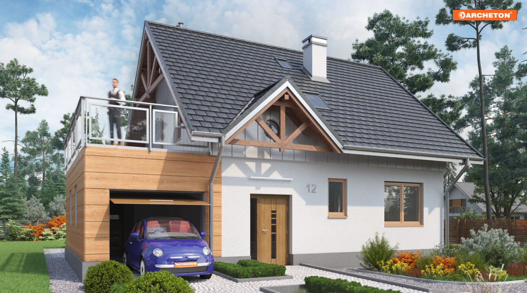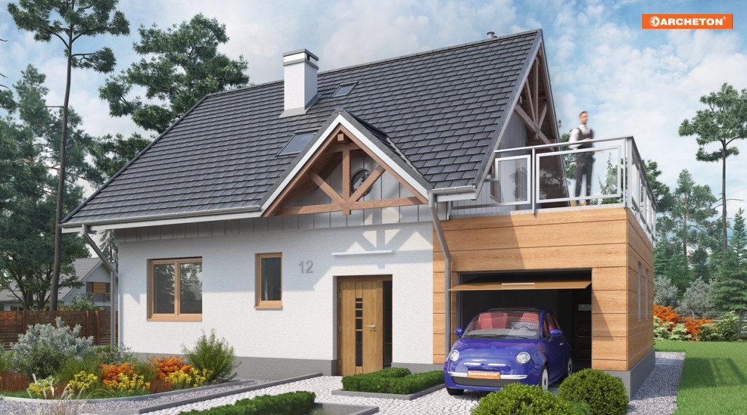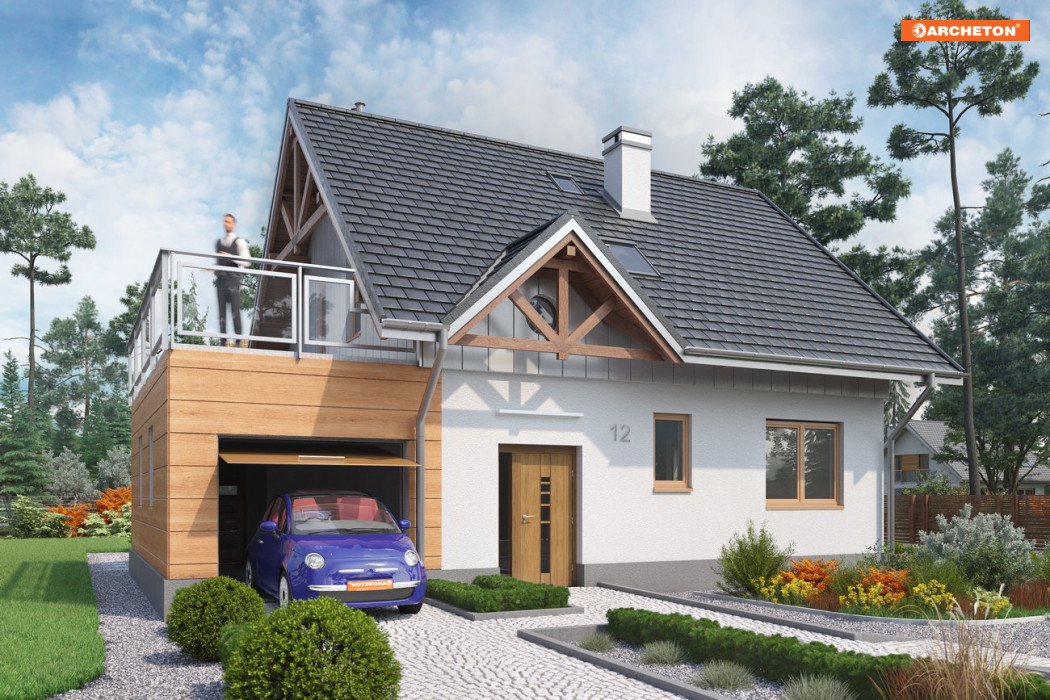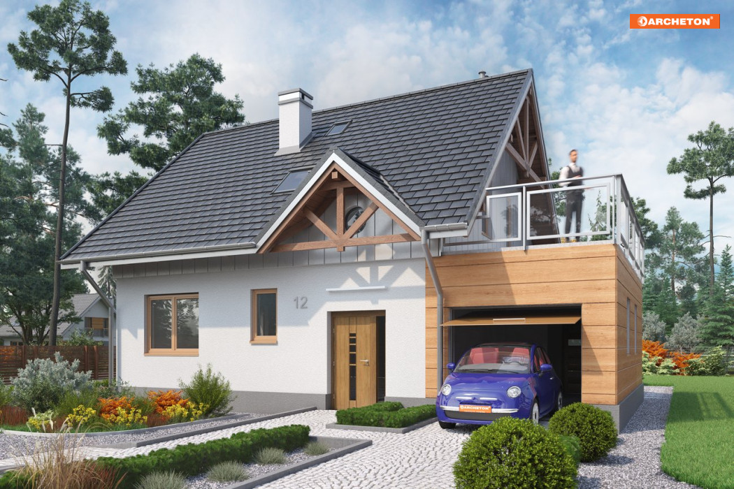 Budynek przeznaczony jest dla 4-osobowej rodziny. Na parterze zlokalizowano pokój dzienny, kuchnię, spiżarnię, hol, w.c. oraz sień ze schowkiem pod schodami. Garaż dostępny jest z sieni, a z garażu można dostać się do pomieszczenia gospodarczego. Na poddaszu znajdują się 3 sypialnie i łazienka. Jeśli w planach mamy budowę małego domu parterowego z użytkowym poddaszem i dobudowanym garażem, a przy tym marzy nam się wyjście w letni poranek z sypialni na taras, to projekt domu Brzask, Amelia100 i Figa Neo spełnią te oczekiwania. Wśród nich Brzask wyróżnia największy salon ale przy tym brak dodatkowego pokoju na parterze. Wszystkie propozycje mają zwarty, zbliżony do kwadratu rzut części mieszkalnej i niedrogi dwuspadowy dach z kalenicą równoległą do drogi dojazdowej. Zarys ścian zewnętrznych w projekcie domu Brzask jest najbardziej zdyscyplinowany i energooszczędny, bez balkonów. Kotłownię ulokowano za garażem, a przy bardzo dużej kuchni przewidziano zgrabny układ spiżarni i niewielkiej łazienki. Program strefy nocnej to trzy wygodne sypialnie dla czterech osób i przestronna łazienka – wszystkie pomieszczenia doświetlono ekonomicznie bez użycia lukarn. Frontowe wejście akcentuje trójkątny daszek w okapie odsłaniający dostęp światła dla okienka nad spocznikiem schodów. Wyjątkowym rozwiązaniem jest zlicowanie ściany frontowej części głównej i garażowej, co wydłuża elewację horyzontalnie i nadaje jej mniej tradycyjny charakter.