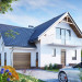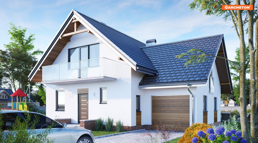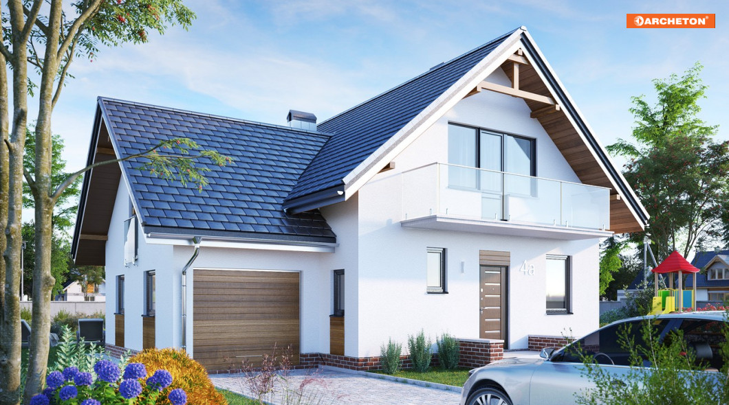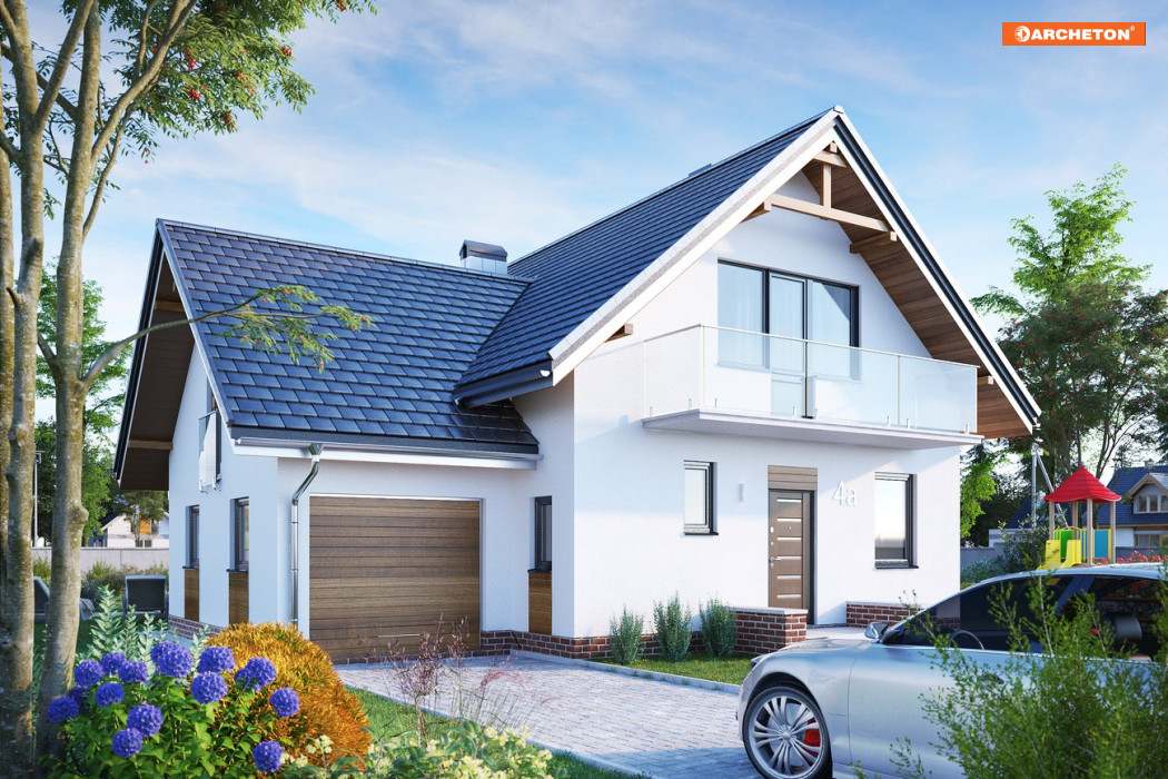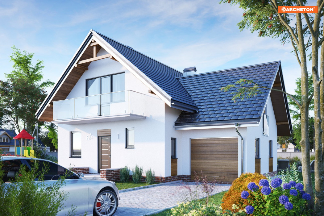 Przez sień wchodzimy do holu. Na prawo dostępna jest kuchnia i jadalnia, na lewo - łazienka, a ponadto z korytarza - schowek i garaż. Na wprost idziemy do pokoju dziennego, mijając klatkę schodową prowadzącą na poddasze i do piwnicy, w której zlokalizowano kotłownię i 2 pomieszczenia gospodarcze. Z półpiętra dostępny jest pokój nad garażem. Na poddaszu znajdują się 3 pokoje, łazienka i garderoba. Stosunkowo niewielki, lecz przestronny dom przeznaczony dla 5-6 osobowej rodziny. Urozmaicona bryła z przenikającymi się dachami dwuspadowymi, wzbogacona balkonami.