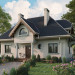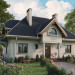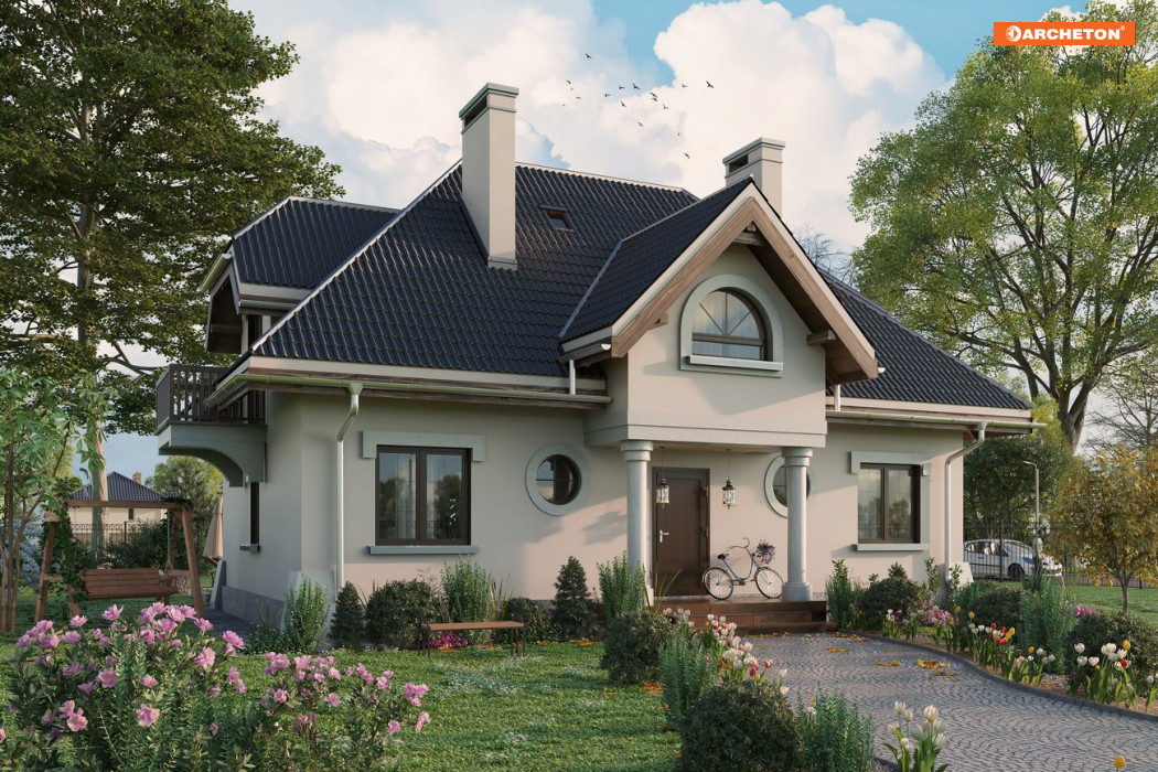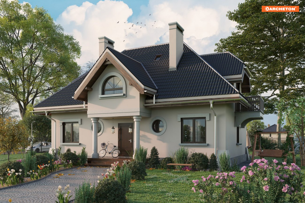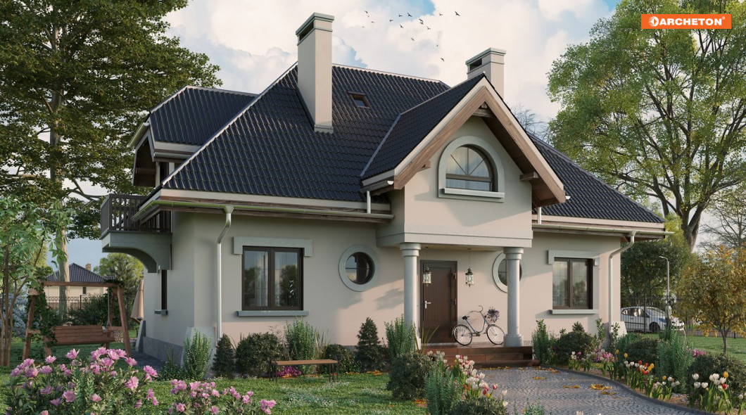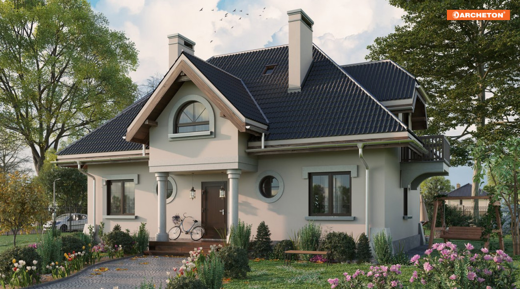 Otwarte przestrzennie wnętrze parteru mieści pokój dzienny z aneksem, obszerną kuchnię z jadalnią oraz dostępny z holu dodatkowy pokój, łazienkę i pomieszczenie gospodarcze. W kondygnacji piwnic znajduje się kotłownia/pralnia oraz 2 pomieszczenia gospodarcze. Na poddaszu umiejscowiono 3 pokoje, łazienkę, w.c. oraz schowek. Okazałą bryłę budynku utworzył prostopadłościan rozbudowany wysuniętą bryłą pokoju dziennego oraz opartym na kolumnach podcieniem wejściowym. Budynek nakryty jest wielospadowym dachem o kącie nachylenia połaci 45° wzbogaconym lukarnami. Dodatkowego uroku dodają masywne balkony i mocno rysująca się podmurówka.