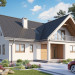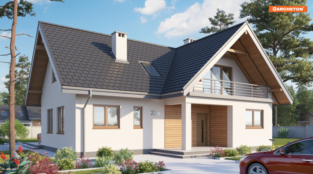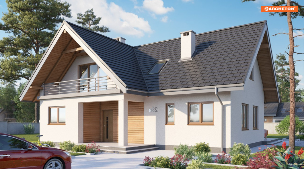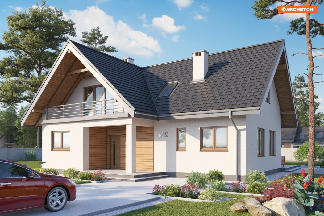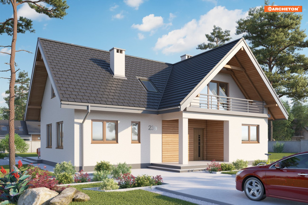 Dom dla rodziny dwupokoleniowej. Na parterze część dzienna oraz małe, dodatkowe mieszkanie. W częściowym podpiwniczeniu mieści się kotłownia i pralnia. Na poddaszu zaprojektowano trzy wygodne sypialnie, garderobę i dwie łazienki. Dom ma prostą bryłę opartą na literze"T" oraz dach dwuspadowy o nachyelniu połaci 42°. Od frontu domku zaakcentowane podcieniem wejście, na poddaszu przestronna loggia. Od strony ogrodowej jest taras z ażurowym zadaszeniem - pergolą.