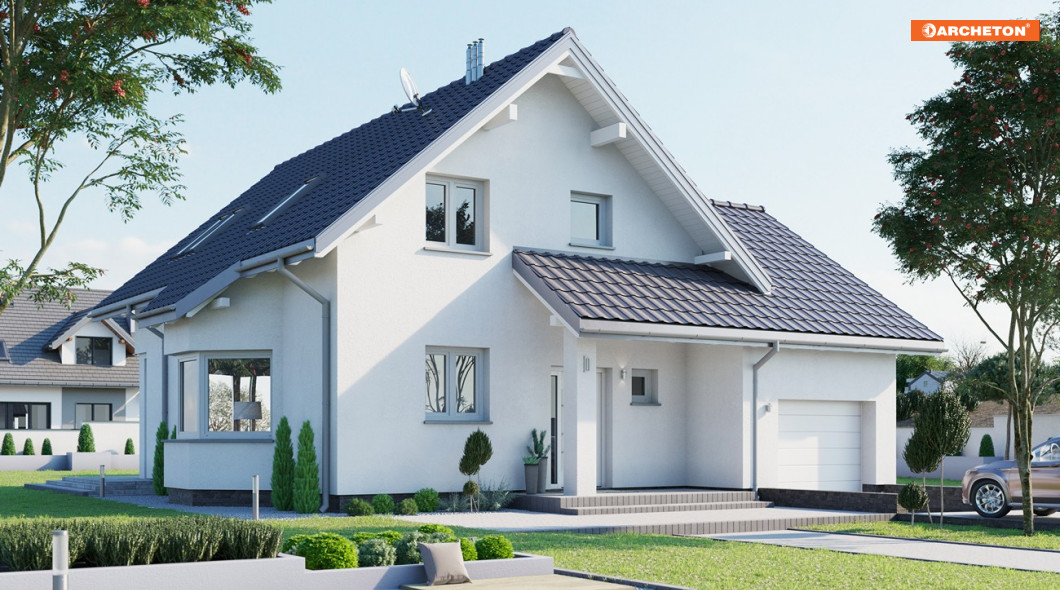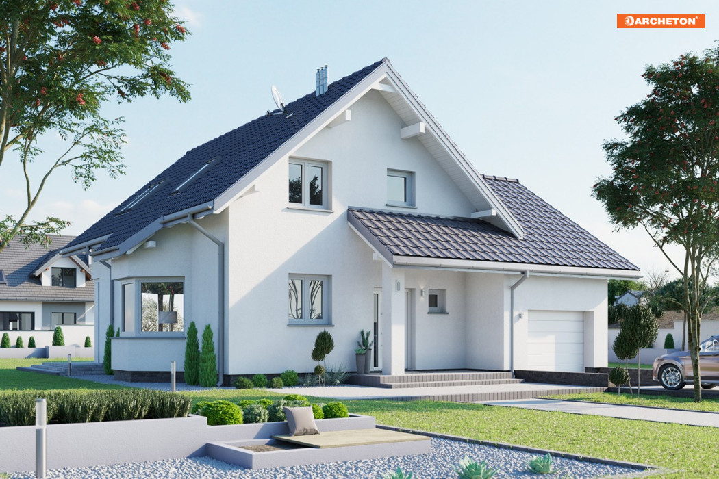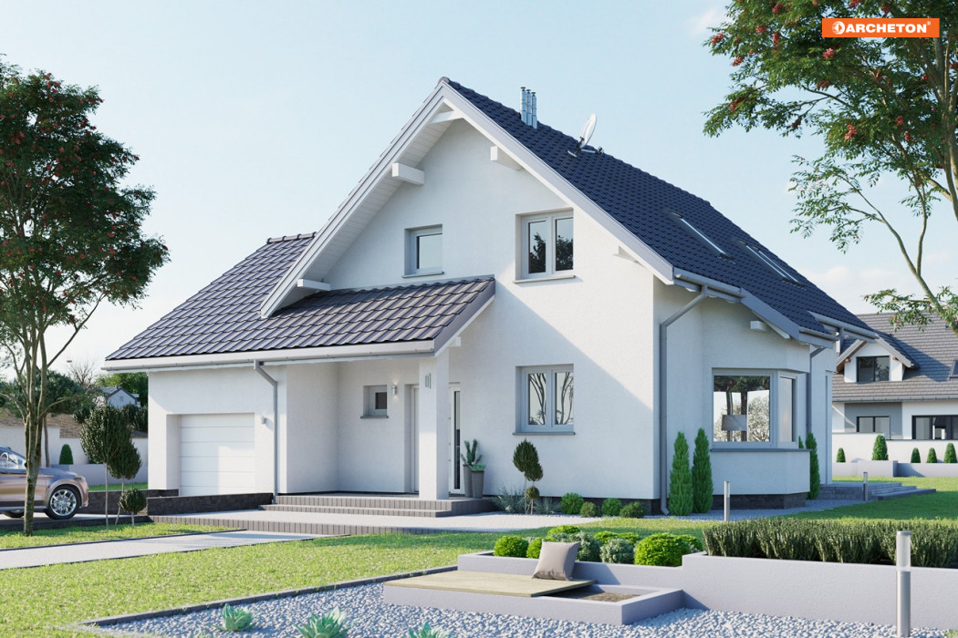 Wygodny dom dla 4-6 osobowej rodziny. Na parterze znajduje się kuchnia z jadalnią, pokój dzienny, łazienka oraz garaż i kotłownia dostępna również z zewnątrz. Na poddaszu są 4 sypialnie (jedna ze schowkiem, dostępna ze spocznika) oraz duża łazienka. W urozmaiconej bryle wyróżnione zostało wejście, podcień tarasu z balkonami do sypialń na poddaszu. Dach jest dwuspadowy o spadkach nachylenia połaci: 40° i 33°. Kuchnia doświetlona przeszklonym ryzalitem co uatrakcyjnia jednoprzestrzenny parter.