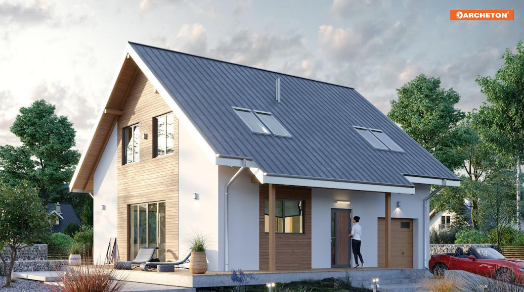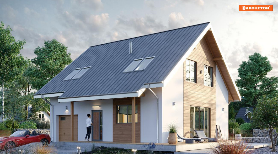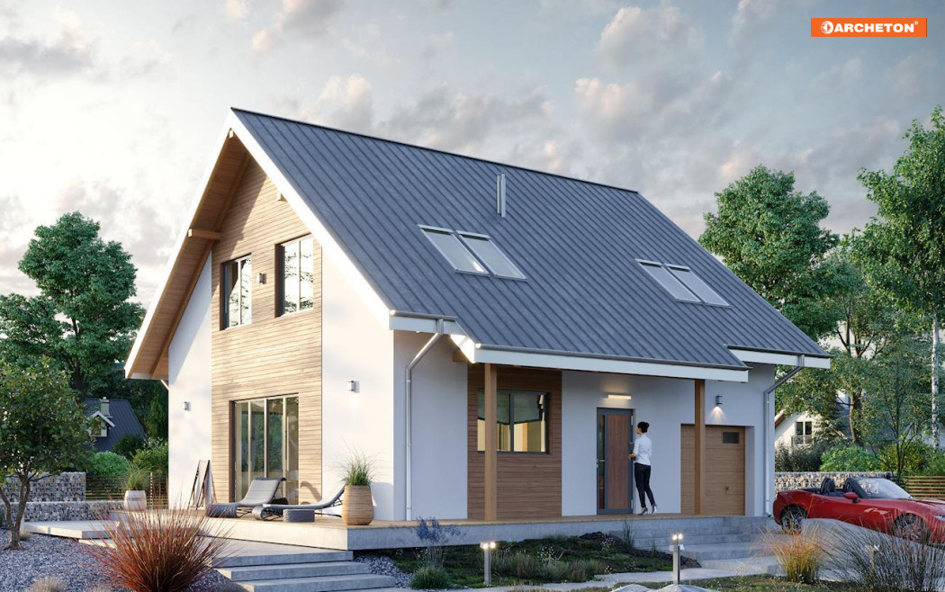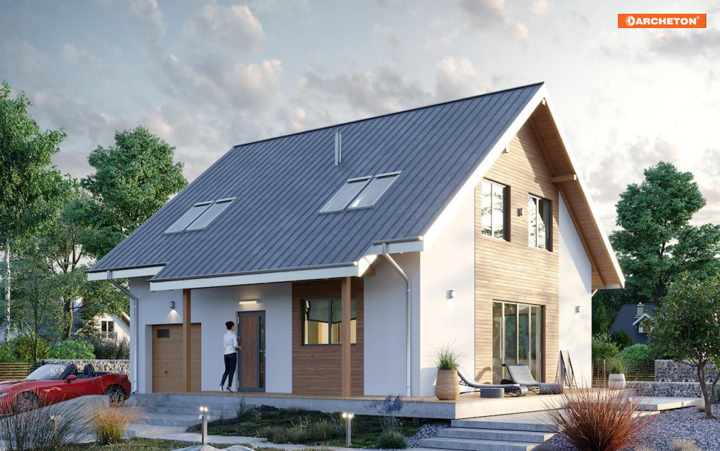 Budowę domu parterowego z użytkowym poddaszem i wbudowanym garażem o powierzchni ok. 105m2 i najprostszej bryle zrealizować można m.in. w oparciu o projekty Zojka Neo, Oberek Rex czy Szafir . Wszystkie charakteryzuje prosty dwuspadowy dach bez lukarn z kalenicą równoległą do drogi dojazdowej oraz gładkie, energooszczędne elewacje. Projekt domu Tola to wśród wymienionych rozwiązanie o planie najbardziej zbliżonym do kwadratu. Wymagać będzie dzięki temu węższej działki ale na parterze oferuje tylko wc. Jest za to dodatkowy, wykorzystujący miejsce pod podestem schowek przy kotłowni ulokowanej za garażem. Poddasze podzielono na trzy wygodne sypialnie i dużą łazienkę. Jedynym detalem urozmaicającym sylwetkę Toli jest obniżenie okapu wsparte drewnianymi słupkami i tworzące podcień od frontu. Oszczędną, tradycyjną stylistykę w projekcie domu Tola, przełamuje efektowne, duże balkonowe przeszklenie jadalni z wyjściem na taras w ścianie bocznej. Można podkreślić je i osłonić rozwijaną latem markizą. Nieco mniejsze powierzchnie pomieszczeń przy identycznym programie użytkowym przewidziano w projekcie domu Tola Mini.