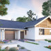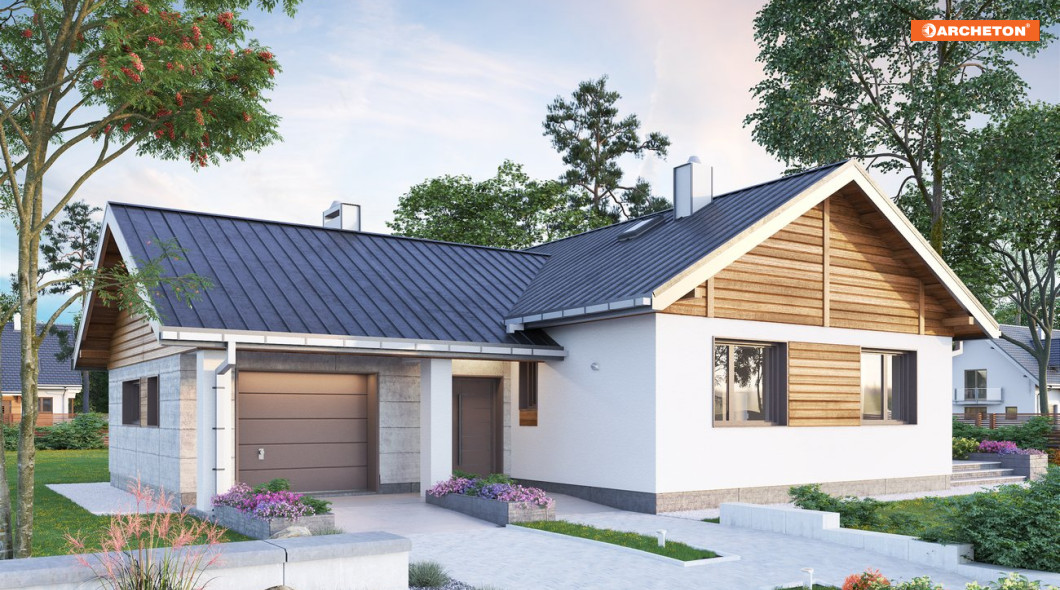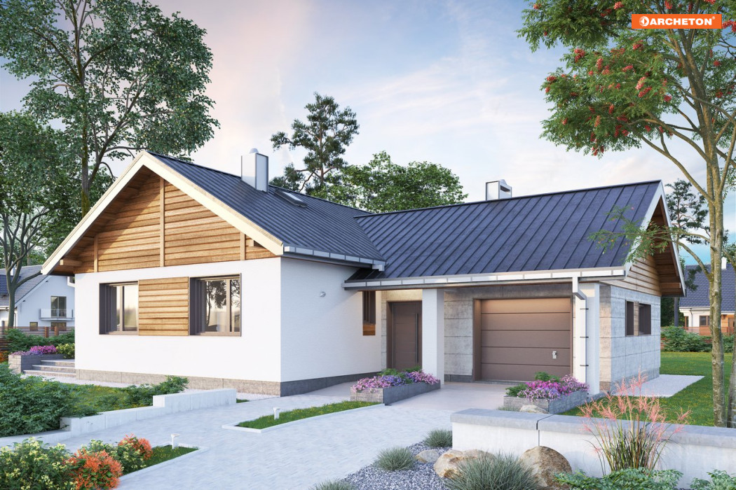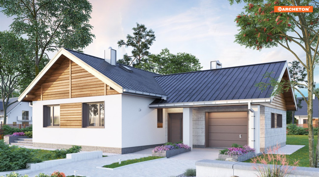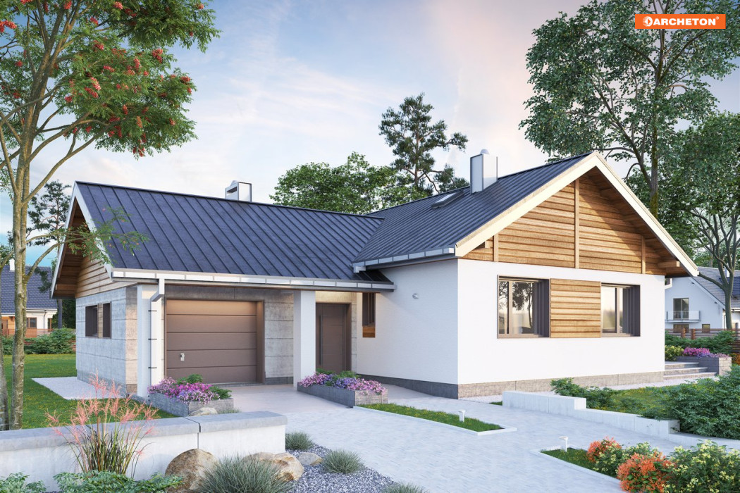 Projekt domu Żuczek jest o kilka m2 mniejszy od Żuczka Sto. Bardziej zwarty zarys ścian zewnętrznych salonu oraz tradycyjne w układzie i wysokości okna tej wersji sprzyjają konwencjonalnemu wykończeniu elewacji.