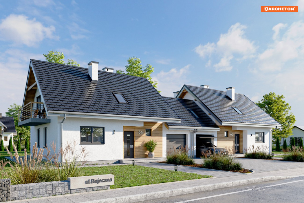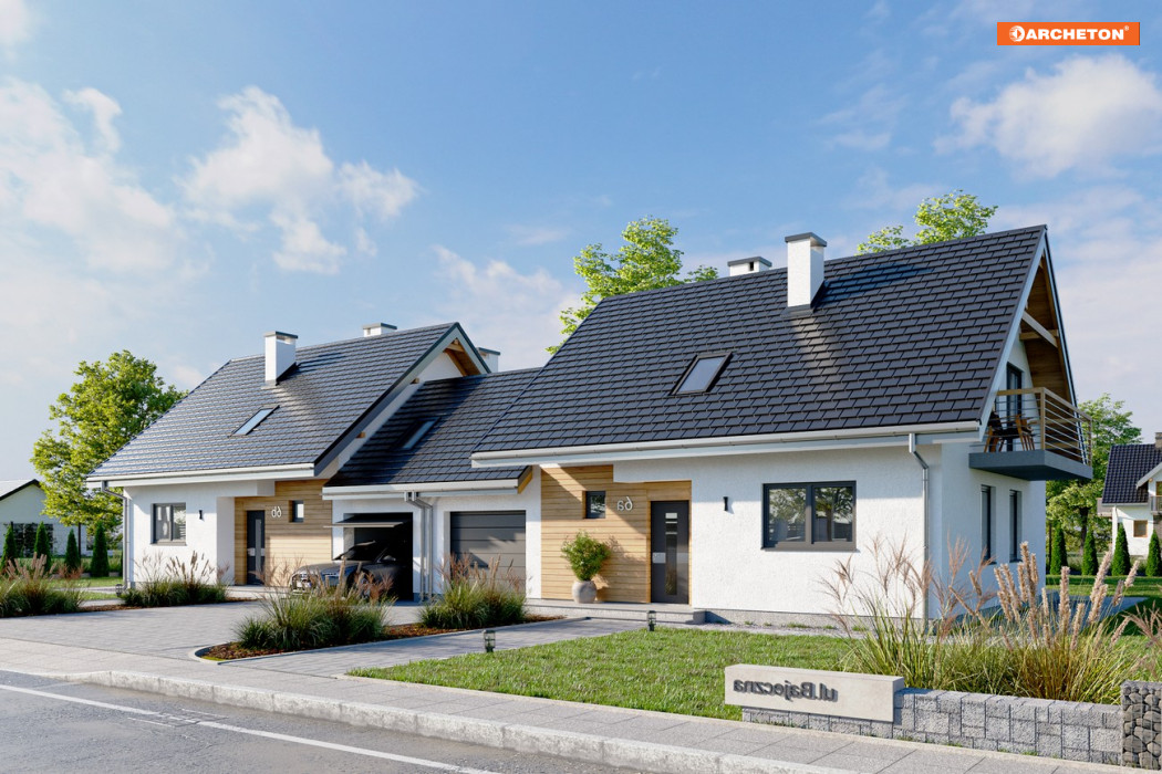 Wyjątkowy w ofercie Archetonu projekt domu Piryt jest piętrowy, z dobudowanym garażem i ma nowoczesny, miejski charakter. Proponuje duże, wygodne mieszkanie z niezbyt stromymi czterospadowymi dachami nad planem zbudowanym z nachodzących na siebie prostokątów. Wyrasta z niego prostopadłościenna, dwukondygnacyjna bryła, otoczona z jednej strony wysuniętym ku frontowi niższym budynkiem. Mieści on garaż, kotłownię, a na tyłach - gabinet przy salonie. Ponadto częścią jego dachu, wspartą na słupie przekryty jest wejściowy taras. Za głębokim podcieniem we wnęce, sienią z przejściem do garażu i za holem znajduje się przestronny pokój dzienny. Do salonu z jadalnią przylega od ogrodu niewielki gabinet, a od frontu - kuchnia ze spiżarnią. Otwarta częściowo klatka schodowa ze schowkiem prowadzi do czterech pokoi na piętrze. Znajduje się tu również pralnia i zespół dwóch łazienek, z których jedna przynależy tylko do głównej sypialni. Duże balkonowe przeszklenia ujęte w pionowe pasy na elewacjach, narożne okna w projekcie domu Piryt oraz ogrodowe podcięcia tarasów łagodzą surowość bryły. Jest lżejsza i bardziej wyrafinowana niż wskazywałyby na to jej gabaryty.