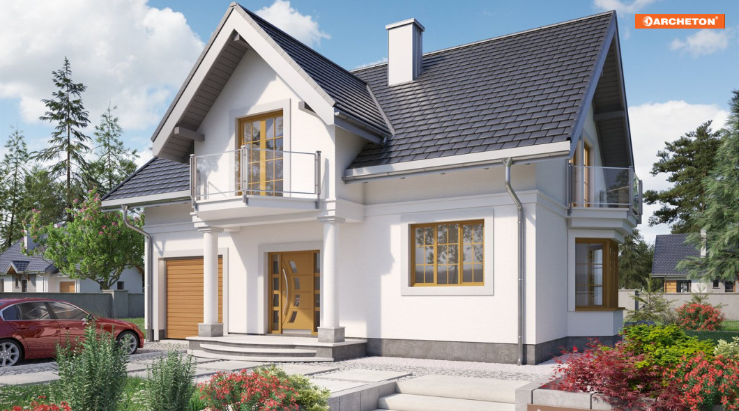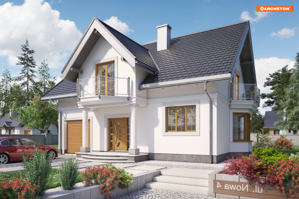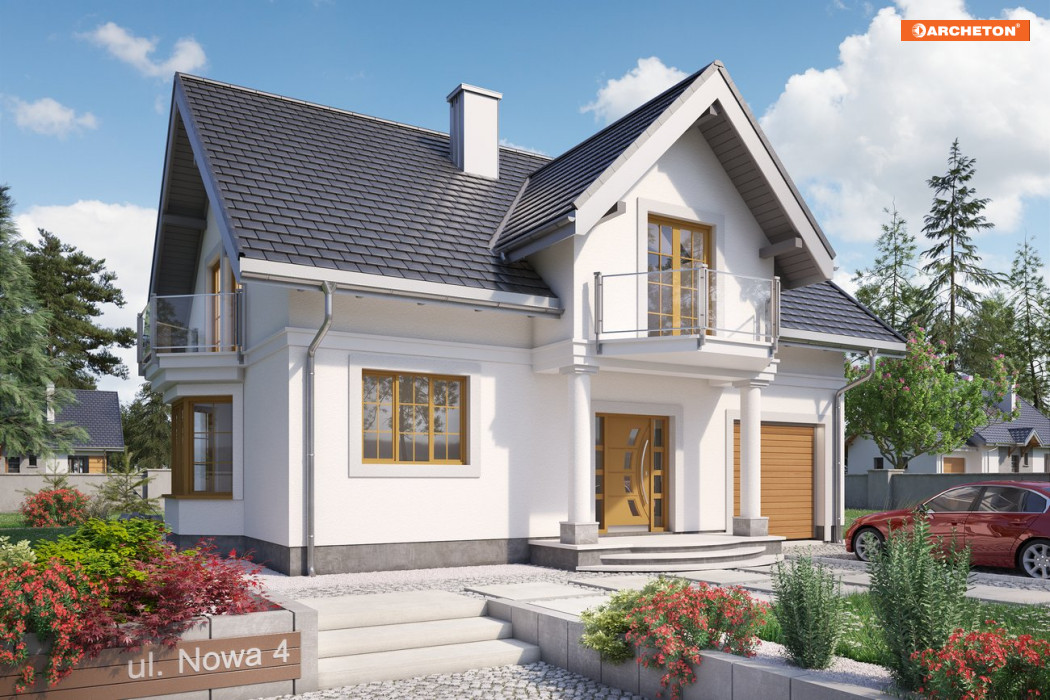 Wszystkie średniej wielkości projekty domów z użytkowym poddaszem z Rodziny Dymszy, charakteryzuje zwarta bryła i jeden, ekonomiczny dach dla części mieszkalnej i garażowej. Energooszczędny prostopadłościan urozmaica efektowna lukarna od frontu, wsparta na słupach oraz balkony, z których jeden wieńczy dekoracyjny ryzalit w ścianie bocznej. Projekty różni wielkość pomieszczeń, kształt dachu i wariantowanie fragmentów planu. W najmniejszym projekcie domu Dymsza Rex, tak jak we wszystkich wersjach, parter podzielono konstrukcyjnie i funkcjonalnie na mieszkalną strefę dzienną oraz na część gospodarczą. Otwarta kuchnia łączy się z salonem przez jadalnię umieszczoną w ryzalicie. Przestrzeń pod schodami wykorzystana została na powiększenie kotłowni za garażem. Projekt domu Dymsza Rex ma dwuspadowy dach. Wszystkie cztery pokoje poddasza mają zbliżoną wielkość i wyjścia na balkon, a przedpokój - foremny kształt. Główna sypialnia wyróżniona została (jak w większych wersjach: Karo z czterospadowym dachem i Polo) garderobą. Ulokowano ją w lukarnie wspartej na słupach i osłaniającej wyjście z salonu na taras ogrodowy.