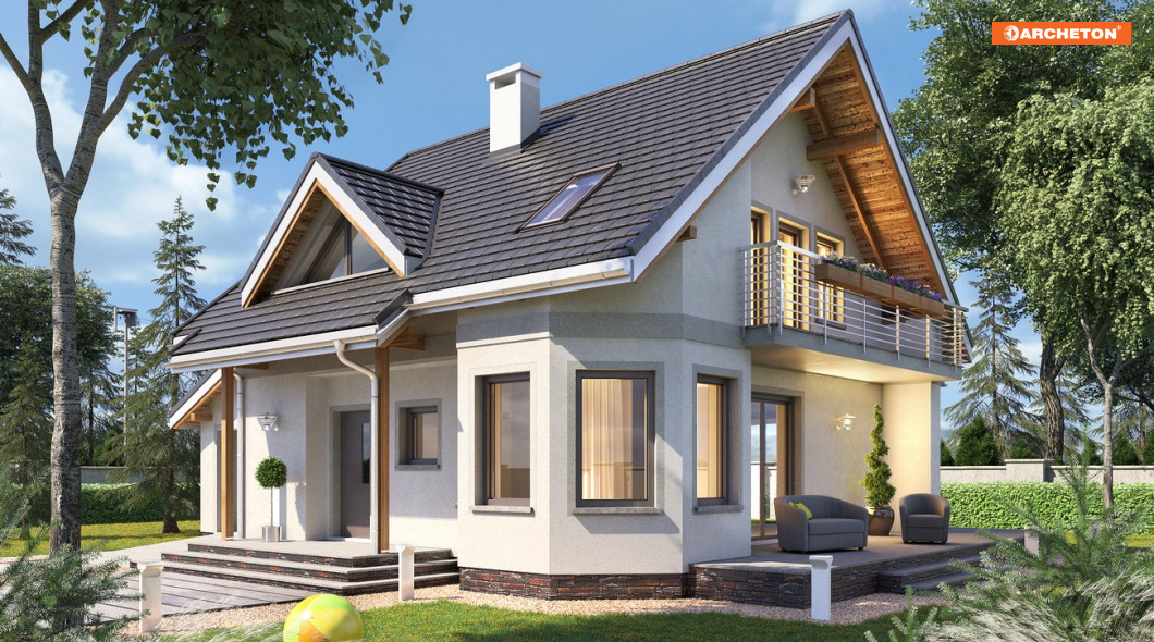 Projekt domu Majka Grota jest jednym z mniejszych wariantów Rodziny Majki. Wśród małych i średnich parterowych domów z użytkowym poddaszem i dobudowanym garażem, warianty te zwracają uwagę trójkątną lukarną i fantazyjnym narożnym ryzalitem na planie ośmioboku. Przełamanie geometrii kąta prostego kształtuje dalej inne elementy bryły: zadaszoną wnękę wejścia na drewnianych słupkach, taras przy ścianie bocznej i ocieniający go balkon. Rozkład wnętrza oparto na sprawdzonych schematach, ale dodano kilka oryginalnych rozwiązań. Pokój dzienny urozmaica ośmiokątna jadalnia przy kuchni i widok na trójbiegowe schody w otwartym holu. Projekt domu Majka jest wersją z kalenicą dwuspadowego dachu równoległą do drogi dojazdowej i nie oferuje przy salonie dodatkowego pokoju tak, jak np. większa Majka Puzon. Miejsce to zajmuje przechodnie pomieszczenie gospodarcze, a kotłownia jest w podpiwniczeniu części mieszkalnej. W pozostałej wolnej przestrzeni przy schodach mieści się tylko wc. Strefa nocna na poddaszu, pozwala na indywidualną aranżację prywatnej przestrzeni dla domowników, bo każdy z trzech pokoi dla czterech osób ma inny kształt i sposób doświetlenia.