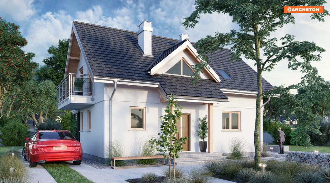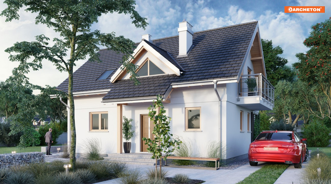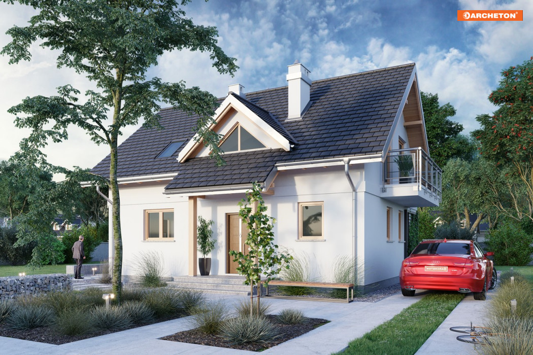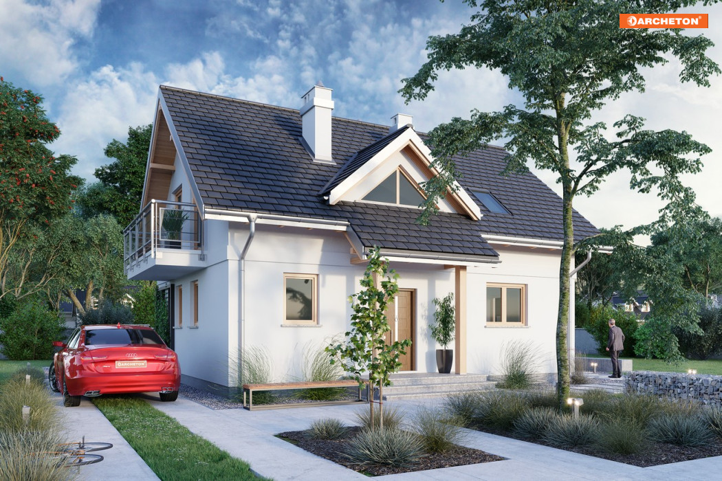 Malachit Polo to projekt domu parterowego z użytkowym poddaszem z grupy najbardziej ekonomicznych w realizacji koncepcji o powierzchni ok. 105m2 bez garażu. Tak jak zbliżone: Pączek, Kuklik i Sambor ma energooszczędny, prostokątny rzut i dwuspadowy dach z kalenicą równoległą do drogi dojazdowej. Układ kompletnego mieszkania na parterze (dodatkowy pokój przy salonie + łazienka) i kolejnych czterech pokoi na poddaszu ułatwia etapowanie budowy. Schemat konstrukcyjny jest nieskomplikowany i czytelnie rozdziela funkcje mieszkania dwoma poprzecznymi ścianami nośnymi. Detal podcienia frontowego z przedłużonego okapu na słupkach jest charakterystyczny dla wszystkich wariantów Malachita. Domy te proponują otwartą, nowoczesną strefę dzienną, a na poddaszu kolejną, większą łazienkę. W wersji Polo wzbogacono bryłę dodając nad wejściem trójkątną lukarnę, a w ścianie bocznej ryzalit z jadalnią na oktagonalnym zarysie, podpierający jeden z dwóch balkonów. Rozkład mieszkania i ten detal projektu domu Malachit Polo przypomina rozwiązania nieco większego projektu Sonia z garażem w piwnicy, który oferuje jednak tylko trzy, choć większe, pokoje na poddaszu.
