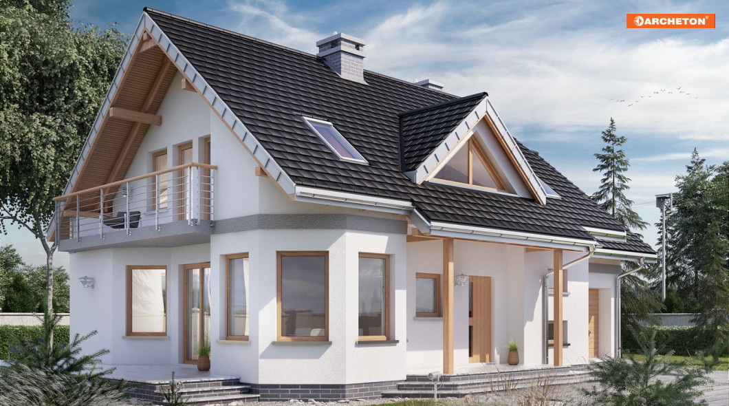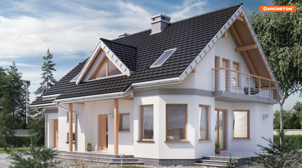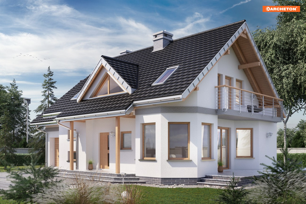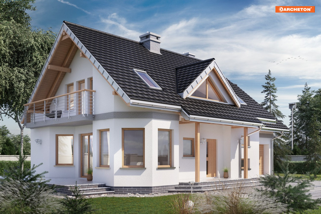 Projekt domu Maja Polo Mini to najmniejszy wariant w liczącej kilkanaście wariantów rodzinie, zbliżonej do Rodziny Majki. Obie rodziny wyróżnia, wśród małych i średnich domów z dobudowanym garażem, fantazyjna sylwetka z narożnym ryzalitem wzniesionym na planie ośmioboku. Przełamanie geometrii kąta prostego kształtuje także inne detale bryły: zadaszoną wnękę wejścia, taras dostępny z salonu przy ścianie bocznej i ocieniający go balkon. Rozkład wnętrza w projekcie domu Maja przypomina wszystkie koncepcje Mai i Majki. Pokój dzienny urozmaica ośmiokątna jadalnia przy kuchni ale salon jest bardziej przysłonięty od holu. Dwubiegowe schody w projekcie domu Maja Polo Mini ulokowano od frontu, przy połączeniu z garażem. Alternatywne wersje proponują różne wielkości mieszkania i garażu, a większe od Mai Polo Mini - dodatkowy pokój przy salonie w miejscu dużej kotłowni. Strefa nocna na poddaszu pozwala na indywidualną aranżację prywatnej przestrzeni dla domowników, bo każdy z czterech pokoi ma inny kształt i sposób doświetlenia. Projekt domu Maja Polo Mini, jak większość w rodzinie, ma osobne dwuspadowe dachy nad częścią mieszkalną i garażem.