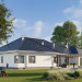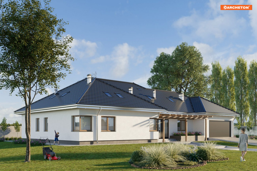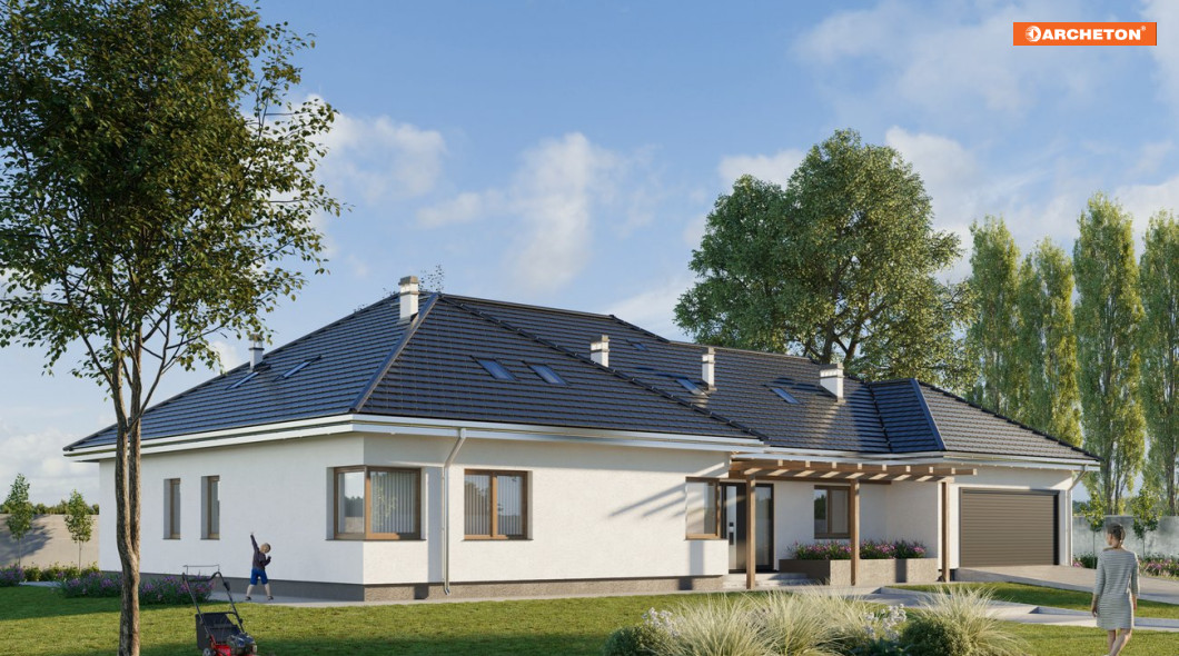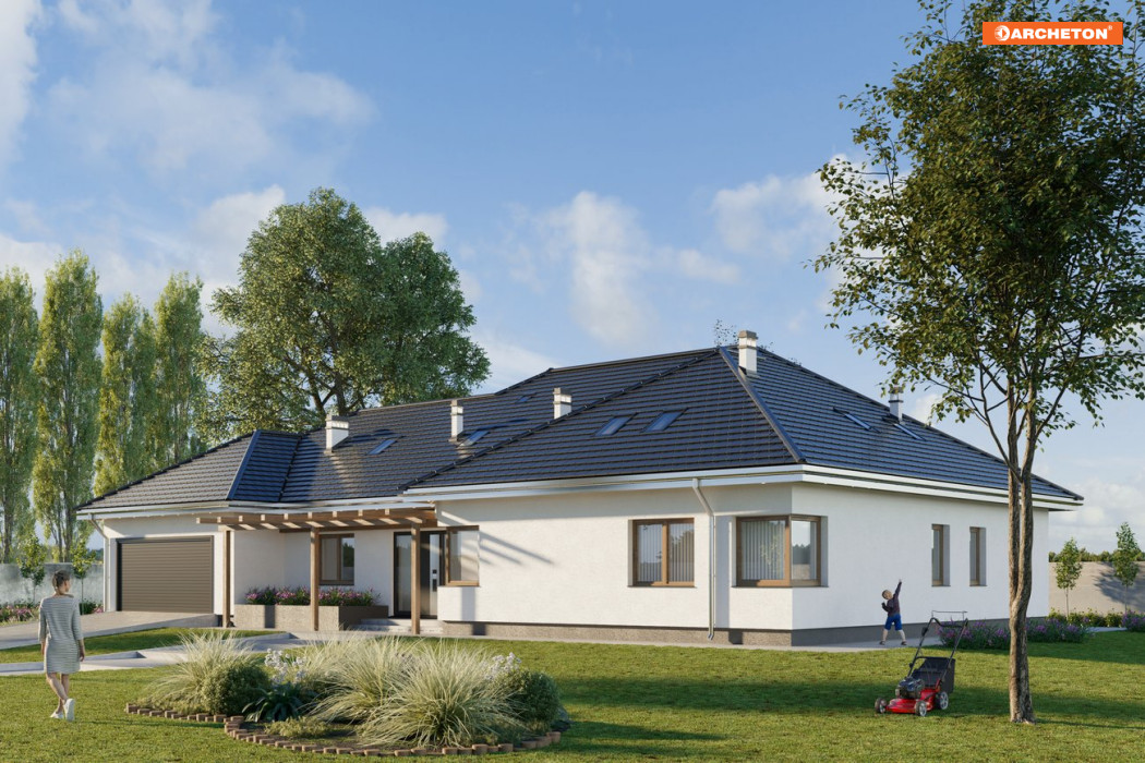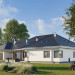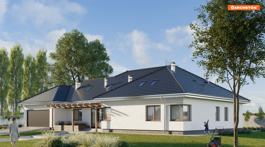 Parterowa rezydencja o powierzchni powyżej 200m2 z podwójnym garażem to wyjątkowe rozwiązanie. Projekt domu Willa Marynin proponuje niski, rozległy budynek przekryty nieregularnym układem przenikających się czterospadowych dachów o średnim nachyleniu. Ze swobodnie zarysowanego rzutu wyrastają trzy części willi przesunięte względem siebie przy środkowej, wejściowej wnęce z tarasem przed główną z nich mieszczącą strefę dzienną. Poza sienią z dodatkowym pokojem i łazienką znajduje się tu niezwykle obszerny, otwarty na hol pokój dzienny wysoki po sam dach. Jadalnia sąsiaduje z salonem i dużą kuchnią stanowiącą jednocześnie przechodni łącznik z częścią gospodarczą. Przedsionek prowadzi tu do spiżarni, kotłowni z pralnią i garażu. Po przeciwnej stronie holu znalazła się zamykana strefa nocna z izolującymi od komunikacji (przedsionki z szafami) trzema sypialniami dla czterech osób. W projekcie domu Willa Marynin część nieużytkowego poddasza dostępna jest schodami z holu i możliwa do zagospodarowania. Mało rygorystyczny kształt bryły podkreśla swobodny rysunek elewacji z narożnym oknami, niesymetryczne akcentowanie frontu z rabatą i pergolą.