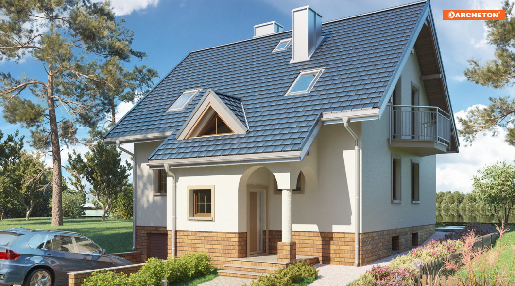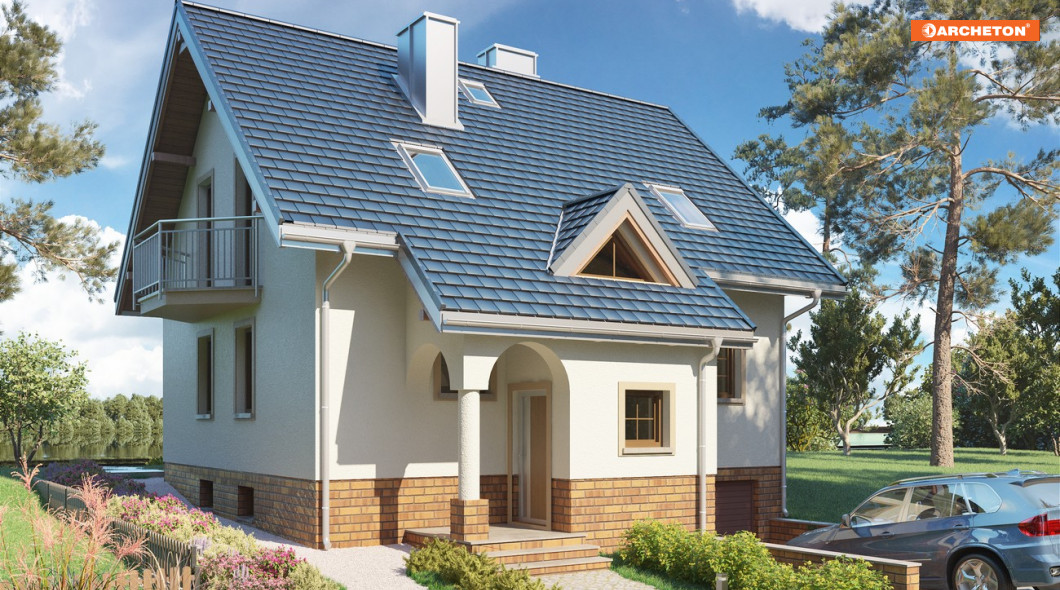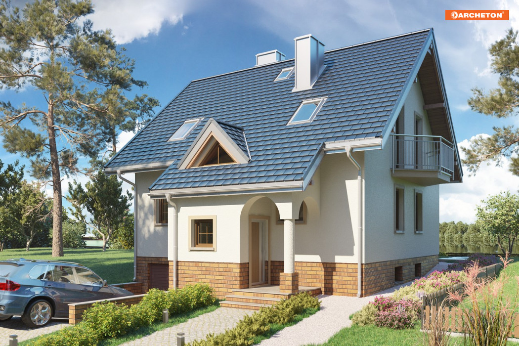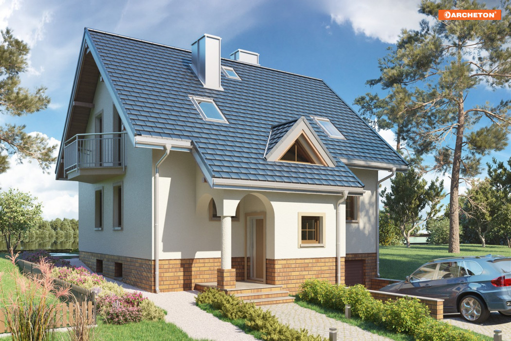 Rodzina Fiony to nieduże, proste w budowie domy parterowe z użytkowym poddaszem. Mają otwartą część dzienną i dodatkowy pokój przy salonie. Podobnie jak Krab i Amelia nadają się na działkę z pochyleniem w kierunku wjazdu ale tylko w rodzinie Fiony jest dom o powierzchni powyżej 140m2p.u. Wszystkie wymienione, w tym średniej wielkości projekt domu Fiona Stok, mają bryłę na planie prostokąta, z kalenicą równoległą do drogi dojazdowej. We Fionie i Krabie boczną elewację akcentuje balkon na ryzalicie jadalni. Obniżony i wysunięty ku wjazdowi przedsionek przekryto, wraz z podcieniem na słupie, przedłużoną połacią głównego dachu z małą trójkątną lukarną doświetlającą klatkę schodową. Umieszczenie schodów w środku części frontowej pozwala na ekonomiczne rozplanowanie poddasza i zminimalizowanie powierzchni komunikacji. Trzy sypialnie Fiony i łazienka są dzięki temu wyjątkowo obszerne, foremne i ustawne. Projekt domu Fiona Stok i większa wersja Ultra przewiduje pełne podpiwniczenie mieszczące m.in. garaż i kotłownię. Dzięki temu łazienka na parterze jest wygodniejsza niż w pozostałych wersjach, a bryła bez dobudowanego garażu - jeszcze bardziej zwarta.