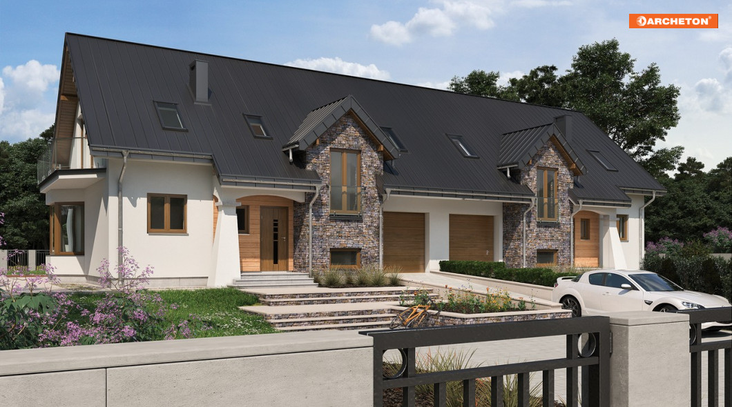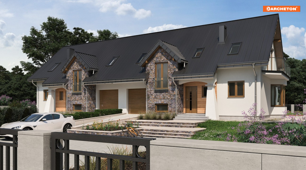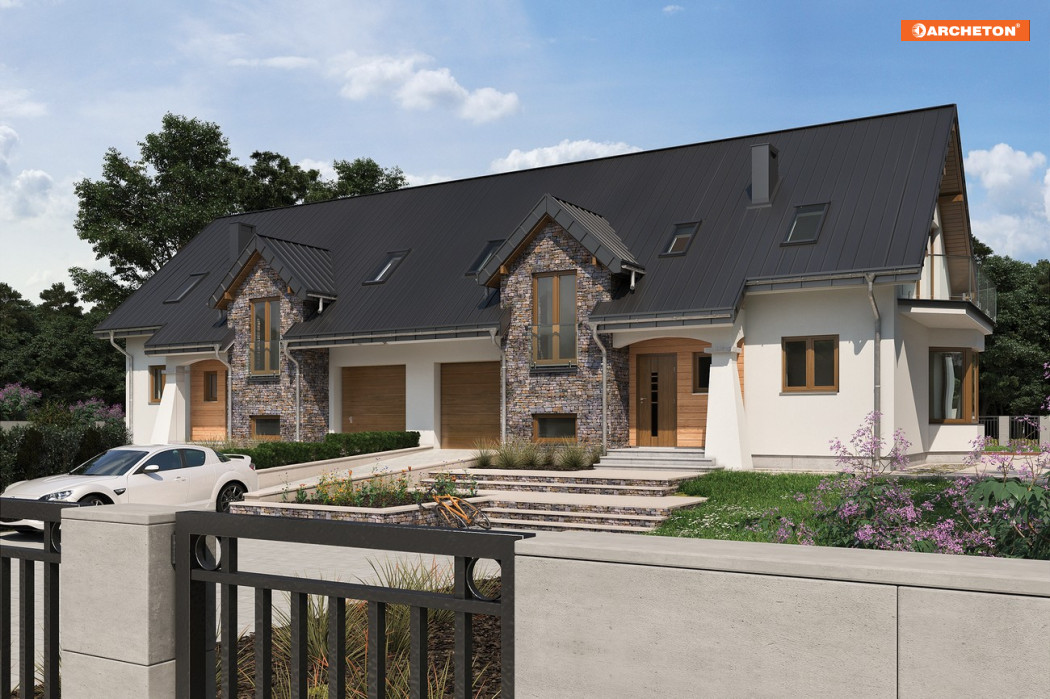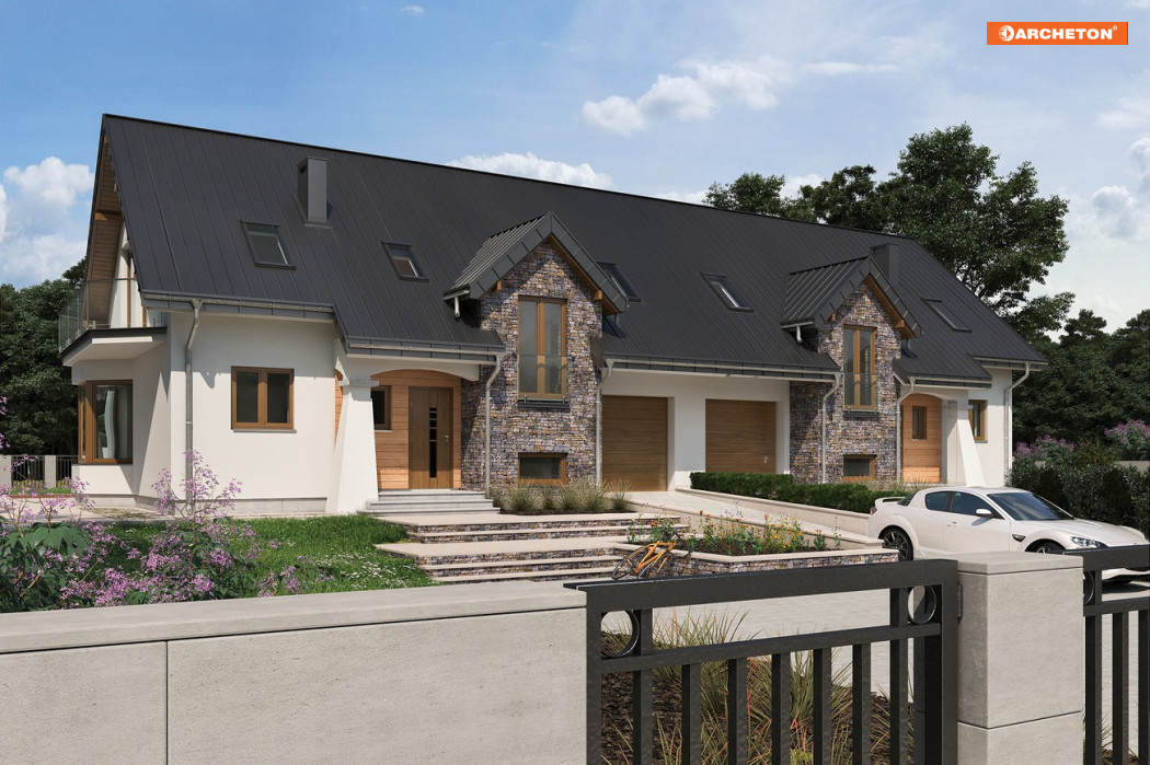 Zabudowa bliźniacza (w granicy działki) najczęściej dotyczy niewielkich parceli w obrębie miast. Projekt parterowego domu z użytkowym poddaszem i wbudowanym garażem Fermata Duo cechuje architektura dostosowana do takich właśnie obszarów. Wspólny dwuspadowy dach z kalenicą równoległą do drogi dojazdowej, przekrywa część mieszkalną i garażową. Wysunięty ryzalit z klatką schodową oraz wejściowy podcień z dekoracyjnym słupem w formie przypory dzielą elewację skierowaną do ulicy. Parter zaprojektowano dość tradycyjnie: ściana nośna wyraźnie separuje kuchnię z frontowym oknem i hol z wc od obszernego, podłużnego salonu z dwoma wyjściami na taras ogrodowy. Na poddaszu są cztery pokoje, w tym główna sypialnia z dużą garderobą, oraz łazienka. Trzy lukarny w dachu, dwa balkony, a jeszcze ryzalit jadalni w ścianie bocznej, razem z detalem frontu, decydują o niezwykłej malowniczości sylwetki Fermaty. Nadając jej charakter kamieniczki sprawiają, że projekt domu Fermata Duo najlepiej sprawdzi się w osiedlach powstających z zamysłem odtworzenia wnętrz i klimatu miejskich uliczek.