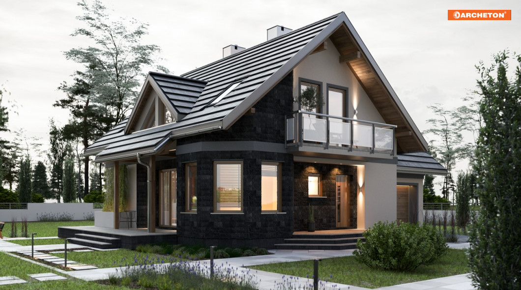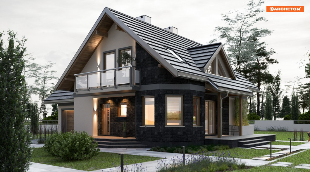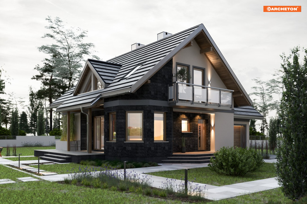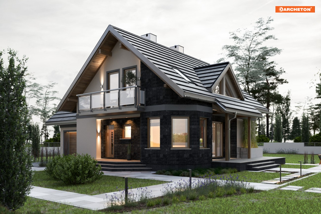 Wszystkie warianty Rodziny Majki, wśród małych i średnich domów z użytkowym poddaszem wyróżnia fantazyjna sylwetka z narożnym oktagonalnym ryzalitem, podobna jak w Rodzinie Mai. Przełamanie geometrii kąta prostego kształtuje taras dostępny z salonu i wnękę wejścia zadaszoną w projekcie domu Majka Tura balkonem. Otwarty pokój dzienny urozmaica ośmiokątna jadalnia przy kuchni i widok na trójbiegowe schody w holu. Dwupoziomowa strefa nocna na poddaszu pozwala na indywidualną aranżację prywatnej przestrzeni dla domowników, bo każdy z czterech pokoi ma inny kształt i sposób doświetlenia. Projekt domu Majka Tura ma średnią wielkość w rodzinie i jest jednym z kilku, w których obrócono o 180º dwuspadowy dach nad częścią mieszkalną. Razem z garażem powstał układ prostopadły i bryła na czytelnym, symetrycznym kształcie litery T. Front akcentuje ściana szczytowa, a trójkątna lukarna i podcień na słupkach, charakterystyczne dla całej rodziny, znajdują się nad tarasem przy ścianie bocznej. Wielkość tego rozwiązania sprawia, że przy salonie powstał dodatkowy pokój, a kotłownia, inaczej niż w mniejszych wersjach, znalazła się w części gospodarczej, za garażem.