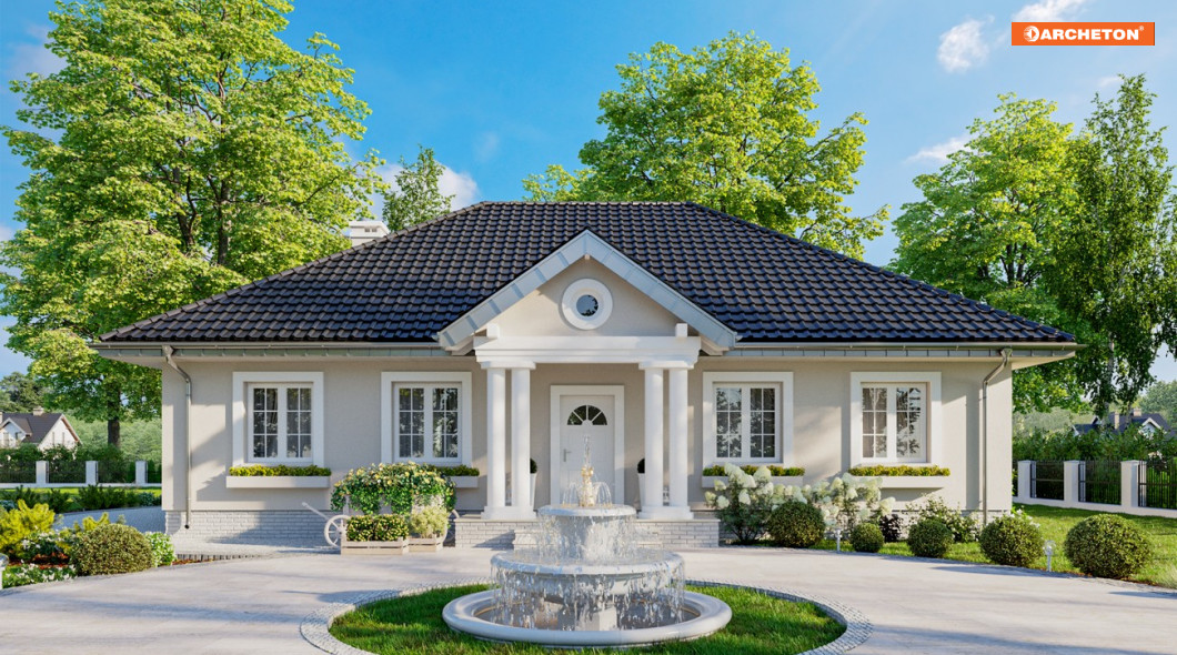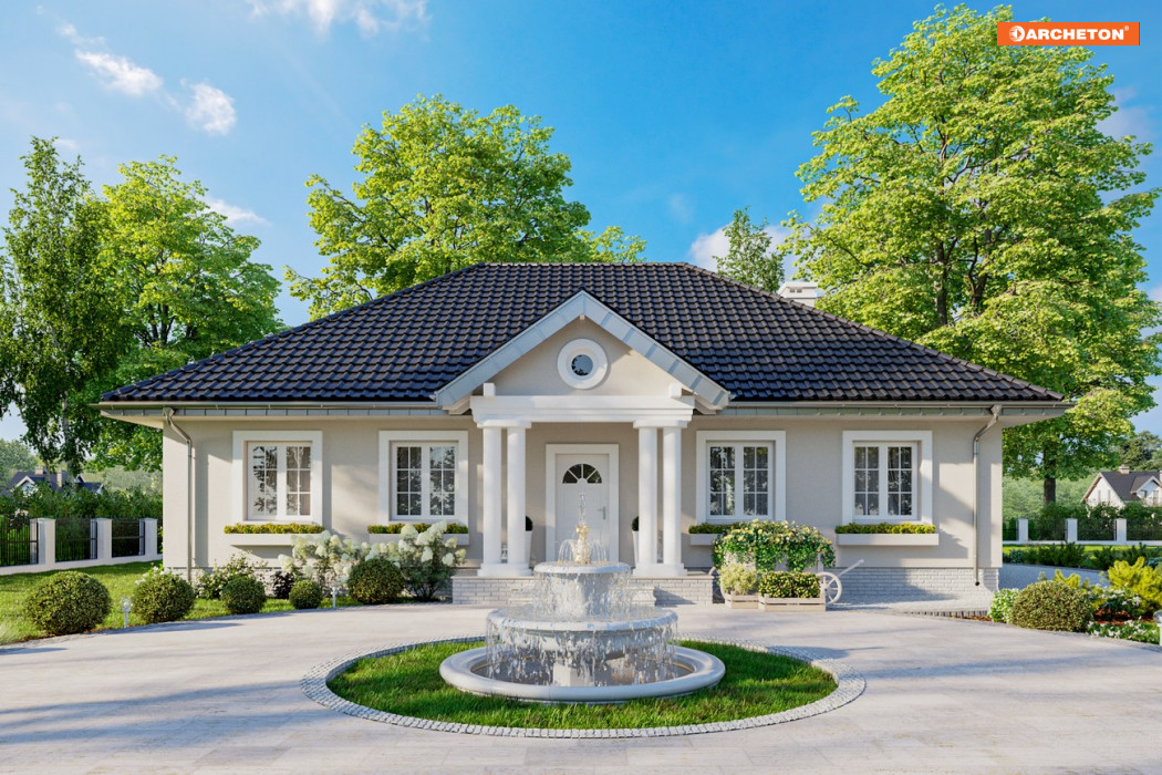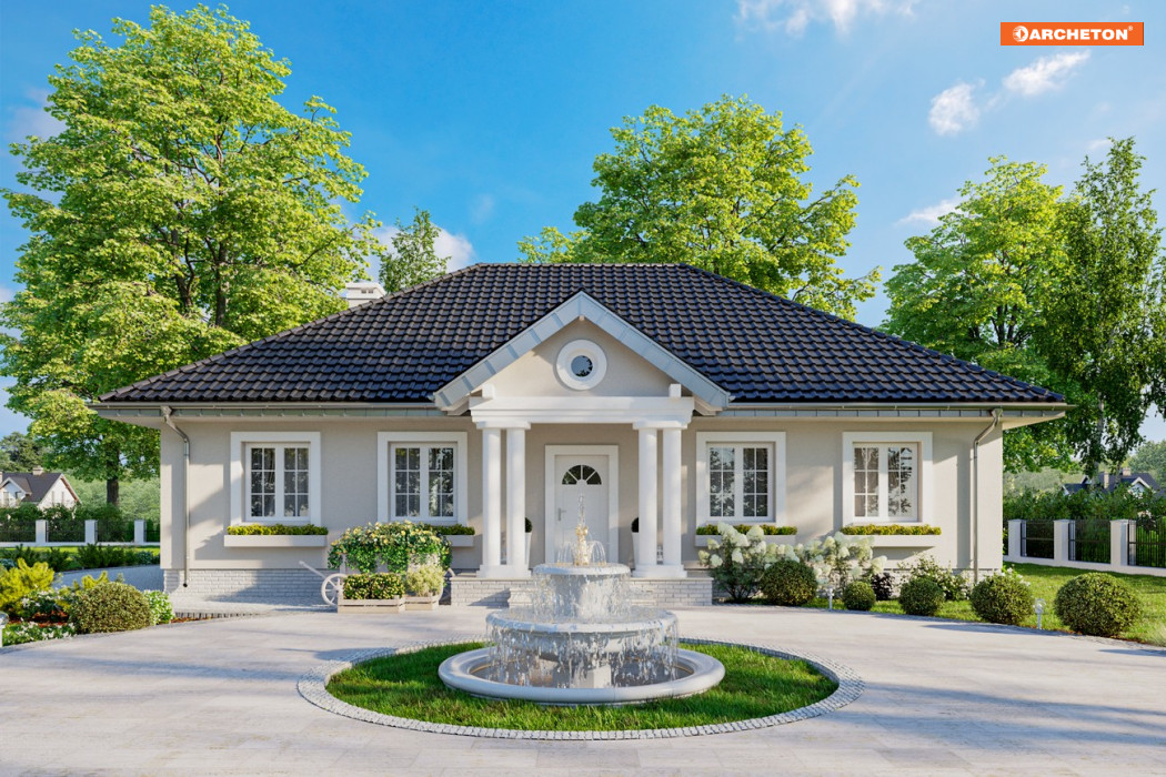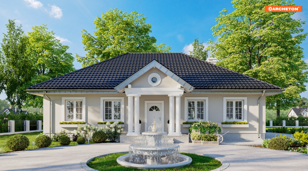 Architektura polskiego dworku nieustannie inspiruje tworzących projekty domów jednorodzinnych. Rzut na planie prostokąta jest energooszczędny, a nieużytkowa przestrzeń pod czterospadowym dachem w sposób naturalny (a więc najbardziej ekonomiczny!) izoluje od chłodów i od upału. Projekt domu Aleksandria Muza to jeden z największych wariantów rodziny Aleksandrii. Czerpią one wprost z historycznego pierwowzoru dworku, oferując jednopoziomowe (za wyjątkiem wersji Tura) mieszkanie bez garażu o powierzchni 100-140m2. Tradycyjna bryła Aleksandrii o zbliżonych do autentycznych proporcjach zawiera, zamiast izb w amfiladowym układzie, przestronne, nowoczesne mieszkanie dla 4-5 osób. Część dzienna to otwarty salon z dużą kuchnią, do której przylega z jednej strony duża część gospodarcza, z drugiej spiżarnia i gościnna łazienka. Strefa nocna z czterema pokojami i z łazienką dostępna jest z korytarza wyprowadzonego z narożnika pokoju dziennego. Projekt domu Aleksandria Muza proponuje historyzujący charakter architektury, podkreślony od frontu i od ogrodu kolumnowymi portykami.