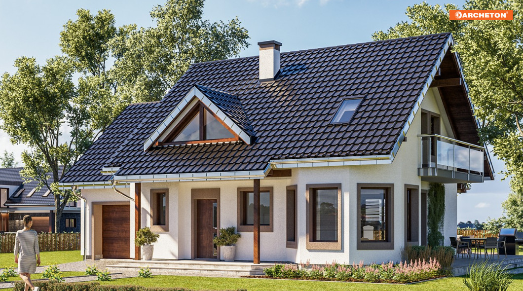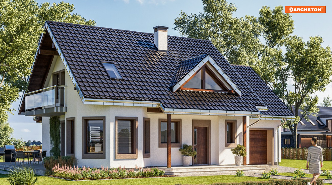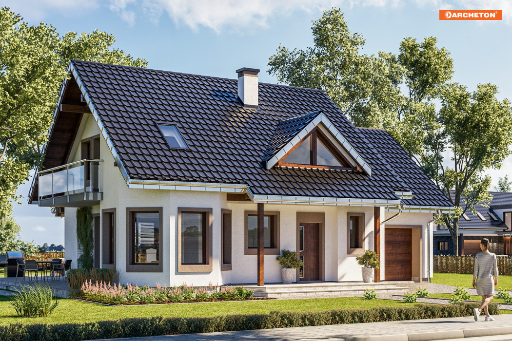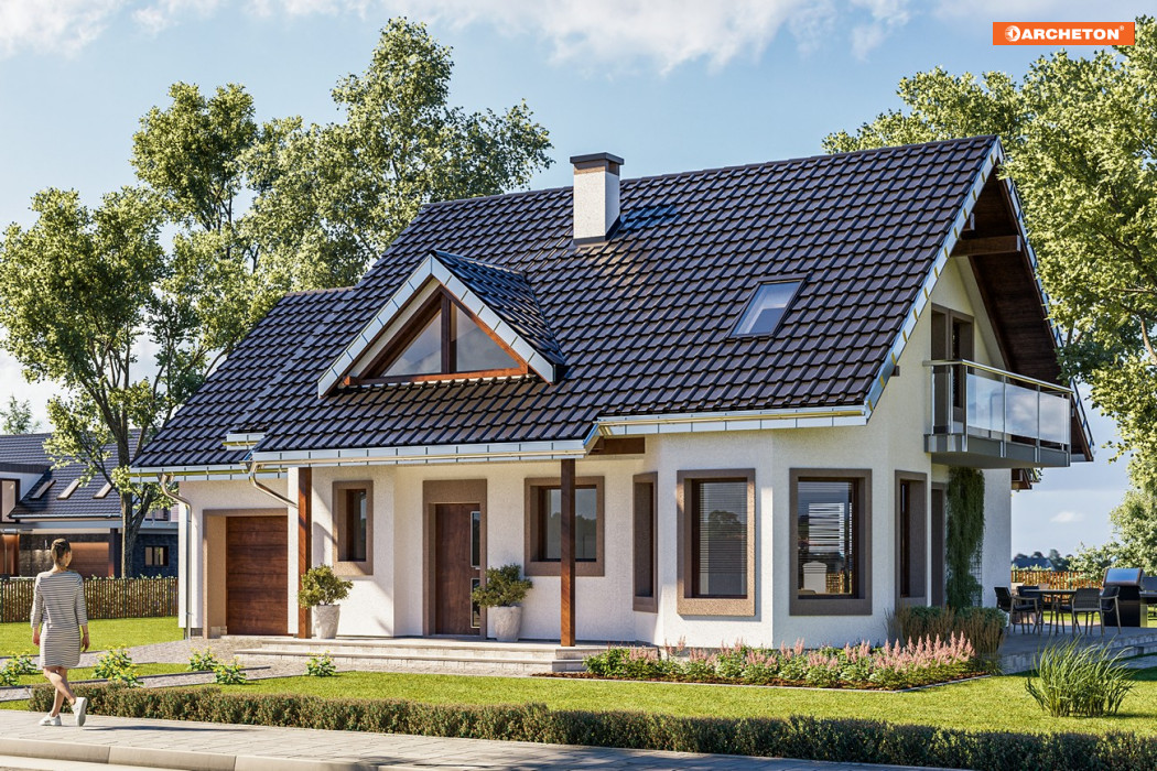 Projekt domu Majka Polo ma średnią wielkość w liczącej kilkanaście wariantów Rodzinie Majki. Wśród małych i średnich parterowych domów z użytkowym poddaszem i dobudowanym garażem, warianty te zwracają uwagę sylwetką z trójkątną lukarną i fantazyjnym narożnym ryzalitem na planie ośmioboku. Przełamanie geometrii kąta prostego kształtuje dalej inne elementy bryły: zadaszoną wnękę wejścia na drewnianych słupkach, taras przy ścianie bocznej i ocieniający go balkon. Rozkład wnętrza oparto na sprawdzonych schematach, ale dodano kilka oryginalnych rozwiązań. Pokój dzienny urozmaica ośmiokątna jadalnia przy kuchni i widok na trójbiegowe schody w otwartym holu. Projekt domu Majka Polo jest wersją z kalenicą dwuspadowego dachu równoległą do drogi dojazdowej i nie oferuje przy salonie dodatkowego pokoju tak, jak np. dużo większa Majka Puzon. Miejsce to zajmuje, jak we wszystkich niewielkich wariantach, kotłownia i pełna, mała łazienka. Dwupoziomowa strefa nocna na poddaszu w całej Rodzinie Majki, pozwala na indywidualną aranżację prywatnej przestrzeni dla pięciorga domowników, bo każdy z czterech pokoi ma inny kształt i sposób doświetlenia.
