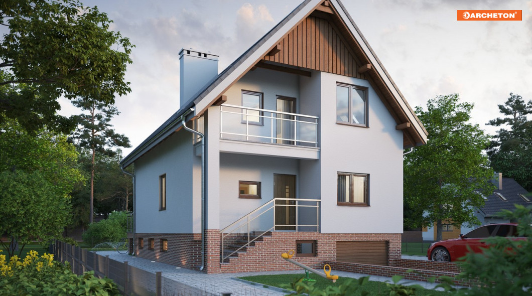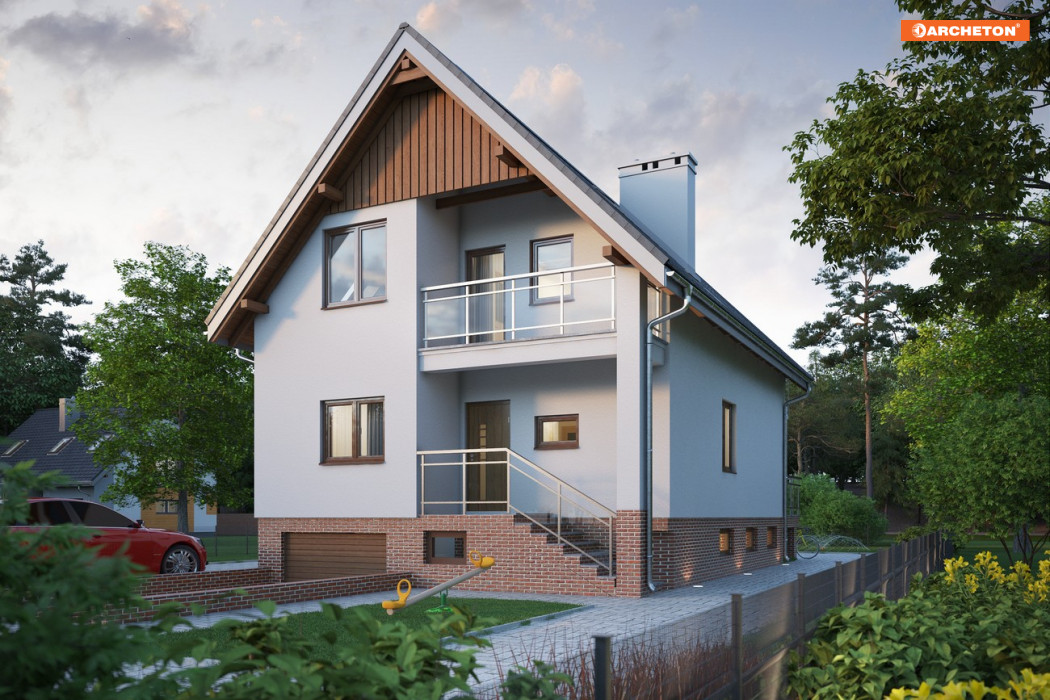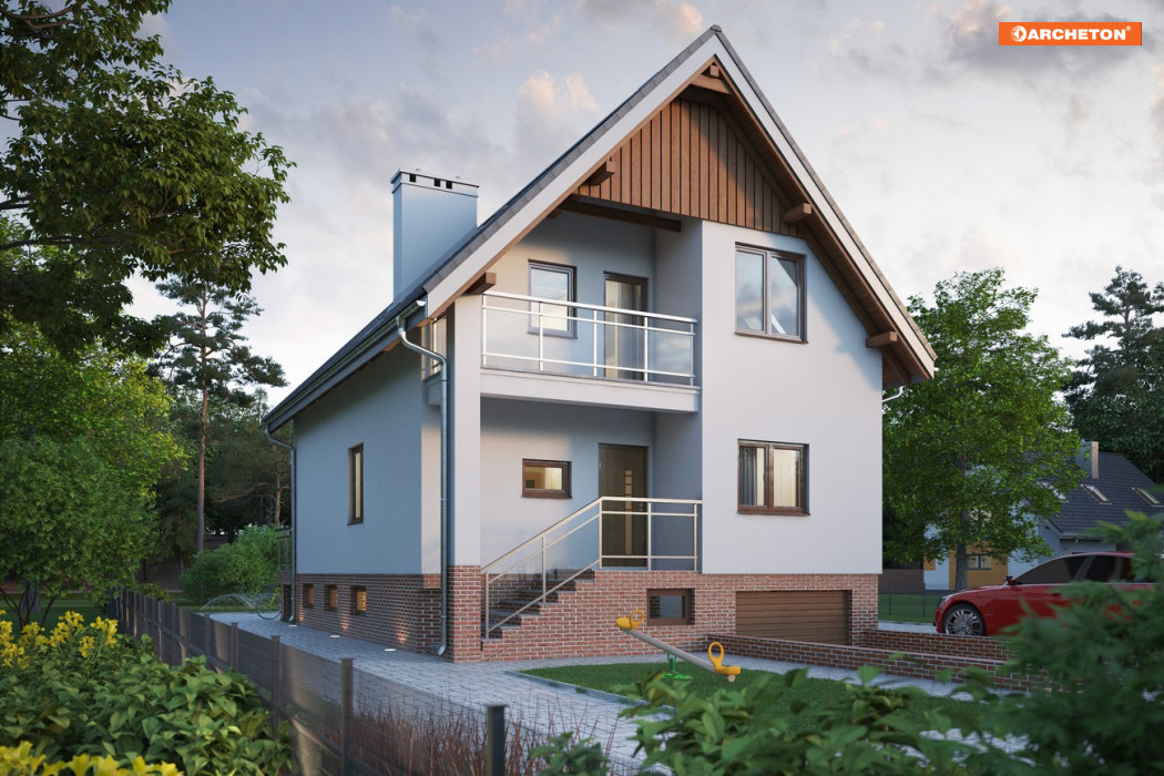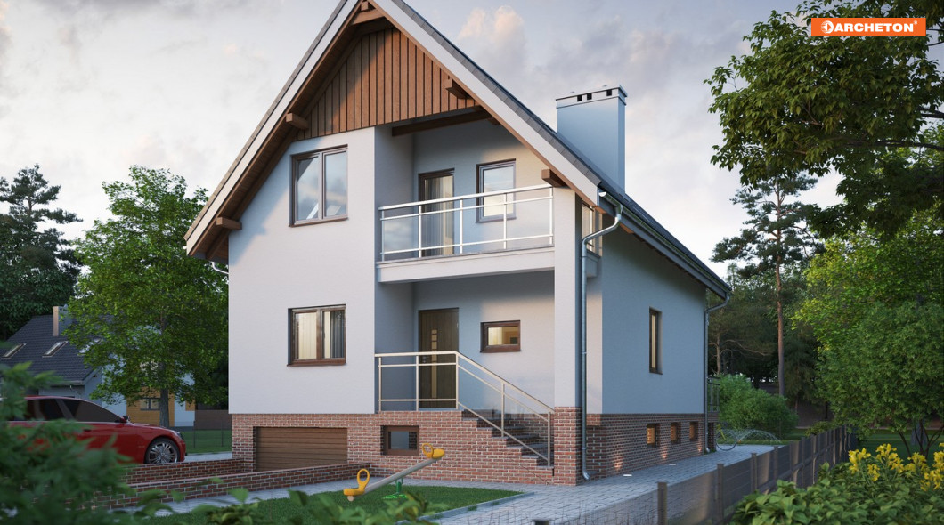 Projekt Koral Rex to jeden z nielicznych projektów niewielkich domów z użytkowym poddaszem przeznaczonych na wąską parcelę, który przewiduje pełne podpiwniczenie. Razem z nieco mniejszą Biedronką prezentuje przy tym zwartą bryłę z dwuspadowym dachem, zwróconą do wjazdu na działkę szczytem. Front Korala wyróżnia wnęka z narożnym słupem niosącym balkon osłaniający wejście główne. Parter zajmuje tradycyjnie zagospodarowana wydzielonymi pomieszczeniami część dzienna mieszkania: pokój dzienny, duża kuchnia i łazienka oraz hol i schody. Na poddaszu zmieszczą się trzy duże sypialnie z łazienką, a w piwnicy, oprócz jednostanowiskowego garażu, kotłownia i kilka pomieszczeń gospodarczych. Tradycyjny i ekonomiczny jest też sposób oświetlenia poddasza – bez lukarn, głównie dużymi oknami w ścianach szczytowych. Oprócz zagłębienia pod okapem akcentującego wejściowe schody, jedynym urozmaiceniem ekonomicznej bryły jest w projekcie domu Koral Rex długi balkon nad tarasem ogrodowym.