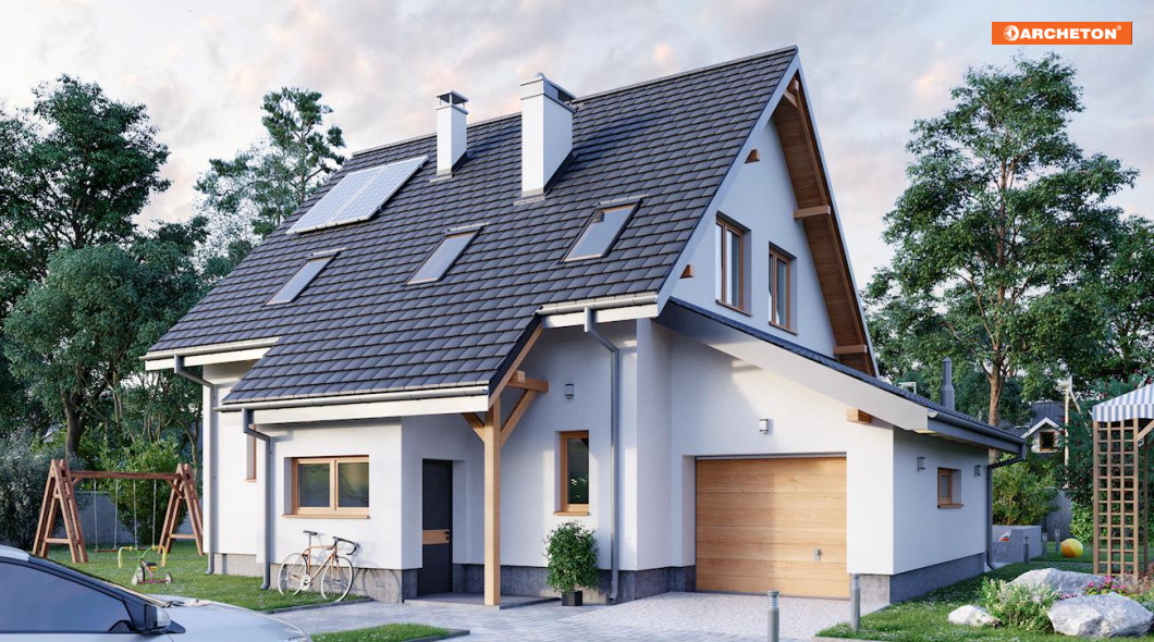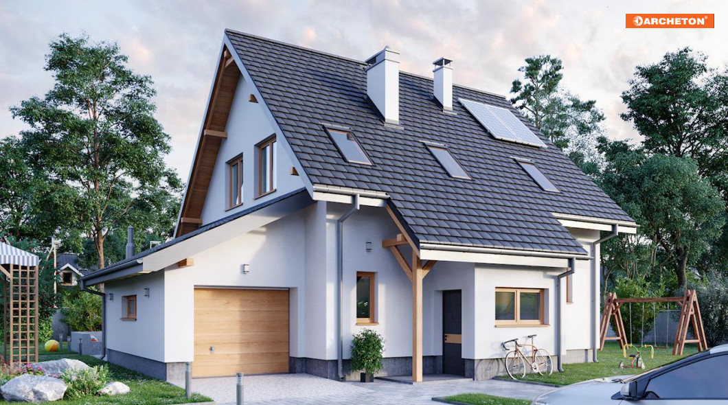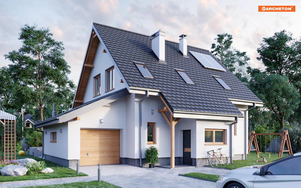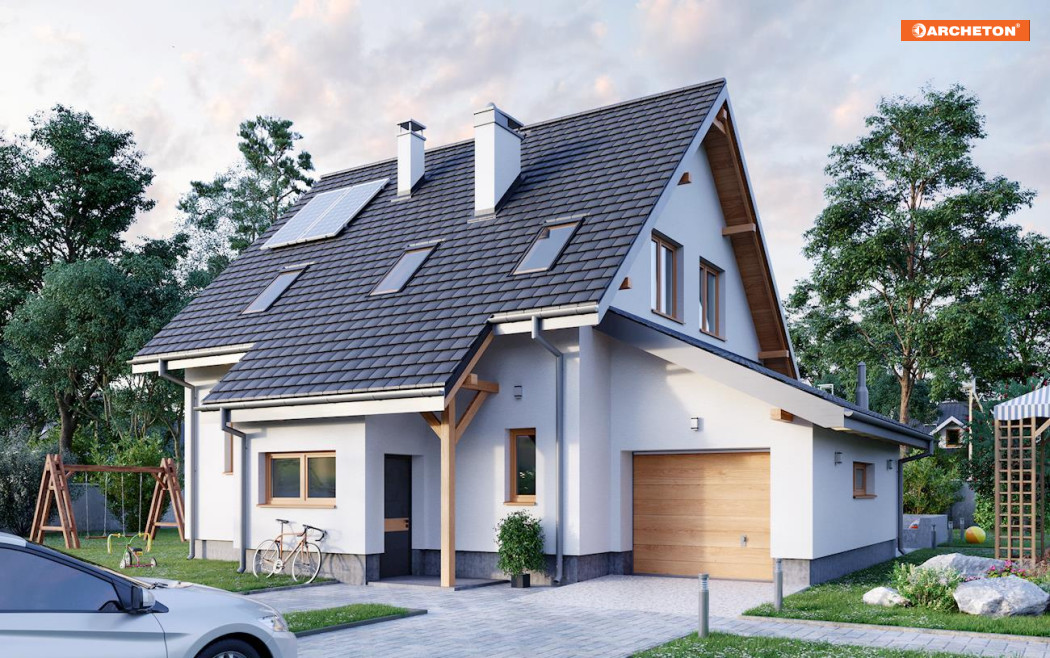 W Rodzinie Kraba znalazły się ekonomiczne domy parterowe z użytkowym poddaszem z zakresu powierzchni 90-120m2. Podobnie jak Fiona i Amelia wykorzystują działkę z lekkim spadkiem ku wjazdowi. Do części mieszkalnej przekrytej dwuspadowym dachem przylega garaż z pulpitową połacią, który, wraz z wejściem do domu i kotłownia dostępną z sieni, ulokowano niżej o 90cm w stosunku do głównego poziomu parteru. W średnim wielkością w rodzinie projekcie domu Krab Neo wysunięty przedsionek przekryto, wraz z podcieniem na słupie, przedłużoną połacią głównego dachu. Salon i dodatkowy pokój są tradycyjnie oddzielone od kuchni i holu z łazienką ścianą nośną ale mogą zostać połączone. Umieszczenie schodów w środku części frontowej budynku decyduje o racjonalnym układzie poddasza z niewielką powierzchnią komunikacji. Trzy sypialnie i duża łazienka są dzięki temu wyjątkowo ustawne i foremne. Projekty z Rodziny Kraba to różne wielkości domu rozplanowanego w taki sam sposób na zbliżonym obrysie, który od proporcji kwadratu części mieszkalnej w wersji Krab wydłuża się równolegle do kalenicy. Projekt domu Krab Neo jest niepodpiwniczony, proponuje dużą kuchnię bez spiżarni.