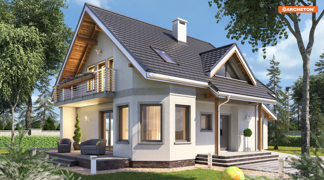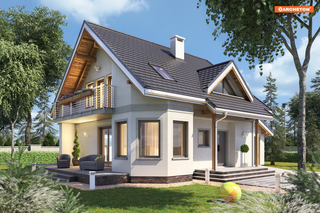 Projekt domu Majka jest jednym z mniejszych w liczącej kilkanaście wariantów Rodzinie Majki. Wśród małych i średnich parterowych domów z użytkowym poddaszem i dobudowanym garażem, warianty te zwracają uwagę sylwetką z trójkątną lukarną i fantazyjnym narożnym ryzalitem na planie ośmioboku. Przełamanie geometrii kąta prostego kształtuje dalej inne elementy bryły: zadaszoną wnękę wejścia na drewnianych słupkach, taras przy ścianie bocznej i ocieniający go balkon. Rozkład wnętrza oparto na sprawdzonych schematach, ale dodano kilka oryginalnych rozwiązań. Pokój dzienny urozmaica ośmiokątna jadalnia przy kuchni i widok na trójbiegowe schody w otwartym holu. Projekt domu Majka jest wersją z kalenicą dwuspadowego dachu równoległą do drogi dojazdowej, ma pełną, małą łazienkę na parterze i nie oferuje przy salonie dodatkowego pokoju tak, jak np. dużo większa Majka Puzon. Miejsce to zajmuje, jak we wszystkich niewielkich wariantach, kotłownia. Strefa nocna na poddaszu w całej Rodzinie Majki, pozwala na indywidualną aranżację prywatnej przestrzeni dla domowników, bo każdy z trzech pokoi ma inny kształt i sposób doświetlenia.