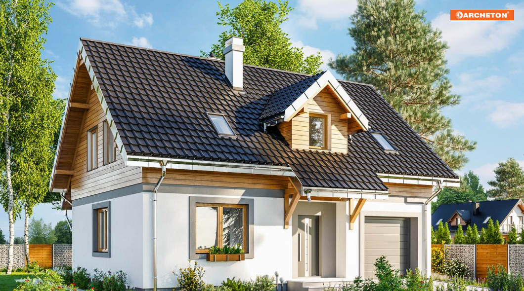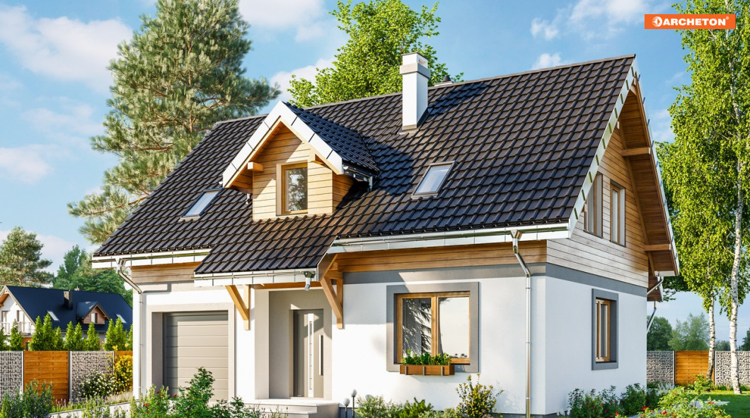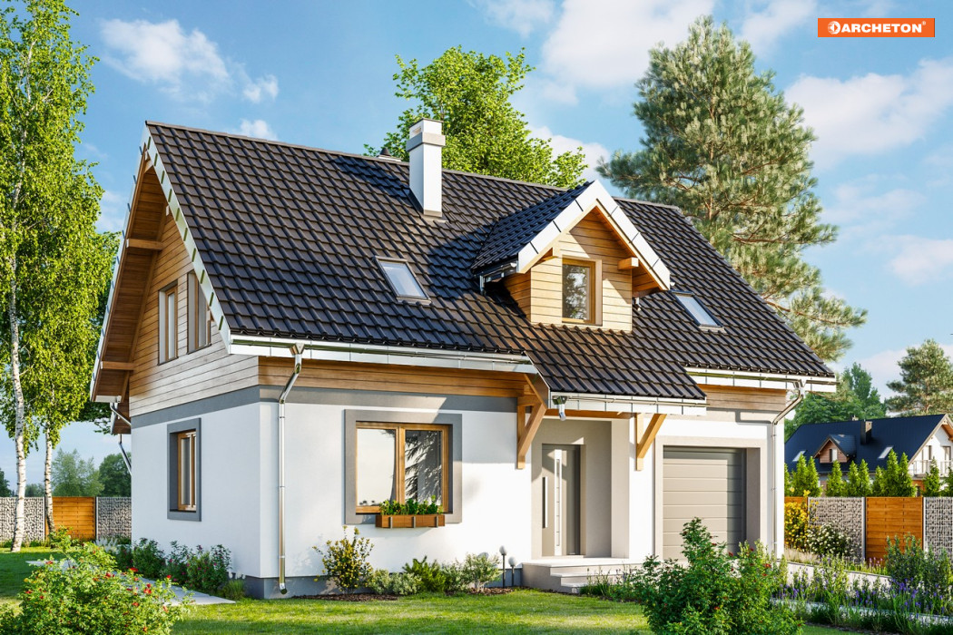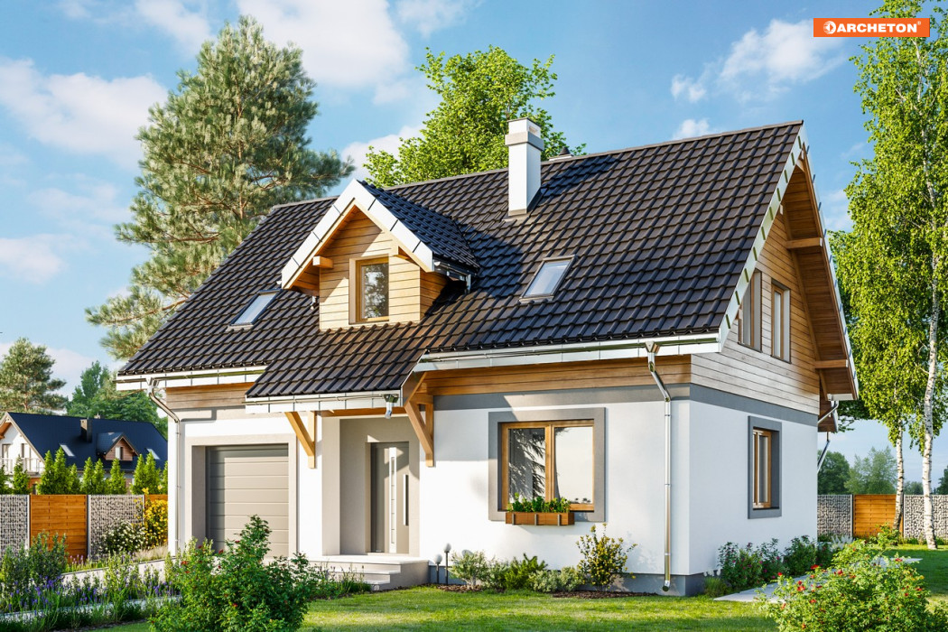 Projekt domu Ptyś należy do rozwiązań parterowych z użytkowym poddaszem i wbudowanym garażem o zdyscyplinowanym, prostokątnym zarysie i dwuspadowym dachu o kalenicy równoległej do drogi dojazdowej. Wśród takich prostych, ekonomicznych rozwiązań z przedziału wielkości 90-100 m2 p.u. Ptysia wyróżnia wejście osłonięte daszkiem z niewielką lukarną. Zastosowano w nim nieskomplikowany, czytelny konstrukcyjnie podział rzutu ścianami nośnymi na trzy strefy funkcjonalne. Wejściowa część z holem i schodami na poddasze rozdziela szerszy trakt gospodarczy i najprzestronniejszy - pokój dzienny. Tak jak w zbliżonych projektach domów Tomir Lux i Tola Mini salon i kuchnia tworzą jedną, swobodną i obszerną, dobrze oświetloną przestrzeń życia rodzinnego. Miejsce pod schodami wykorzystano na przejście do kotłowni z wc, znajdującej się za garażem. Pomieszczenia drugiej kondygnacji to trzy wygodne sypialnie dla 5 osób, w tym główna z własną garderobą i duża, jasna łazienka. Oszczędne rozwiązania architektoniczne w projekcie domu Ptyś podkreśla brak balkonów balkonami w ścianach szczytowych.
