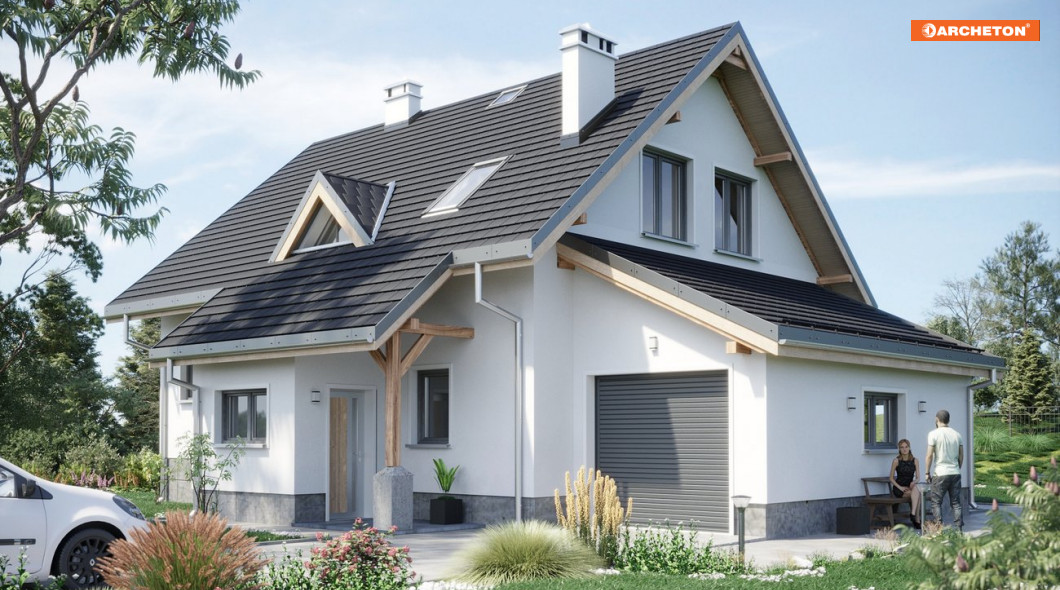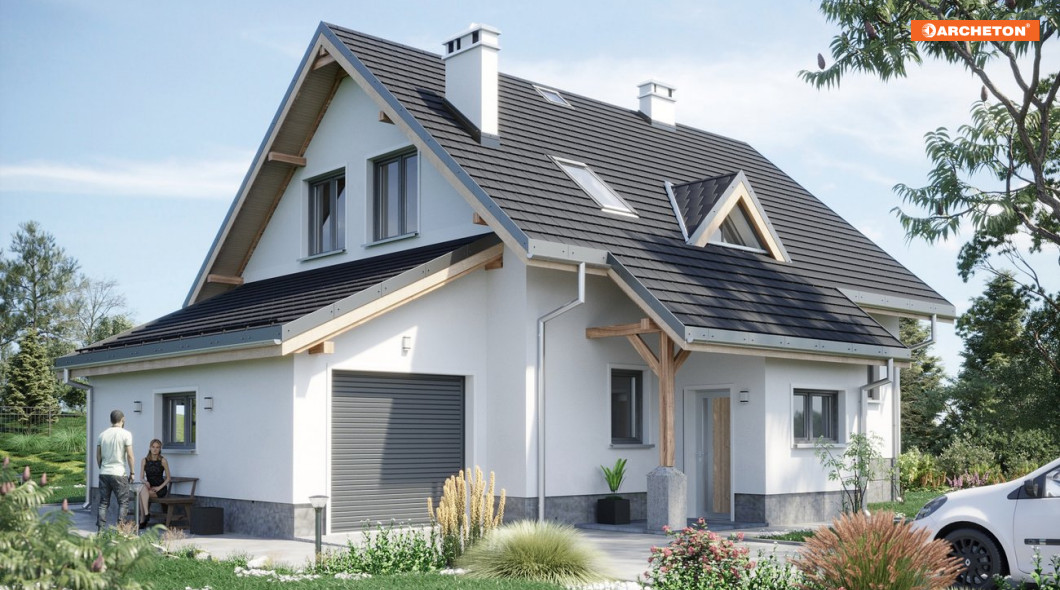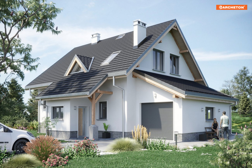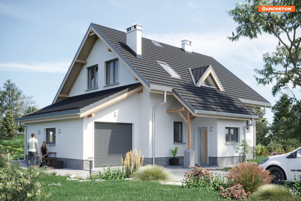 W Rodzinie Kraba znalazły się ekonomiczne domy parterowe z użytkowym poddaszem z zakresu powierzchni 90-120m2. Podobnie jak Fiona i Amelia wykorzystują działkę z lekkim spadkiem ku wjazdowi. Do części mieszkalnej przekrytej dwuspadowym dachem przylega garaż z pulpitową połacią, który, wraz z wejściem do domu, ulokowano niżej o 90cm w stosunku do poziomu parteru. W średniej wielkości projekcie domu Krab Alfa wysunięty przedsionek przekryto, wraz z podcieniem na słupie, przedłużoną połacią głównego dachu z trójkątną lukarną doświetlającą klatkę schodową. Salon i dodatkowy pokój są tradycyjnie oddzielone od kuchni i holu z łazienką ścianą nośną. Umieszczenie schodów w środku części frontowej skutkuje racjonalnym układem poddasza z niewielką powierzchnią komunikacji. Trzy sypialnie i łazienka z wydzieloną pralnią są dzięki temu wyjątkowo ustawne i foremne. Projekty z rodziny Kraba to różne wielkości domu rozplanowanego w taki sam sposób na rzucie, który od proporcji kwadratu w wersji Krab wydłuża się równolegle do kalenicy. Projekt domu Krab Alfa jest niepodpiwniczony, proponuje wydzielenie przy kuchni spiżarni i przewiduje dużo miejsca na szafy w holu.
