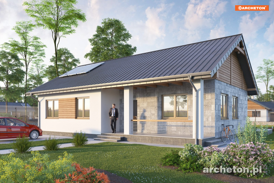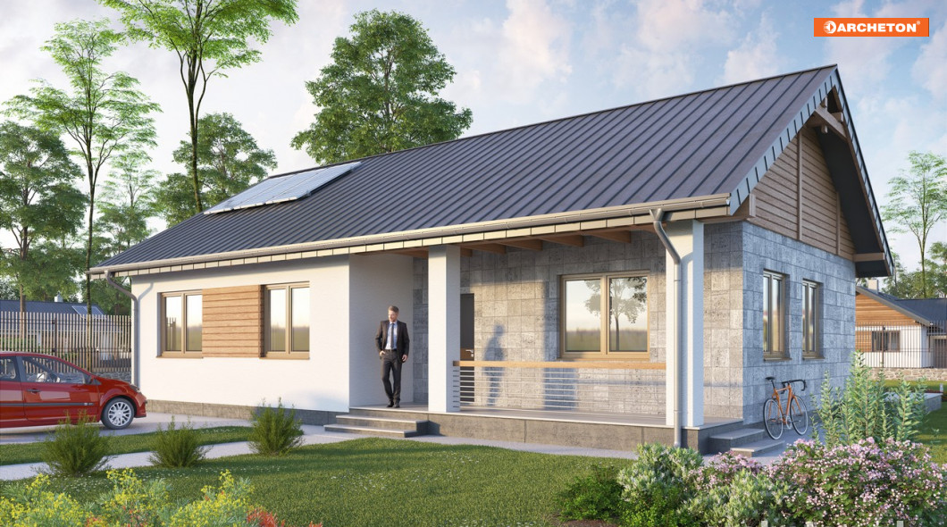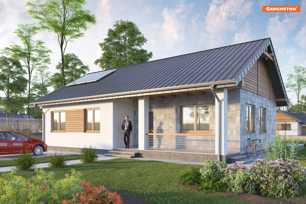 Rodzina Modrzyka to liczna grupa niewielkich parterowych domów bez garażu o przyjaznej naturalnemu krajobrazowi, niskiej, tradycyjnej bryle. Wśród podobnych propozycji z dwuspadowym dachem o kalenicy równoległej do drogi dojazdowej i z prostokątnym rzutem wszystkie warianty Modrzyka wyróżnia wejściowa, podłużna weranda w narożnym podcieniu. Projekt domu Modrzyk Solis jest większym w rodzinie i jako jedyny rozplanowano z myślą o działce skierowanej wjazdem na południe lub zachód. Otwarty pokój dzienny znalazł się przy ścianie frontowej, a kuchnia, zespół łazienki i kotłowni - od strony mniej nasłonecznionej części ogrodu, na tyłach posesji. Strefa prywatna dla czterech osób wyraźniej niż w innych wariantach Modrzyka oddzielona jest od wspólnej części rodzinnej przez przewężenie holu pomieszczeniem wc Prosta architektura w projekcie domu Modrzyk Solis daje swobodę wykończenia elewacji i nadania budynkowi zharmonizowanej z warunkami otoczenia stylistyki.