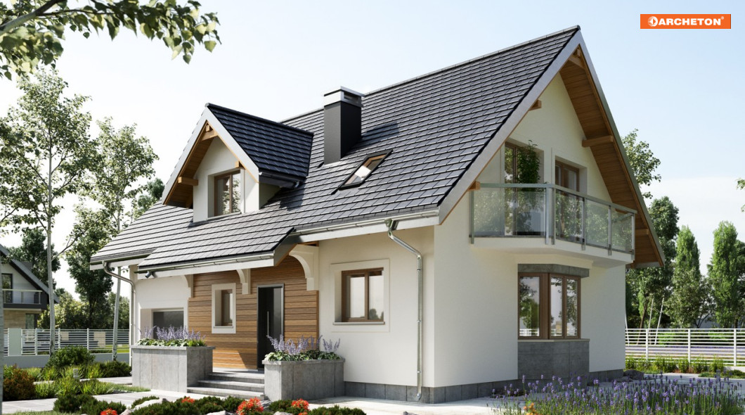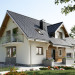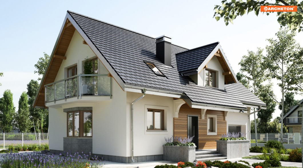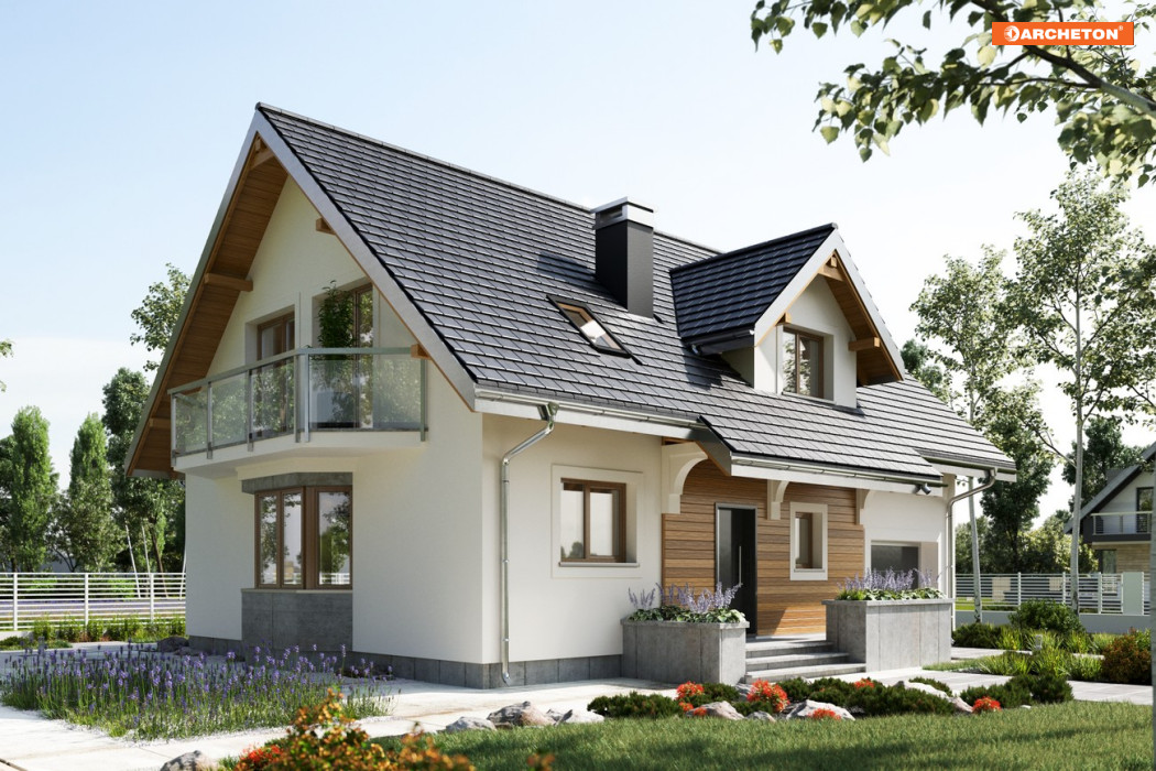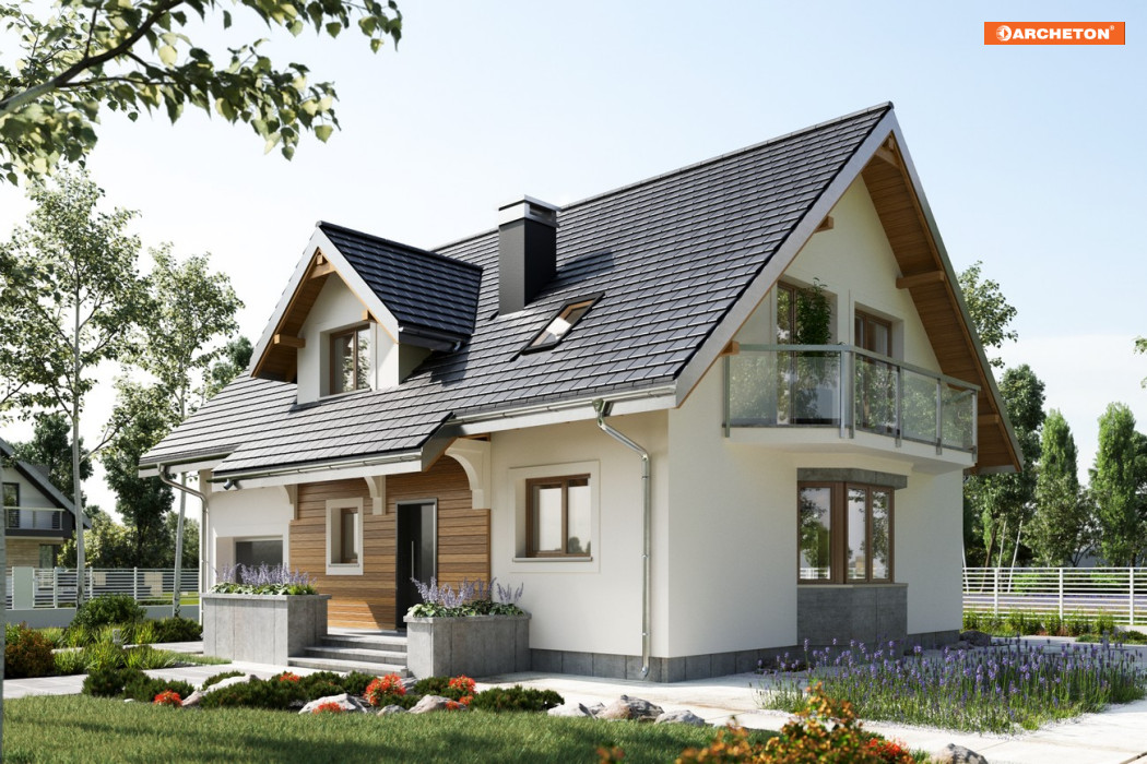 Parterowy dom z użytkowym poddaszem i z częścią gospodarczą przy ściany bocznej to ekonomiczne rozwiązanie dla indywidualnego budownictwa mieszkaniowego. Taki jest projekt domu Zoja Ultra oraz zbliżone do niego propozycje z rodzin: Zoi, Zofii i Heleny z balkonem na ryzalicie w ścianie szczytowej. Wykorzystują miejsce pod dwuspadowym dachem (z kalenica równoległą do drogi dojazdowej) nad całym budynkiem, proponując alternatywne rozwiązania i różne wielkości. Obrys ścian zewnętrznych jest bardzo zwarty co umożliwia oszczędne ogrzewanie. Na parterze, oprócz otwartego salonu, kuchni i dużej łazienki, znajduje się dodatkowy pokój – w sumie: wygodne mieszkanie dla dwojga, oraz przejście pod schodami do garażu. Projekt domu Zoja Ultra ma średnią wielkość i 4 pokoje na poddaszu (do wykończenia np. w drugim etapie) oraz miejsce na spiżarnię przy kuchni. Tak, jak we wszystkich wariantach z pojedynczym garażem, część gospodarcza i mieszkalna mają wspólny dach. Niesymetryczny układ lukarny z obniżonym daszkiem od frontu i położenie kominka odróżnia Zoje od Zofii i Heleny. Zoje i Zofie mają na parterze łazienkę przy sieni z oknem i bardziej zamkniętą kuchnię.