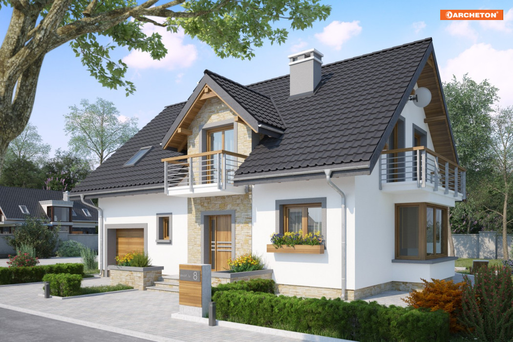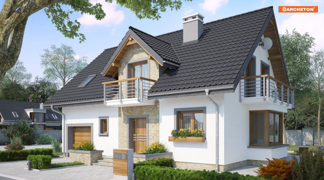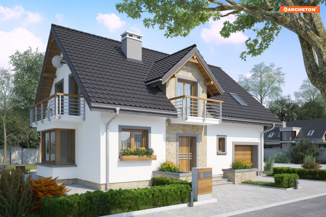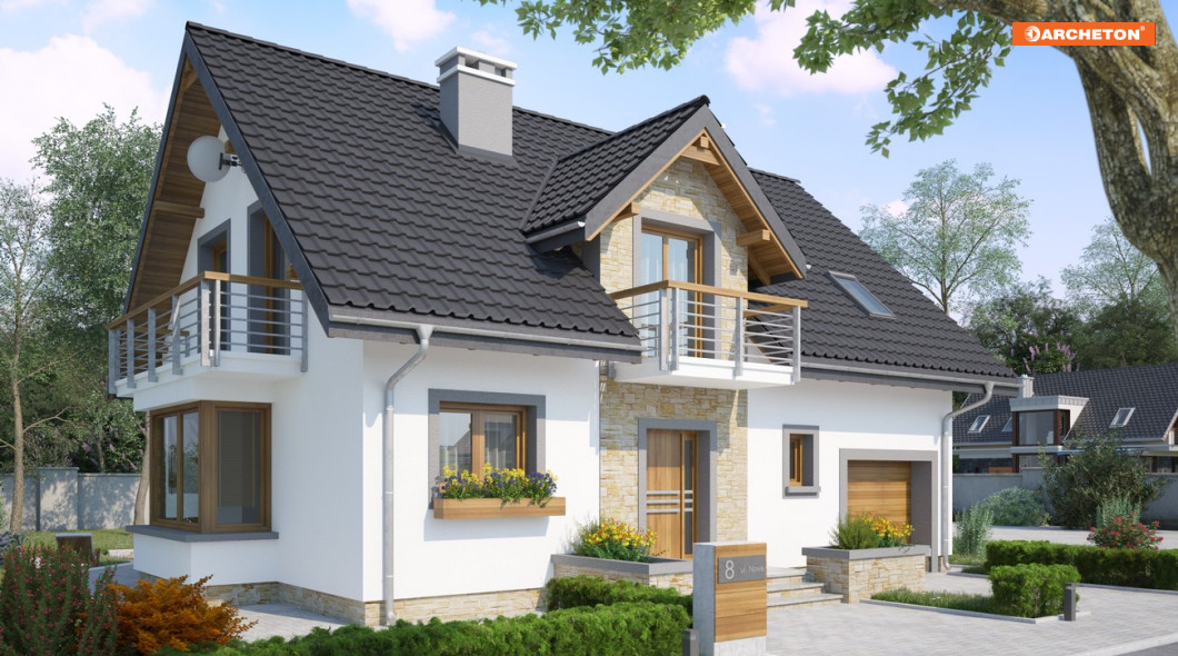 Parterowy dom z użytkowym poddaszem, z częścią gospodarczą przy ściany bocznej to ekonomiczne rozwiązanie dla inwestorów indywidualnych w budownictwie mieszkaniowym. Takie są projekty domów małych i średnich: Zoja, Zofia i Helena z balkonem na ryzalicie w ścianie szczytowej. Wykorzystują przestrzeń pod dwuspadowym dachem nad obiema częściami budynku na strefę nocną. Oddzielono w niej różnicą poziomów główną sypialnię z łazienką. Na parterze jest pokój dzienny z jadalnią, kuchnia oraz przejście pod schodami do garażu i kotłowni. Projekt domu Zofia Neo, średni wielkością w Rodzinie Zofii, oferuje 4 sypialnie na poddaszu, dodatkowy pokój przy salonie, spiżarnię przy kuchni i szafę w sieni. Ma zwarty obrys części mieszkalnej i garażowej oraz wspólny dla nich dach. Symetryczny rysunek lukarny z balkonem nad wejściem frontowym oraz położenie kominka przy kuchni odróżnia ją od projektów z Rodziny Zoi, a łączy z Heleną. W stosunku do Rodziny Heleny, Zoje i Zofie mają odwrócone biegi klatki schodowej, a zamiast garderoby przy sieni proponują większą łazienkę z oknem. Projekt domu Zofia Neo wyróżnia prostokątny zarys ryzalitu jadalni i płyty balkonowych.