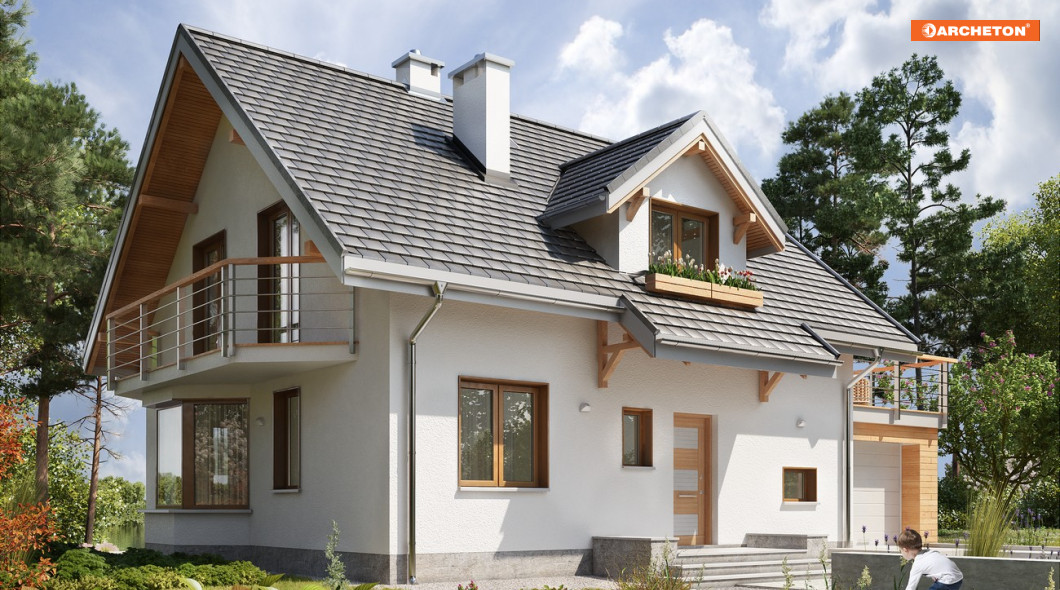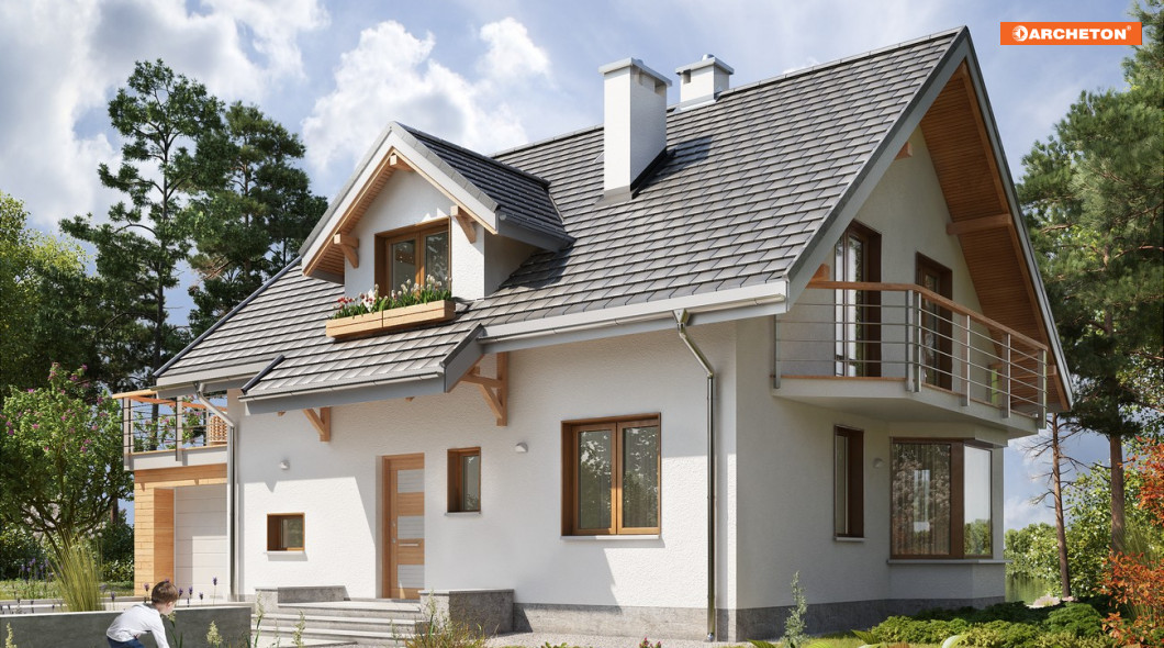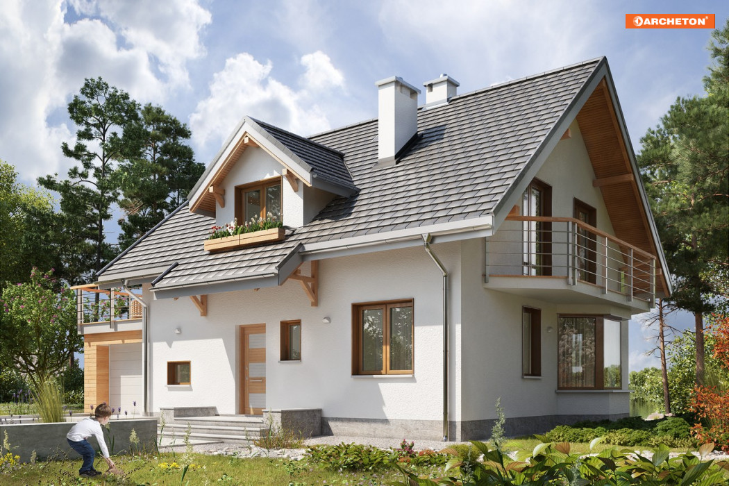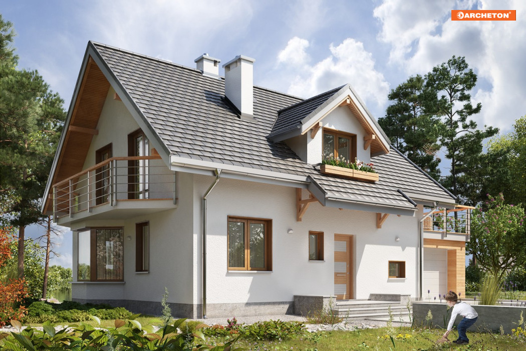 Rodzina Celesty grupuje projekty domów z użytkowym poddaszem i z dostawionym garażem przypominając nieco rozwiązania z Rodzin: Zoi, Zofii i Heleny czy Chabra. Charakterystyczny ryzalit z balkonem w ścianie bocznej został jednak zsunięty z jej osi symetrii ku ogrodowi, a ulokowana w nim jadalnia stanowi część salonu. Projekt domu Celesta-2 jest średni w rodzinie ale tak jak pozostałe wersje i Chaber a odmiennie niż Zoja czy Helena ma tradycyjnie wydzielone pomieszczenia parteru. Środkiem rzutu parteru biegnie ściana nośna zamykając od frontu kuchnię, sień, łazienkę i schody oraz salon z dodatkowym pokojem od ogrodu. Poddasze części mieszkalnej oferuje trzy wygodne sypialnie i zgrabny hol z dużą łazienką. Lukarny w dachu po obu stronach kalenicy i przedłużony częściowo okap nad wejściem nawiązują do sylwetki Zoi. Już jednak taras nad garażem jest rozwiązaniem charakterystycznym tylko dla projektu domu Celesta-2. Zaproponowany zamiast użytkowego poddasza (jak np. w wersji Celesta Bona) dostępny jest z przedpokoju i jednego z pokoi poddasza.