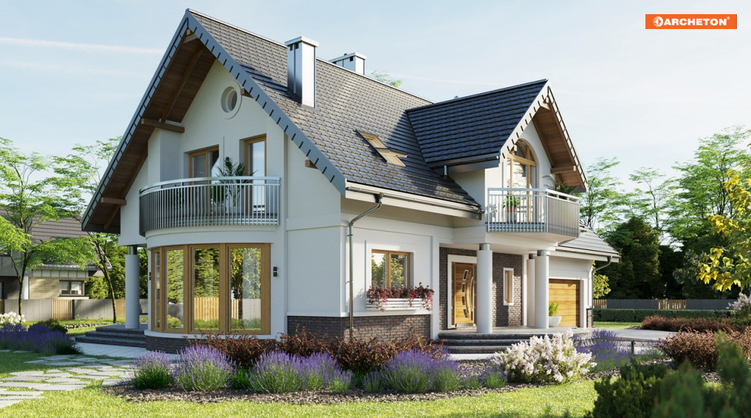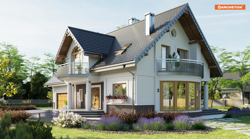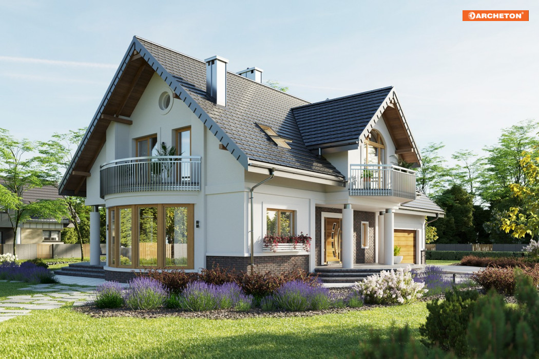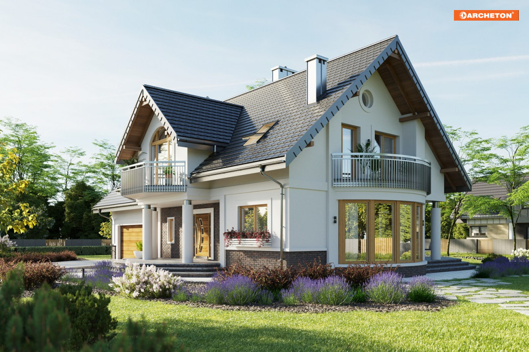 Projekt domu Heliodor należy do najbardziej udanych w ofercie Archetonu. Potwierdza to wyjątkowe zainteresowanie inwestorów, o które nie jest łatwo, kiedy chodzi o projekty domów parterowych z użytkowym poddaszem o tak dużej powierzchni. Projekt domu Heliodor ma zaprojektowaną z rozmachem część wspólną dla rodziny: z otwartą kuchnią, kominkiem i gabinetem na parterze. Użytkowe poddasze mieści przestronną łazienkę i 4 duże sypialnie z balkonami. Główna – dwuosobowa, jest ustronnie oddzielona różnicą poziomów od pozostałych i wyposażona we własną łazienkę i garderobę. Sylwetka domu jest bogata i reprezentacyjna: oprócz komfortowego mieszkania dla 6 osób, zamyka dwustanowiskowy garaż i dużą kotłownię. Najbardziej efektowny element Heliodora, poza frontową lukarną z balkonem i podcieniem, to półkoliste przeszklenie jadalni. Światło i widok z ogrodu dociera aż do otwartego na pokój dzienny holu i schodów prowadzących do strefy nocnej. Migoczące tafle na łuku pod balkonem robią ogromne wrażenie z zewnątrz. Kształtują także absolutnie niepowtarzalny charakter wnętrza pokoju dziennego w Heliodorze i całego domu.