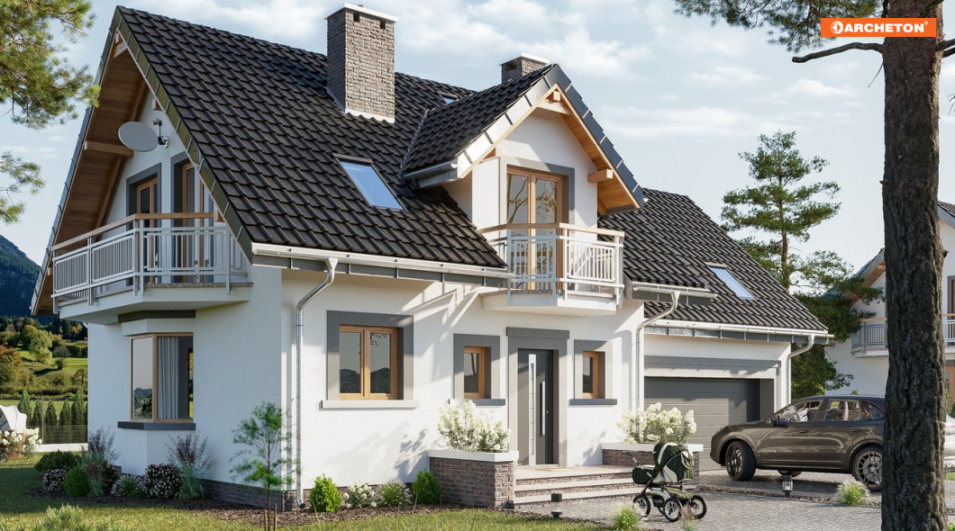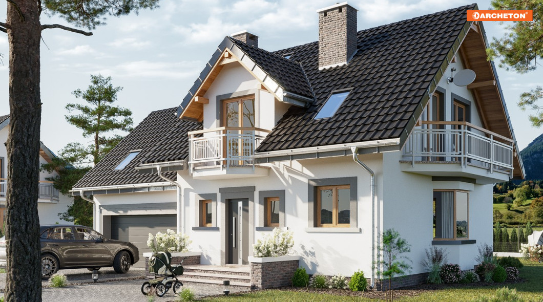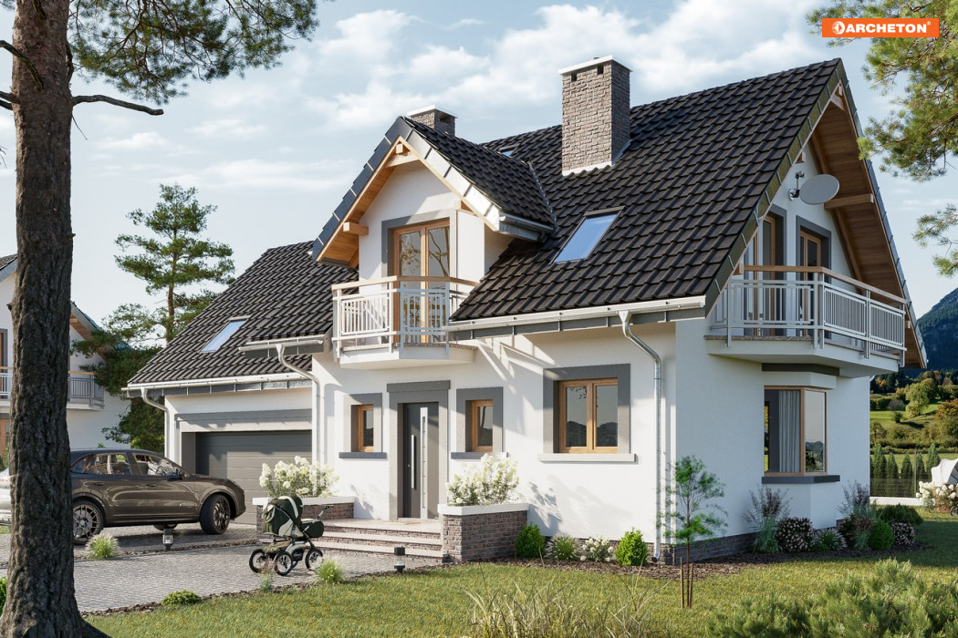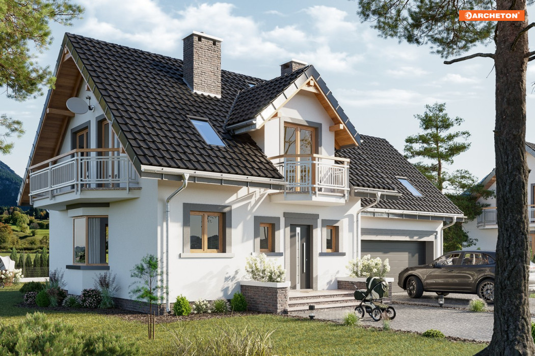 Parterowy dom z użytkowym poddaszem, z częścią gospodarczą przy ściany bocznej to ekonomiczne rozwiązanie dla inwestorów indywidualnych w budownictwie mieszkaniowym. Takie są projekty domów małych i średnich: Zoja, Zofia i Helena z balkonem na ryzalicie w ścianie szczytowej. Wykorzystują przestrzeń pod dwuspadowym dachem nad obiema częściami budynku na strefę nocną. Na parterze jest pokój dzienny z jadalnią, kuchnia oraz przejście pod schodami do garażu i kotłowni. Projekt domu Zofia Prima G2 jest mniejszy w Rodzinie Zofii ale oferuje 4 sypialnie na poddaszu, dodatkowy pokój przy salonie i wygodną, jasną sień. Ma osobne dachy nad wyodrębnionymi w planie częściami: mieszkalną i garażową. Symetryczny rysunek lukarny z balkonem nad wejściem frontowym oraz położenie kominka przy kuchni odróżnia ją od projektów z Rodziny Zoi, a łączy z Heleną. W stosunku do Rodziny Heleny, Zoje i Zofie mają odwrócone biegi klatki schodowej, a zamiast garderoby przy sieni proponują większą łazienkę z oknem. Projekt domu Zofia Prima G2 wyróżnia prosta klatka schodowa i podwójny garaż z dużym zespołem głównej sypialni, przy niewielkich gabarytach pomieszczeń głównej bryły.