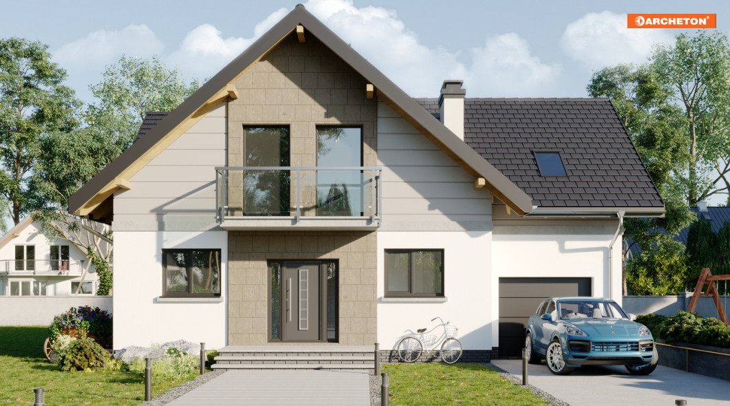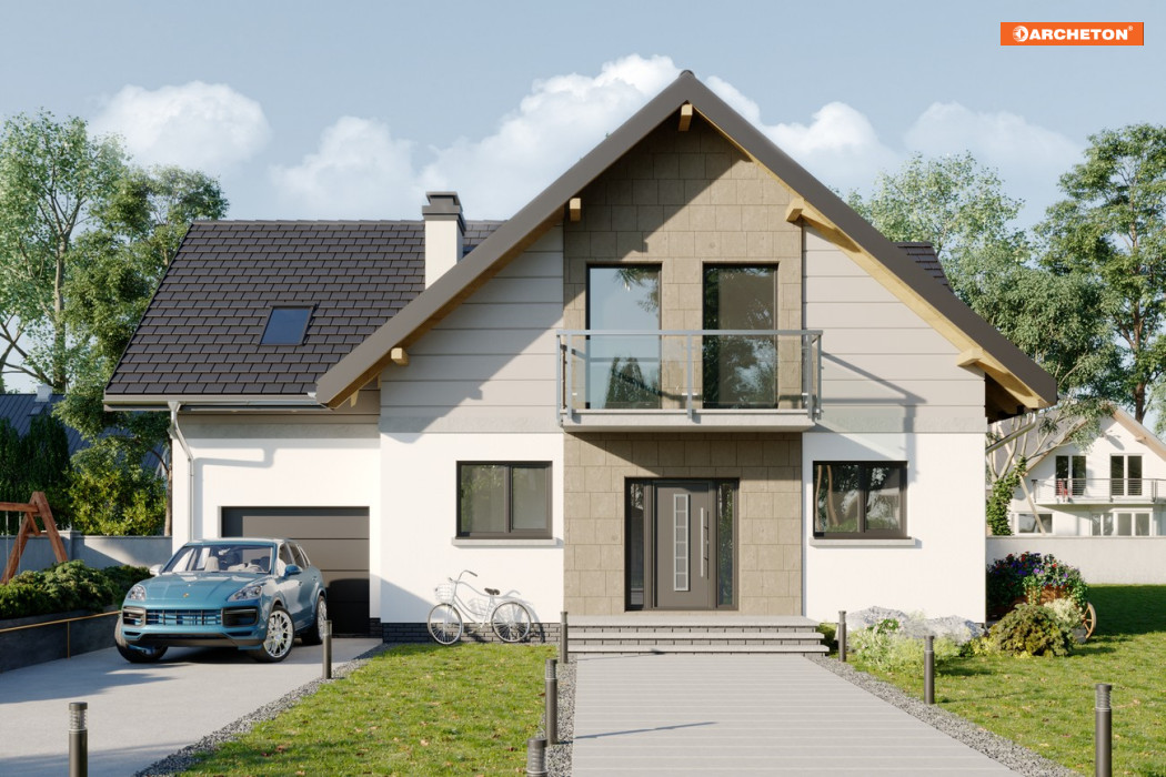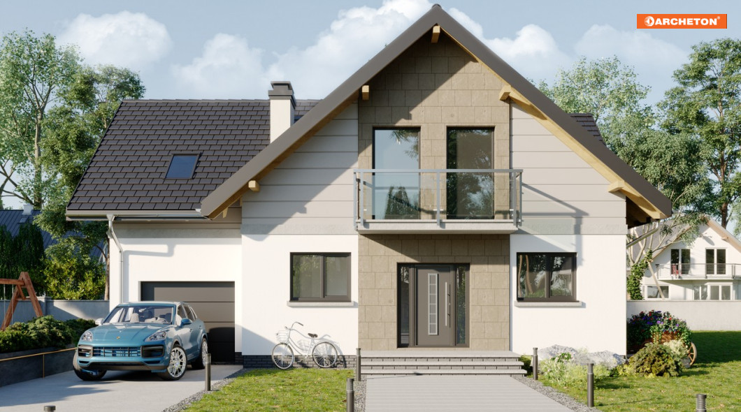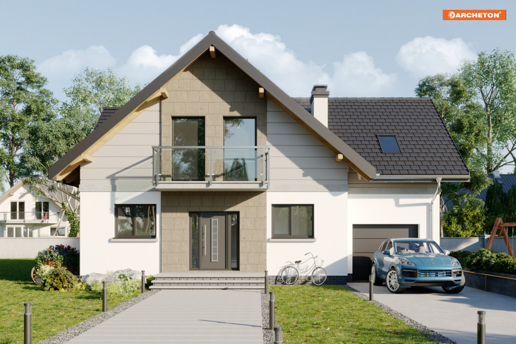 Tryfon to wygodny dom, złożony z części mieszkalnej oraz garażowej, połączonych przejściem w klatce schodowej. Zbudowany jest na planie litery T, ze ścianą szczytową zwróconą na fronton posesji.