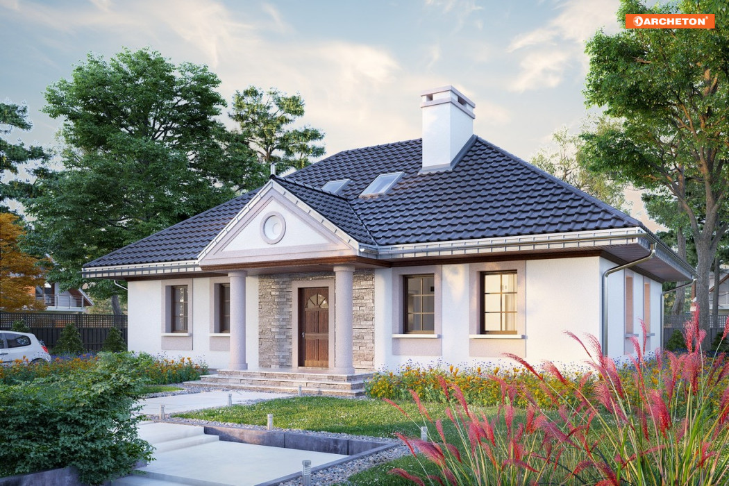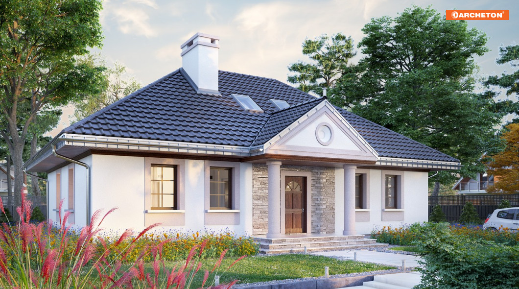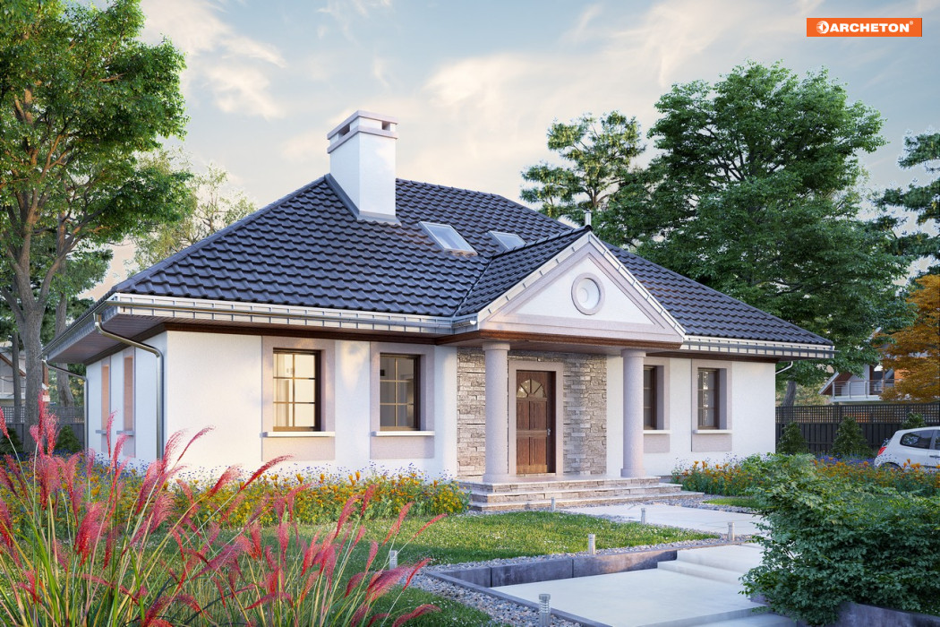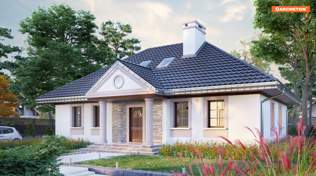 Projekt domu Aleksandria Tura jest największym wariantem rodziny Aleksandrii, bo, jako jedyny, wykorzystuje do celów mieszkalnych przestrzeń pod czterospadowym dachem. Wszystkie propozycje czerpią wprost z historycznego wzorca polskiego dworku, rozrysowanego na energooszczędnym planie prostokąta. Tradycyjna bryła o zbliżonych do autentycznych proporcjach zawiera, zamiast izb w amfiladowym układzie, przestronne, nowoczesne mieszkanie dla 5-6 osób. Część dzienna to otwarty salon z dużą kuchnią, do której przylega kotłownia, spiżarnia i wc. Na strefę nocną na parterze składają się trzy pokoje z łazienką. Dwie dodatkowe sypialnie znajdują się na drugiej kondygnacji, dostępne schodami z otwartej na salon antresoli. Doświetlono je tylko oknami dachowymi, nadając niepowtarzalny charakter wnętrzom i zachowując jednocześnie autentyczny, dworkowy wizerunek sylwetki domu. Historyzujący wdzięk projektu domu Aleksandria Tura podkreślają także kolumnowe portyki. Oba umieszczono rygorystycznie na osi symetrii elewacji frontowej i ogrodowej, inaczej niż w wersji Muza i Rex, a podobnie jak w wersji Aleksandria Bona.