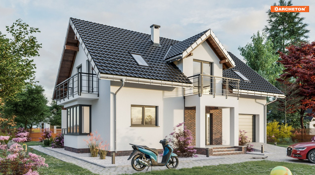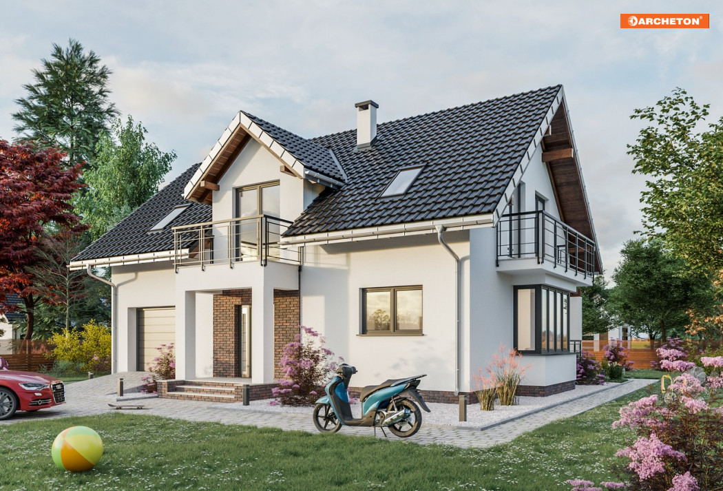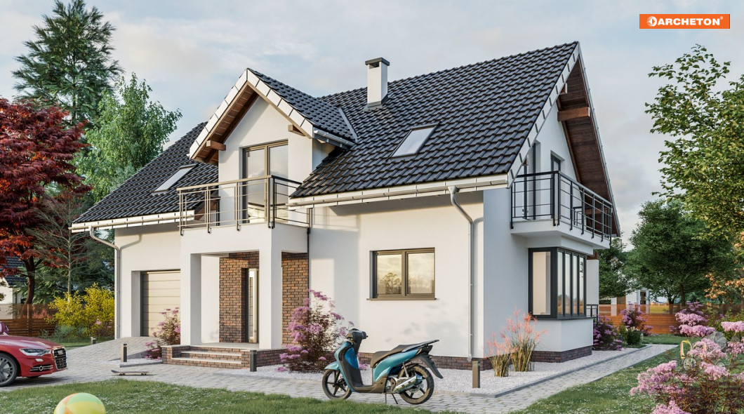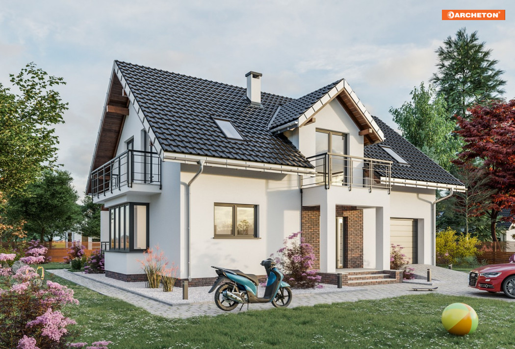 Rodzina Tarota to atrakcyjny wybór prostych, parterowych domów z użytkowym poddaszem i wbudowanym garażem z przedziału wielkości 100-145 m2 p.u. Wszystkie prezentują zwarty, prostokątny rzut oraz wspólną konstrukcję dwuspadowego dachu z kalenicą równoległą do drogi dojazdowej nad częścią mieszkalną i garażową. Symetryczny front akcentuje lukarna w dachu. Projekt domu Tarot Atu jest największy w rodzinie, z gabinetem przy salonie i najobszerniejszą strefą wejściową. Od zbliżonego powierzchnią, układem i bryłą Zoltana Atu odróżnia go bardziej otwarty pokój dzienny z wyspą w kuchni, kształt klatki schodowej i przejście do garażu ulokowane w bardzo przestronnej sieni. Oprócz balkonów w ścianach szczytowych, graniasty ryzalit z jadalnią i słupy wejściowego podcienia, sprawiają, że projekt domu Tarot Atu ma w rodzinie najbardziej dekoracyjną, choć nowoczesną, sylwetkę. Osłonę tarasu ogrodowego zaproponowano w formie pergoli wspartej na masywnych słupach. Poddasze dysponuje czterema wygodnymi sypialniami z dużą łazienką. Główną z nich, wyposażoną w sporą garderobę, oddziela od pozostałych różnica poziomów wynikająca z położenia nad garażem.