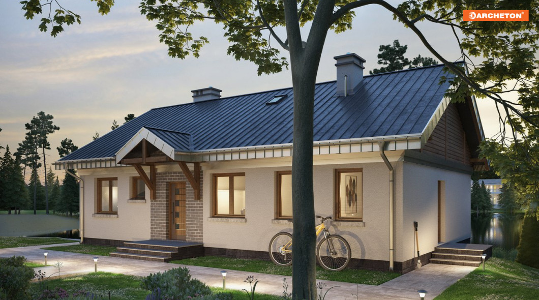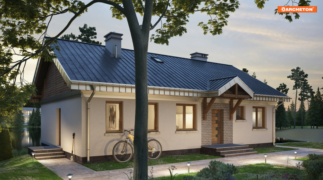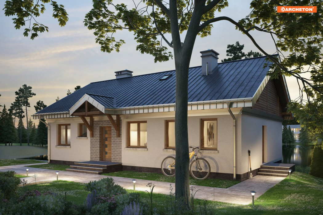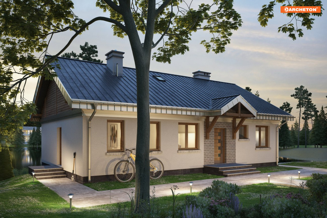 W grupie domów parterowych o powierzchni ok. 90m2 p.u., bez garażu, projekt domu Bolek reprezentuje rozwiązania z prostym dwuspadowym dachem i zwartym, choć wydłużonym rzutem. Dopełnia ofertę małych domów z Rodziny Modrzyka proponując podobną bryłę, równie obszerną kotłownię z osobnym wejściem w ścianie bocznej ale, zamiast wejściowej werandy, ma dwuspadowy daszek nad wejściem. Kalenica przebiega równoległa do drogi dojazdowej, a drzwi główne umieszczono swobodnie, w dłuższej elewacji, inaczej niż w symetrycznie rozwiązanym froncie podobnej Zuzy. Część dzienna jest w Bolku wyraźnie oddzielona od trzech sypialni zamykanym przedpokojem, a jej powierzchnia większa niż w najbardziej zbliżonym Modrzyku Karbo. Rezygnacja z wnęki wejścia (występującej w Modrzyku i Zuzie) umożliwiła ulokowanie dodatkowego wc przy holu. Ułatwia to w projekcie domu Bolek wygodne funkcjonowanie dwóch oddzielnych funkcjonalnie części mieszkania.