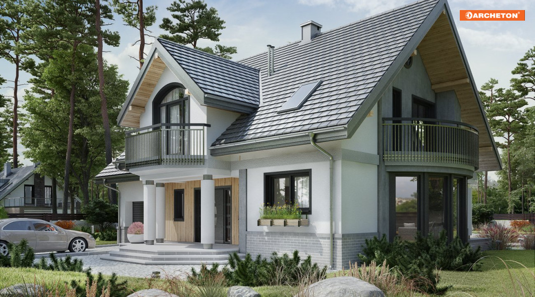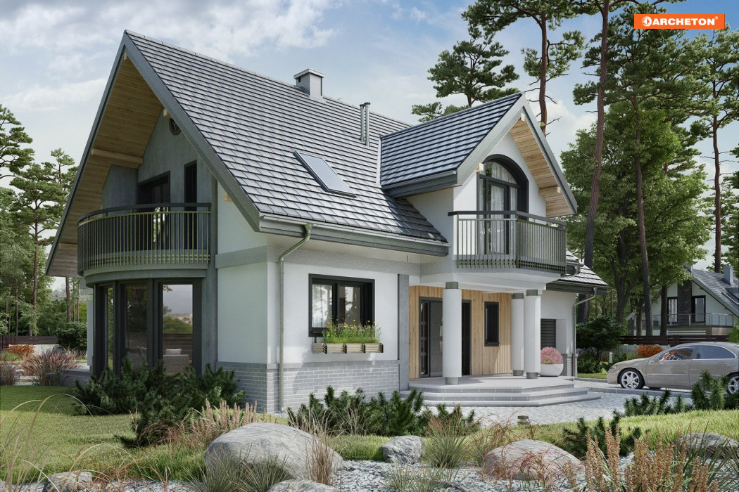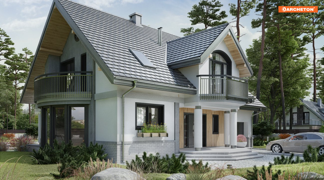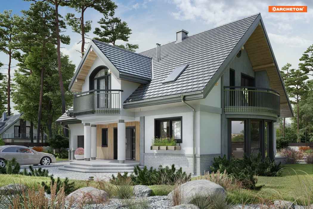 Projekty z Rodziny Heliodora to domy parterowe z użytkowym poddaszem i dobudowanym garażem wyróżniające się rozmachem powierzchni i atrakcyjną bryłą. Projekt domu Heliodor As G1 zachowuje charakterystyczne cechy bogatej sylwetki i układu funkcjonalnego Heliodora Asa proponując jednostanowiskowy garaż. Mieszkanie ma wygodną część rodzinną z otwartą kuchnią, kominkiem i gabinetem na parterze. Połączenie przez sień i garaż prowadzi do dużej kotłowni. Pod dwuspadowymi dachami nad obu częściami budynku mieszczą się 4 sypialnie z balkonami. Główna z nich jest oddzielona różnicą poziomów od pozostałych i wyposażona we własną łazienkę i garderobę. Położona nad okrojoną, w porównaniu z innymi wariantami rodziny, częścią garażową, ma mniejszą powierzchnię, a pralnię przewidziano przy ogólnie dostępnej łazience poddasza. Najbardziej efektowny element w projekcie domu Heliodor As G1, poza frontową lukarną z podcieniem, to półkoliste przeszklenie jadalni w ścianie bocznej. Światło i widok z ogrodu dociera aż do otwartego na pokój dzienny holu. Tafle okien na łuku pod tarasem z loggią nadają niepowtarzalny charakter architekturze całego domu.