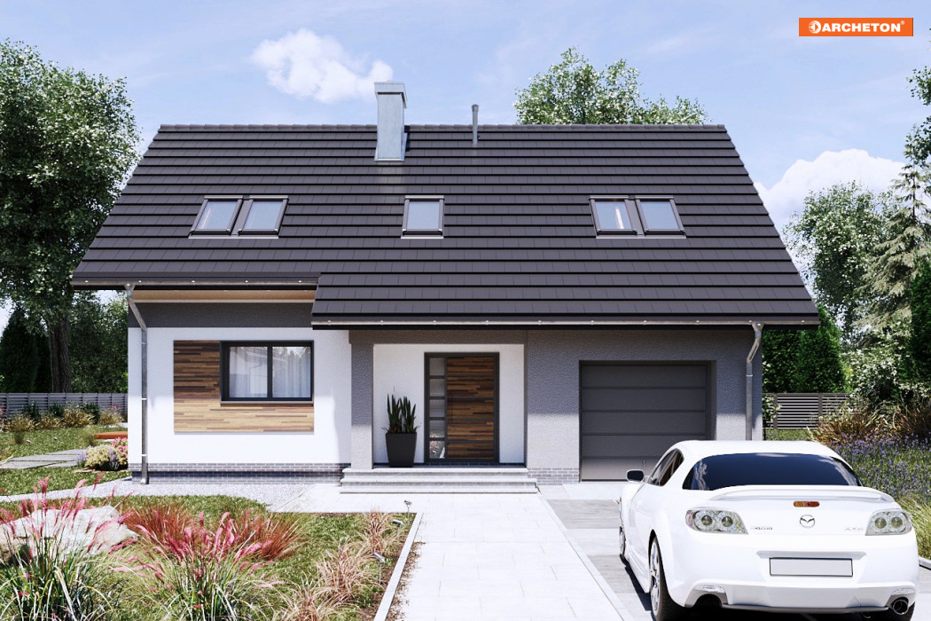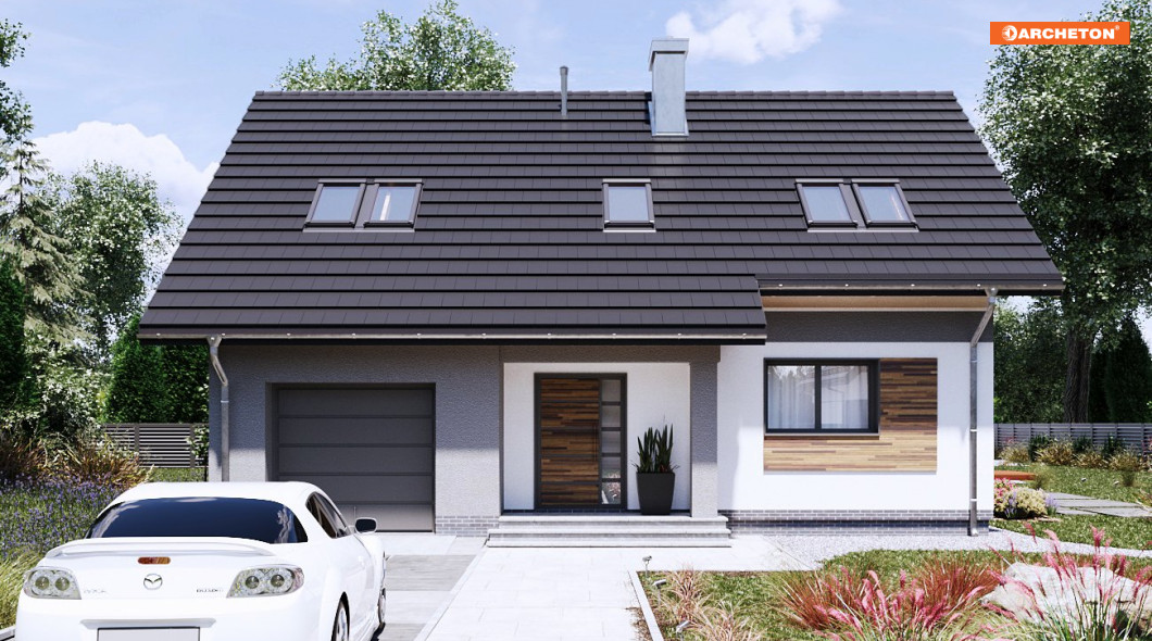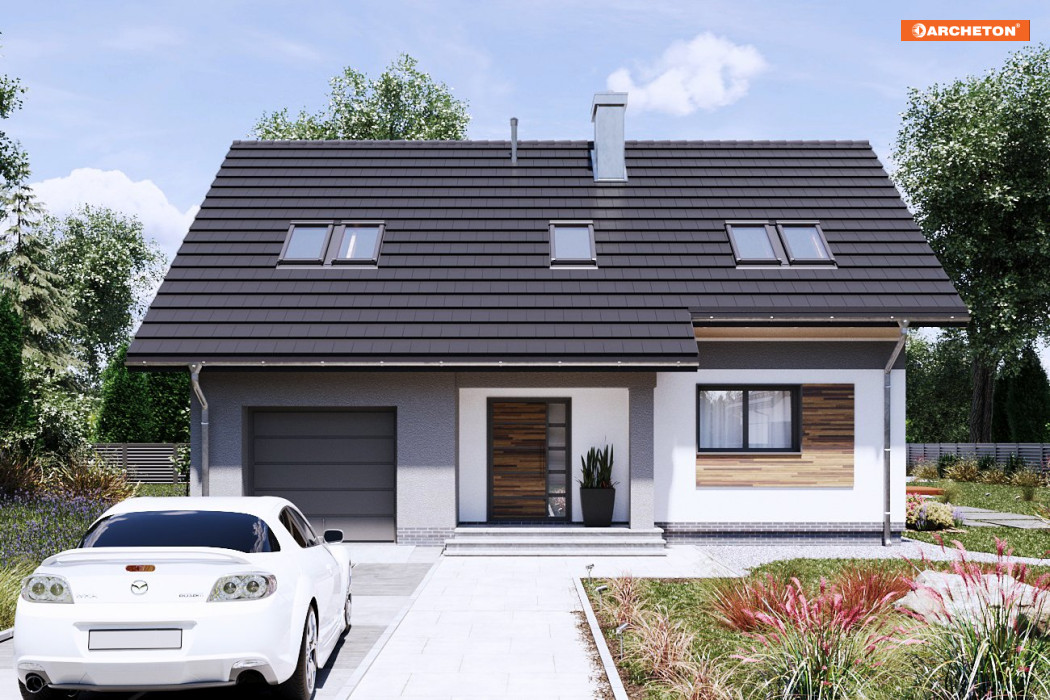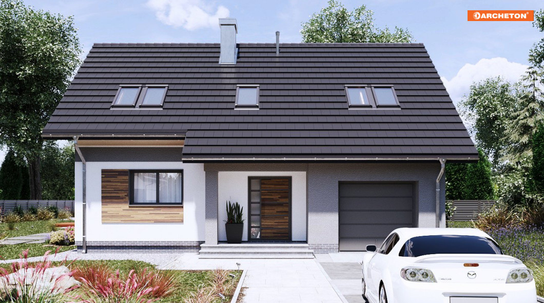 Najmniejszy z rodziny Skarbka – projekt domu Skarbek Neo ma wszelkie cechy taniego, ładnego i funkcjonalnego domu. Zwarty prostopadłościan mieści mieszkanie i wysunięty ku frontowi garaż - wszystko pod dwuspadowym dachem. Przy niewielkiej powierzchni na parterze zaproponowano przestrzenne rozwiązanie z otwartym pokojem dziennym i część gospodarczą z dużą kotłownią. Powierzchnia kuchni pozwala na wydzielenie spiżarni. Pod schodami zmieściło się praktyczne pomieszczenie gospodarcze, w niewielkiej łazience - prysznic, a w sieni – głęboka szafa. Podobnie starannie rozplanowano strefę prywatną. Na poddaszu są cztery sypialnie, wygodna łazienka i pralnia dostępne, bez strat powierzchni, z niewielkiego przedpokoju. Projekt Skarbek Neo, tak jak największa w rodzinie małych domów Skarbka wersja Rex, proponuje prosty detal architektoniczny. Elewacje bez balkonów są energooszczędne, a dzięki wysokim oknom z barierką doświetlającym poddasze - eleganckie. Przedłużone częściowo okapy formują od frontu zaciszną wnękę wejścia , a od ogrodu osłonę na drewno do kominka. Bogatsze w formie są w rodzinie Skarbka wersje Mini i Karo z dachem czterospadowym.