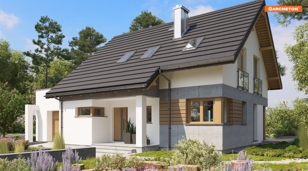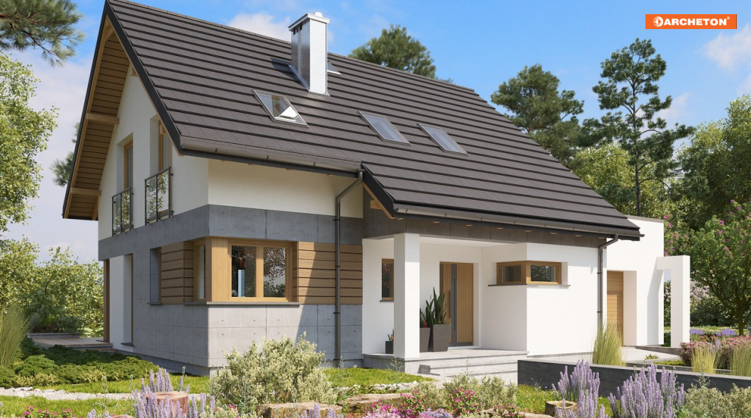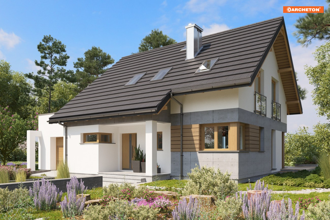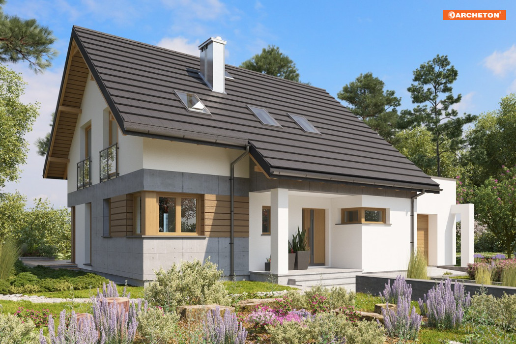 Domy parterowe z użytkowym poddaszem, z dostawionym garażem, o powierzchni użytkowej ok.120m2 to liczna, różnorodna grupa wśród propozycji Archetonu. Większość z nich, tak jak projekt domu Pamela, ma dość zwarty kształt i dwuspadowy – ekonomiczny dach. Pamelę wyróżnia w tej grupie detal frontu. Wysunięta z narożnika dłuższej elewacji bryła klatki schodowej tworzy wnękę dla tarasiku wejściowego, zadaszoną przedłużonym w tej części okapem na słupie. Pulpitową połać nad garażem z kotłownią zasłania od strony wjazdu ścianka attykowa. Plan parteru mieszkania składa się z dwóch symetrycznych rozmiarami części. We frontowej znalazła się, oprócz kuchni, strefa komunikacji łącząca mieszkanie z częścią gospodarczą. Od ogrodu ulokowano salon i dodatkowy pokój – łatwe do połączenia w jedno większe wnętrze, oddzielone jednak wyraźnie od holu ściana nośną. Układ ten powtarza poddasze oferując w strefie prywatnej, po obu stronach kalenicy, sypialnie, łazienkę i pralnię. Przestrzeń poddasza od strony ogrodu pozwala wydzielić trzy małe lub dwa większe pokoje. Brak lukarn i balkonów oraz narożne okna w projekcie domu Pamela podkreślają nowoczesną prostotę budynku.