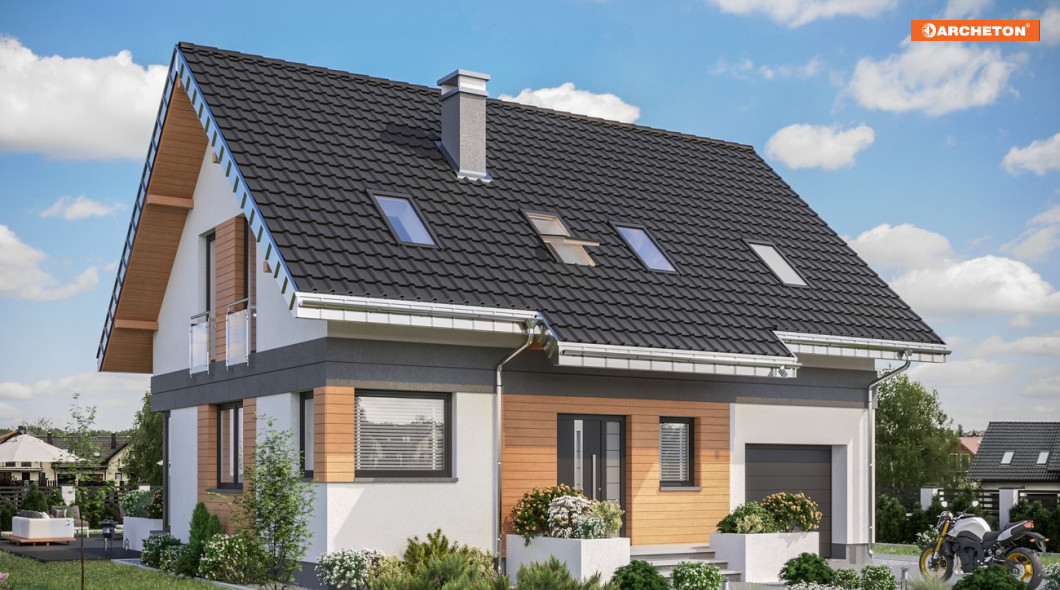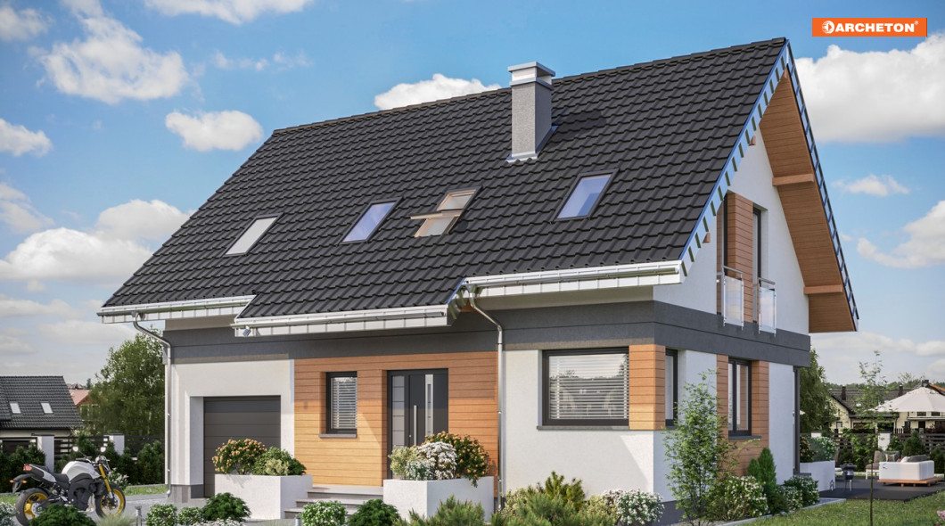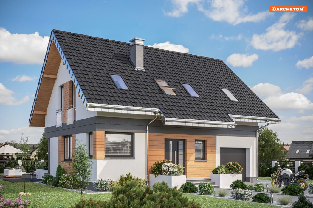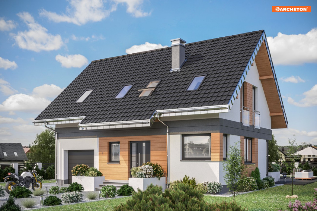 Projekt domu Zojka Neo jest jednym z dwóch najmniejszych w rodzinie Zojki, stworzonej z myślą o najczęstszych oczekiwaniach inwestorów planujących budowę małego domu z użytkowym poddaszem i wbudowanym garażem jednostanowiskowym. Wersja Neo i jeszcze mniejszy wariant Nano są najprostsze w rodzinie. Zrezygnowano w nich z charakterystycznych elementów większych Zojek: ryzalitu w ścianie bocznej i lukarny od frontu. Niezmieniona pozostała koncepcja ekonomicznej bryły, która pod jednym, dwuspadowym dachem zamyka część mieszkalną i gospodarczą. Na parterze rozlokowano strefę dzienną i garaż z kotłownią. Jednoprzestrzenny układ kuchni i salonu z częściowo otwartymi schodami nie przewiduje już w projekcie domu Zojka Neo dodatkowego pokoju tak, jak duże warianty. W to miejsce przeniesiono kominek i racjonalnie zblokowano jego trzony z kominem kotłowni, położonej za garażem. Cztery sypialnie na poddaszu są niewielkie ale utrzymano ustronny charakter głównej z nich, która ma własną łazienkę i dostępna jest z półpiętra. Detale architektoniczne: dach bez lukarn, brak balkonów i narożne okna wpisują się w energooszczędne i nowoczesne trendy stylistyczne.