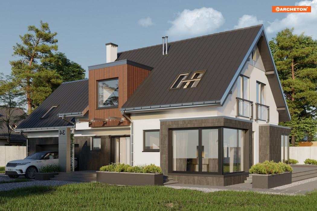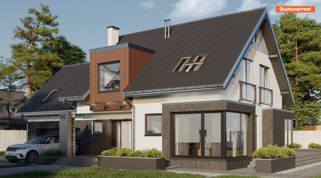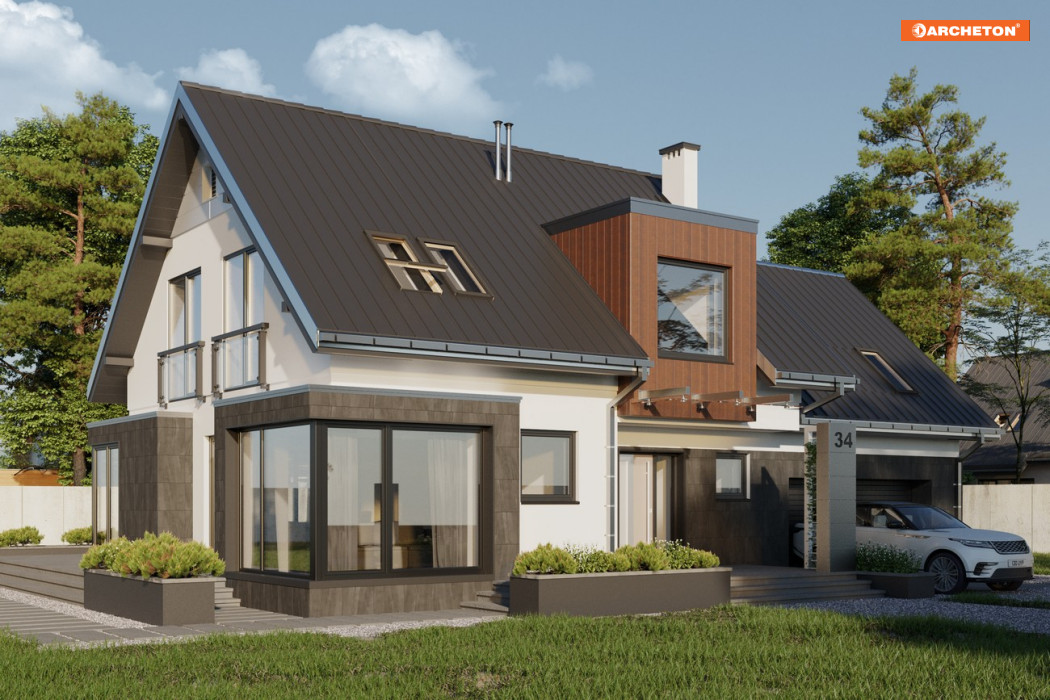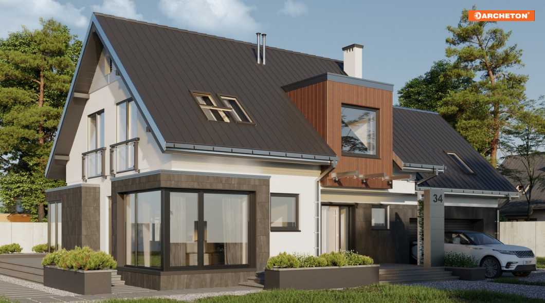 Eksperymenty z detalami architektonicznymi sprawiają, że nawet tradycyjny, w ogólnym zamyśle, dom parterowy z użytkowym poddaszem, nabiera współczesnego wyrazu. I taki właśnie: nowoczesny i klasyczny jednocześnie, jest projekt domu Solaris. Przestronny parter ukształtowano w nim jako wspólną, otwartą przestrzeń. Delikatne ramy, dla podziałów funkcjonalnych, tworzą jedynie, wyraziście zarysowane, narożniki salonu i jadalni. Zostały one całkowicie przeszklone i wysunięte w głąb ogrodu. Wpuszczają do domu więcej światła budując iluzję przenikania się wnętrza i krajobrazu. Wydzielony ścianami jest jedynie gabinet, a w drugiej części parteru - dwustanowiskowy garaż z kotłownią. Na poddaszu ulokowane zostały 4 sypialnie, pokój kąpielowy i pralnia. Wyjątkową prywatność zapewnia główna sypialnia na półpiętrze: z własną łazienką i garderobą. Projekty domów z użytkowym poddaszem, o takiej nowoczesnej stylistyce i rozległych tarasach, rzadko proponują balkony. Dlatego w projekcie domu Solaris, z geometrycznym kształtem przeszkleń parteru i lukarn w dachu, zharmonizowano prosty rysunek gładkich elewacji..