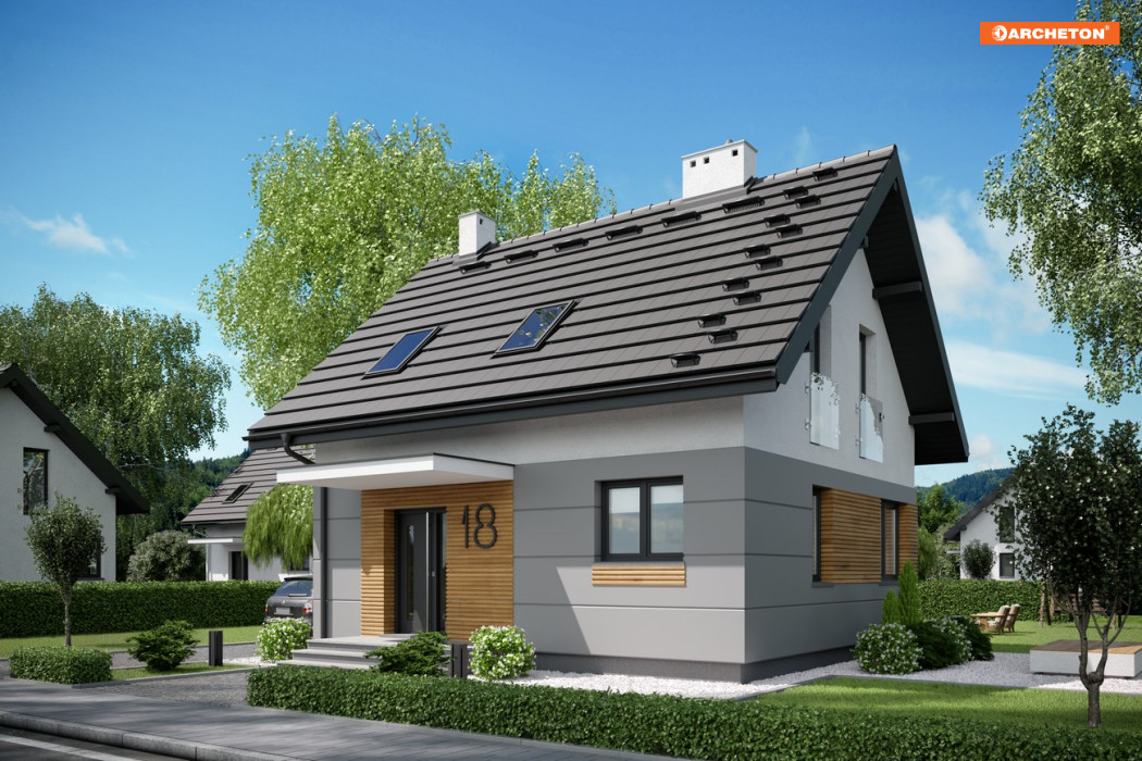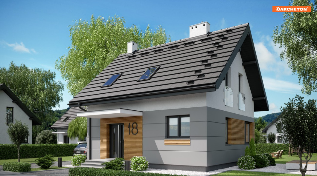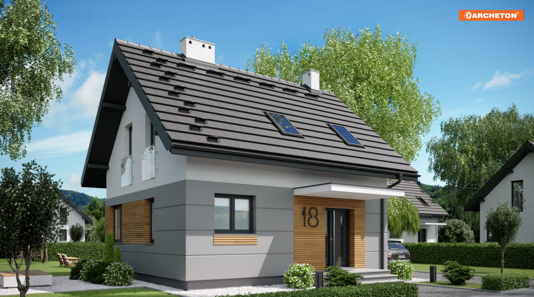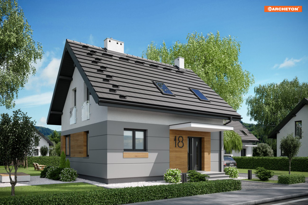 Niespełna 75 m2 to, jak dotąd, najmniejsza powierzchnia, na której Archeton zaproponował projekt domu parterowego z użytkowym poddaszem. Prawie kwadratowy rzut Lizy wypełnia na parterze otwarta strefa dzienna z kominkiem, a na poddaszu trzy niewielkie ale ustawne sypialnie (można je zamienić innym układem ścian działowych na dwie większe). Na dole zmieściła się jeszcze wygodna sień z głęboką szafą, wc pod schodami i pralnia z kotłem gazowym. Miłą ekstrawagancją w domu o tak skromnych rozmiarach jest rozwiązanie strefy nocnej z dużą łazienką.