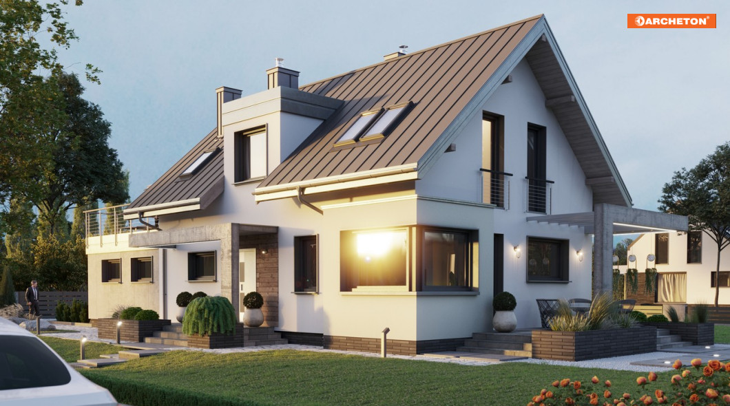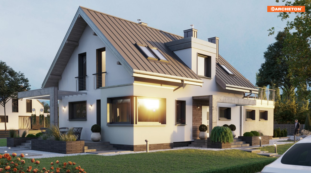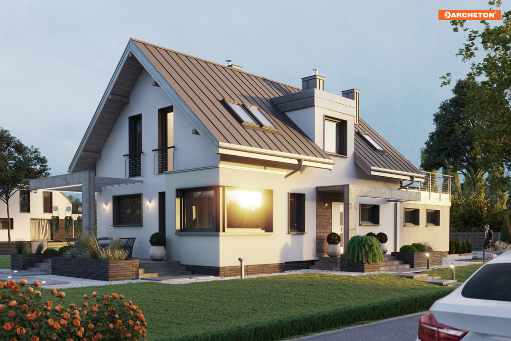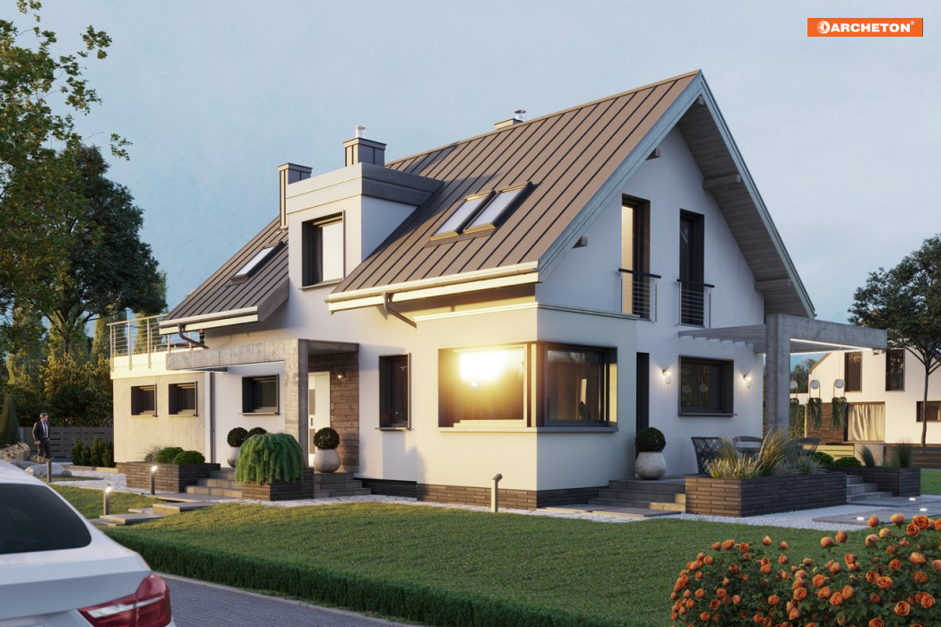 Powierzchnie głównych pomieszczeń są standardowe, ale doskonale uzupełniają je przestrzenie gospodarcze z dużą kotłownią przy wejściu na czele. Na parterze, oprócz otwartej strefy dziennej z atrakcyjną jadalnią w narożnym ryzalicie, zmieściła się pod schodami pralnia, a na końcu holu zaciszny gabinet. Pozornie skromne poddasze też ma swojego asa w rękawie: rozległy taras nad garażem, dostępny z głównej sypialni z garderobą. Piękna łazienka doświetlona została oknem w płasko przekrytej lukarnie. Projekt domu Lutek wyróżniają także: efektowne przeszklenie w salonie oraz obiegająca narożnik z tarasem pergola. Niesie ją wspornikowa obejma na słupach, kontynuująca formę płaskiego daszku nad wejściem frontowym.