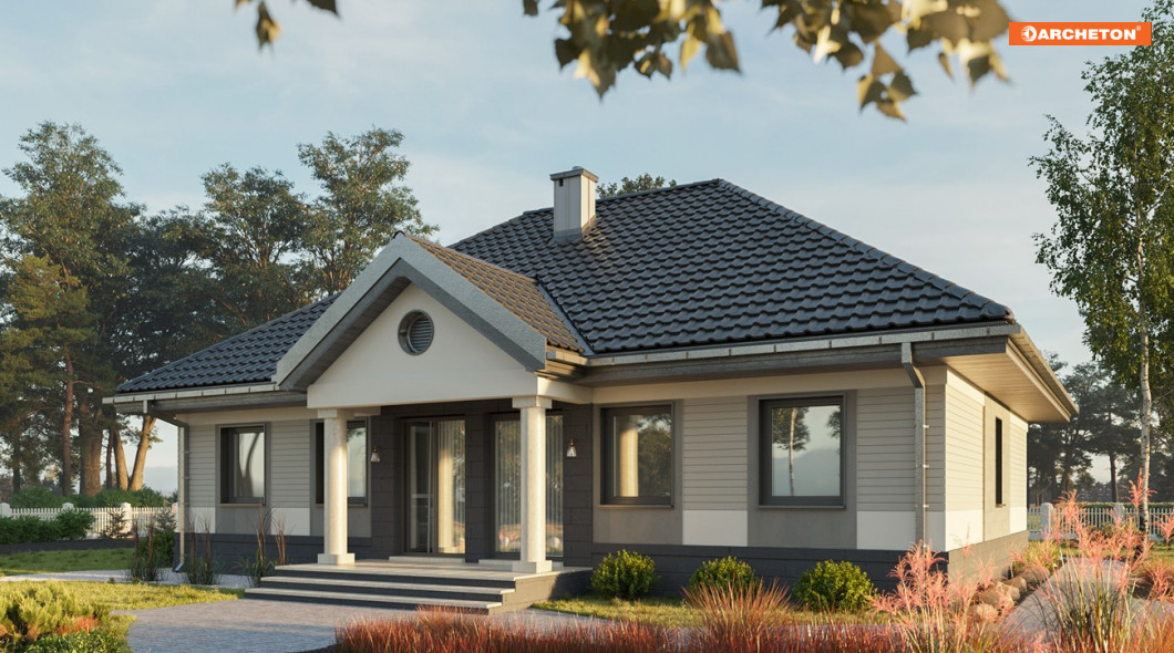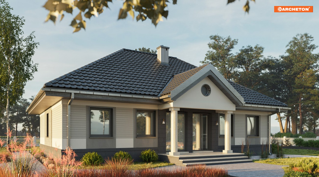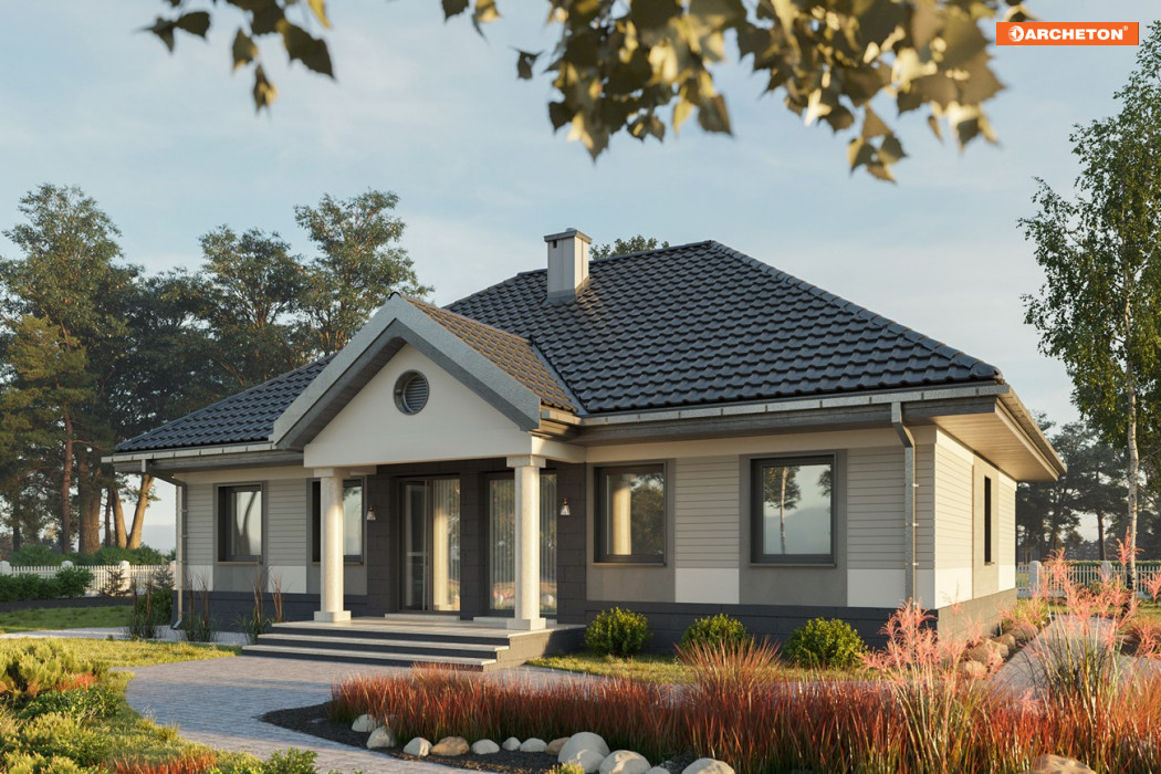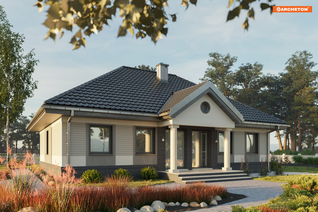 Architektura polskiego dworku zawsze inspiruje tworzących projekty domów jednorodzinnych. Prostokątny rzut jest energooszczędny, a nieużytkowa przestrzeń pod czterospadowym dachem w sposób naturalny (a więc najbardziej ekonomiczny!) izoluje od chłodów i od upału. Aleksandria to dom parterowy, w którym wykorzystano racjonalizm i prostotę tej starej koncepcji, rezygnując z eksperymentowania formą. Bezpretensjonalność Aleksandrii podkreśla symetria bryły, zaznaczona od frontu i od ogrodu kolumnowymi portykami. Współczesnymi akcentami w projekcie domu Aleksandria są duże okna bez podziałów oraz nowoczesne wnętrze. Zamiast izb w amfiladowym układzie, zaprojektowano przestronne mieszkanie dla 4-5 osób. Część dzienna składa się z otwartego salonu, kuchni z kotłownią i spiżarnią oraz niewielkiej łazienki. Część nocna to cztery pokoje i kolejna łazienka, dostępne z korytarza wyprowadzonego z narożnika pokoju dziennego. Dość duży, jak na dom parterowy, kąt nachylenia dachu dodaje autentyzmu stylowej sylwetce Aleksandrii.