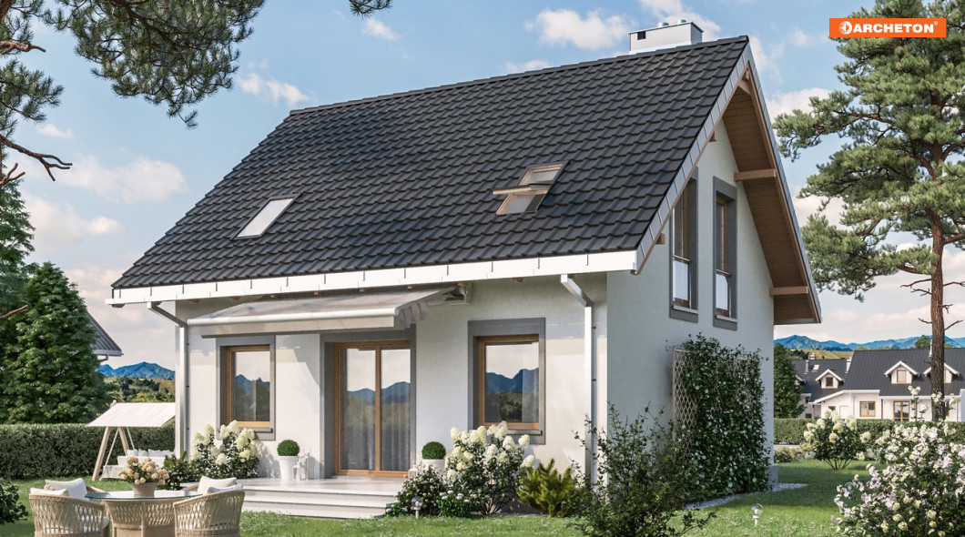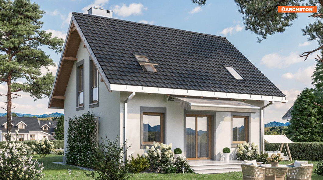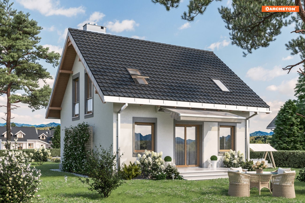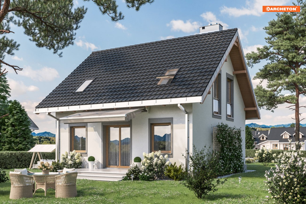 Projekt domu Staś to jedyna propozycja z tego zakresu wielkości domów bez garażu, w której kwadratowy plan przekryto dwuspadowym dachem z kalenicą równoległą do drogi dojazdowej. Proporcje rzutu decydują o tym, że przeznaczona być może na wąską działkę. Koncepcję wyróżnia ponadto zabudowany, klasyczny fronton z przedsionkiem wypchniętym z elewacji wejściowej. Poza tym detalem, architektura budynku jest prosta, a elewacje skomponowane symetrycznie, co podkreśla zwarty kształt sylwetki.