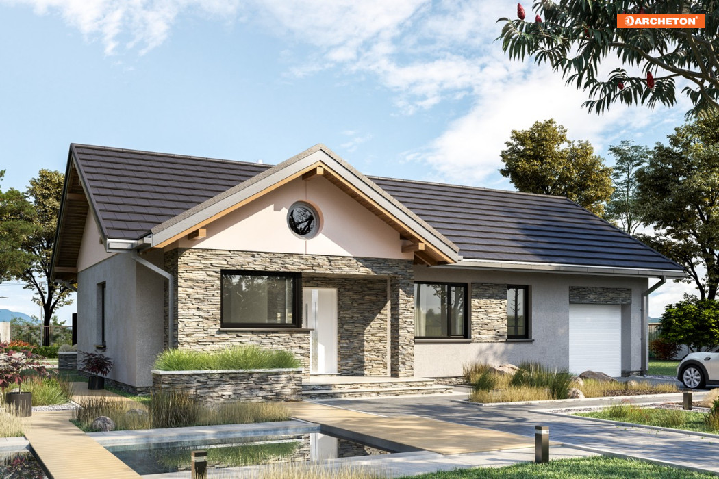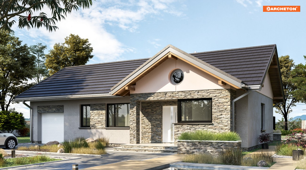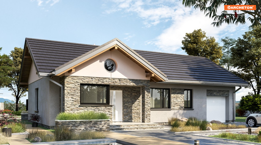Parterowe domy z garażem o powierzchni ok. 95m2 prezentują w naszej ofercie koncepcje na planie prostokąta (Bytomir) lub w kształcie litery L (Żuczek). Projekt domu Mikrus wyróżnia się pod tym względem. Zasadnicza bryła jest prostopadłościanem z jednym dwuspadowym dachem nad częścią mieszkalną i gospodarczą, ale strefę dzienną, tuż przy jednej ze ścian bocznych, podkreślają na osi front-ogród dwie duże lukarny. Jedna akcentuje wnęką i narożnym oknem kuchni wejście, druga – ogrodowa powiększa salon. Zarysowane w ten sposób dodatkowe krótkie skrzydła wzbogacają sylwetkę domu, co podkreśla skontrastowana z jasnym korpusem ciemna okładzina. Oprócz otwartego pokoju dziennego z wysokim przeszkleniem i z kominkiem, usytuowanym w centrum planu (wygoda dla dystrybucji gorącego powietrza), dla czteroosobowej rodziny przewidziano trzy sypialnie z dużą łazienką i osobnym wc. Obie strefy domu łączy długi przedpokój zamknięty jadalnią przy kuchni. Pomieszczenia są oszczędne, ale w zamian projekt domu Mikrus ma obszerną sień z głęboką szafą i rozbudowaną część gospodarczą, która, poza garażem z dużą kotłownią, oferuje wygodną, przechodnią pralnię.