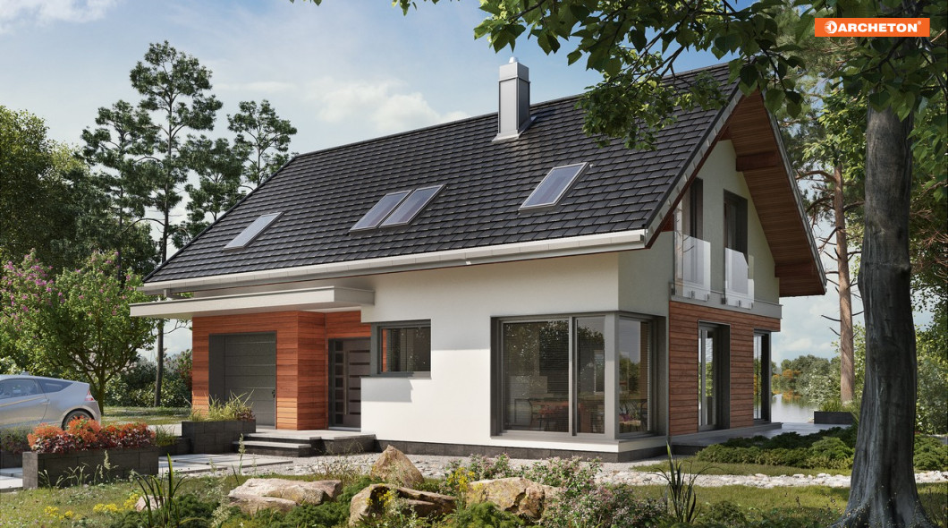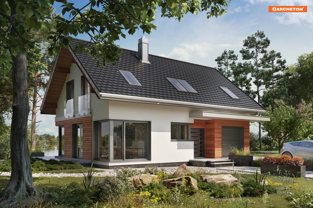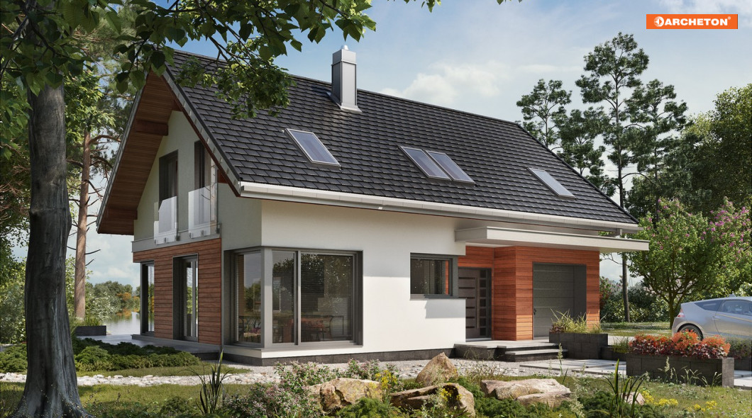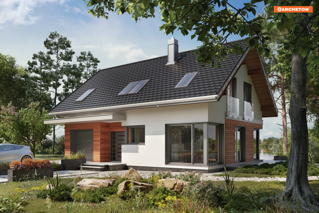 Projekty domów z użytkowym poddaszem i z wbudowanym garażem o powierzchni ok. 110m2 prezentują w naszej ofercie różne style i bryły architektoniczne. Wśród nich najprostsze sylwetki na planie prostokąta, bez balkonów mają Tola, Zojka Neo i Zefir. Wszystkie trzy koncepcje oferują na parterze otwarty pokój dzienny z kominkiem dostępny ze strefy komunikacyjnej, która łączy przez sień mieszkanie z częścią garażową. Projekt domu Zefir wyróżnia się najbardziej oszczędną konstrukcją dachu i narożnymi, nowoczesnymi oknami. Hol jest obszerny i ma sporo miejsca do przechowywania. Przewody kominowe udało się ekonomicznie zblokować w dwa trzony. Kominek znalazł się w centrum rzutu (ułatwiając ew. dystrybucję gorącego powietrza) i zaznacza podział jednoprzestrzennego parteru na kuchnię, jadalnię i salon. Projekt domu Zefir to rozwiązanie z dużą kotłownią na tyłach garażu (jak Tola) i z wygodną łazienką na parterze (jak Zojka Neo). Cztery sypialnie zajmują jednopoziomowe (w przeciwieństwie do Zojki) poddasze. Jasne wnętrza są ustawne i łatwe do funkcjonalnej aranżacji.